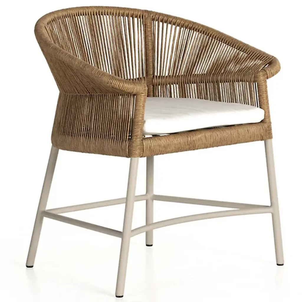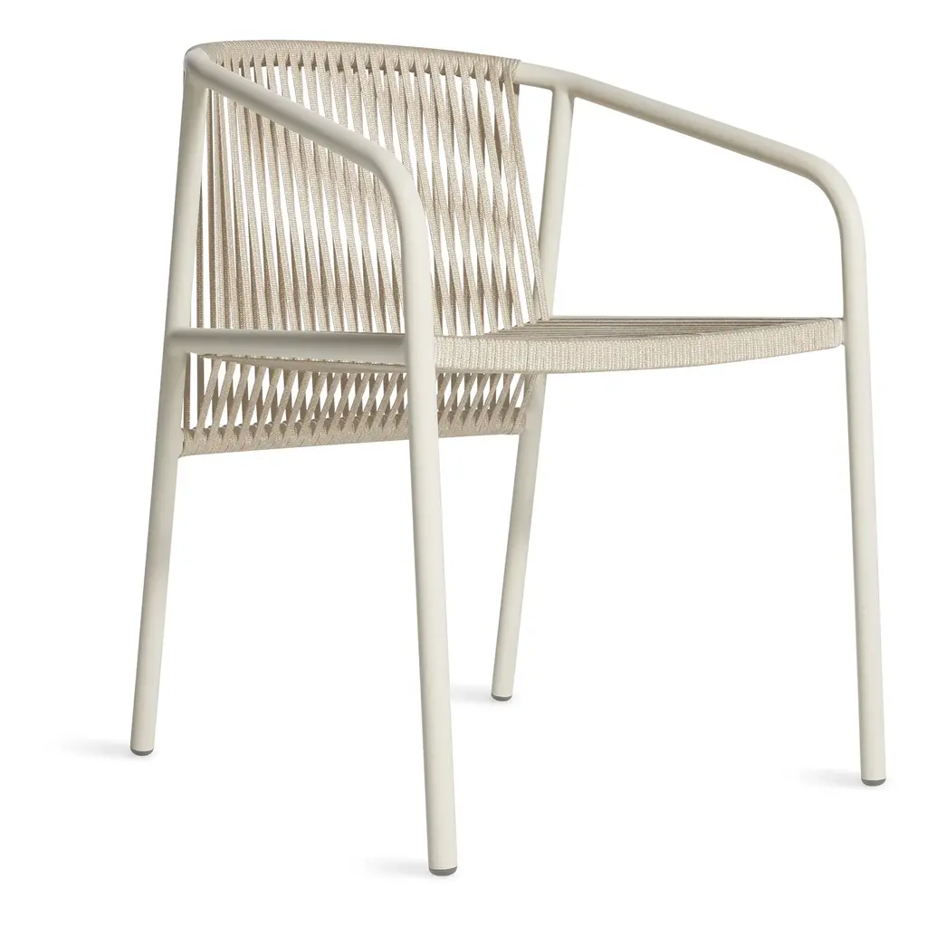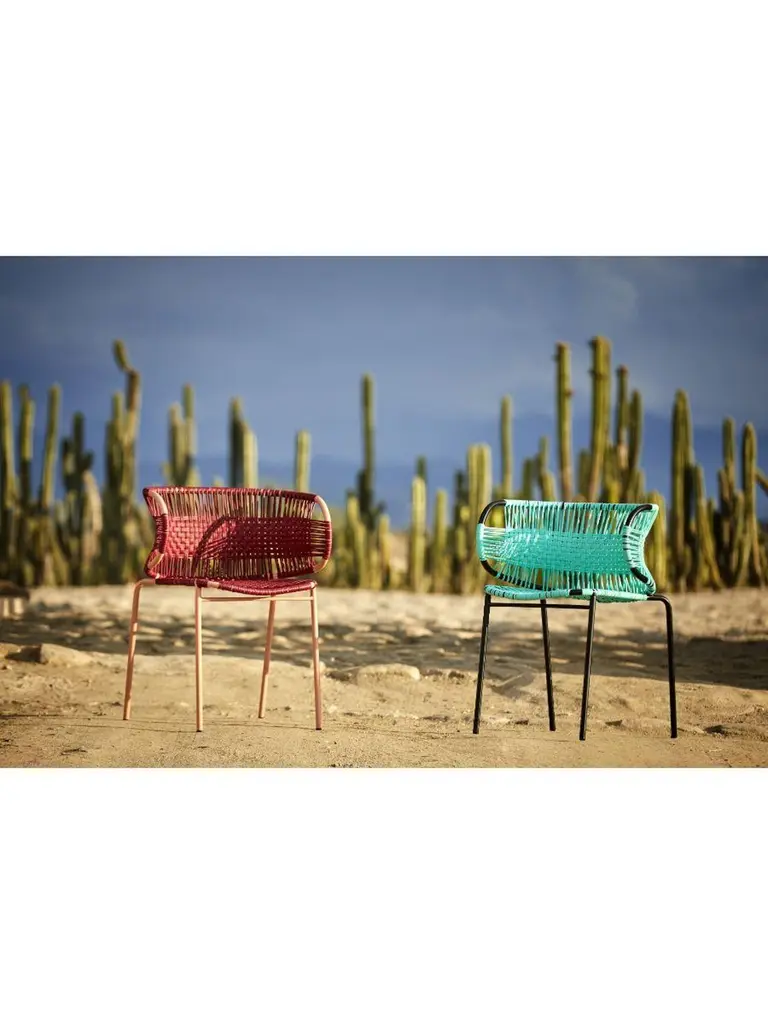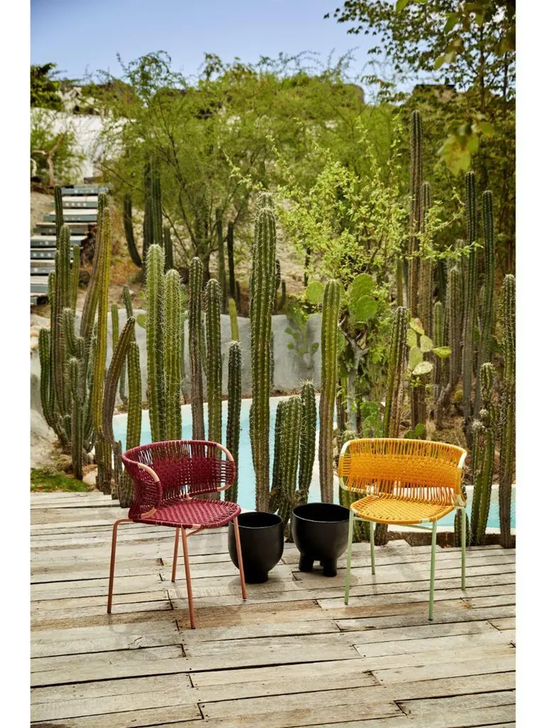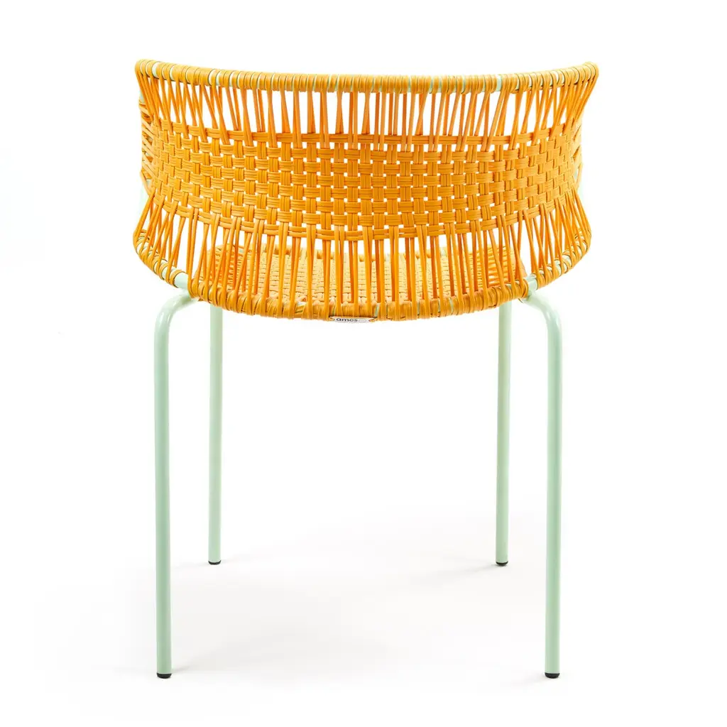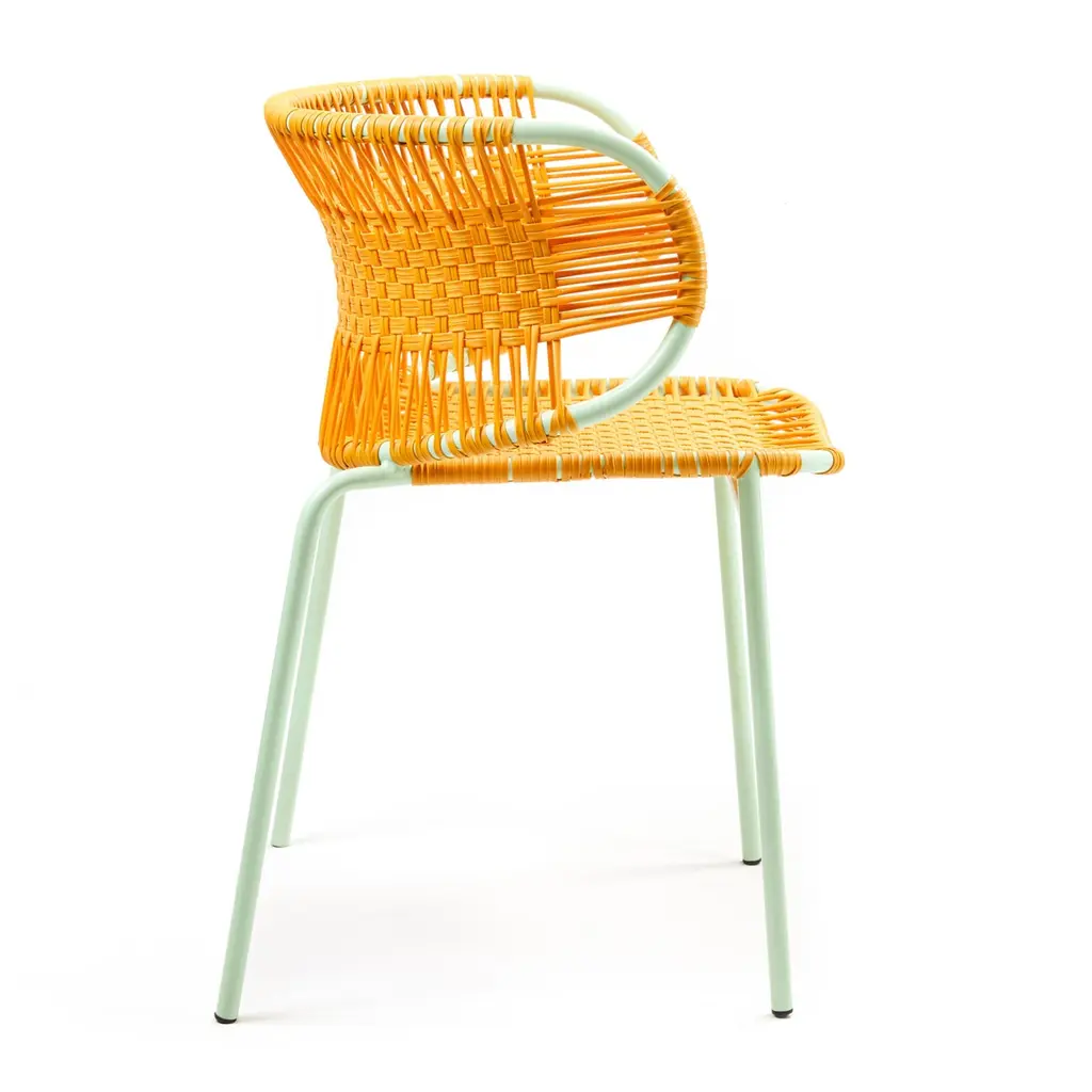 Honey Cielo stacking chair with armrest by Sebastian HerknerMaterials: Galvanized and powder-coated tubular steel. PVC strings are made from recycled plastic.Technique: Made from recycled plastic and weaved by local craftspeople in Cartagena, Colombia. Dimensions: W 60 x D 51.4 x H 78 cm Also available colors: brown, mint/ black, black-black, olive/ menta, purple/ carne , honey/ menta.The Cielo Stacking Armchair is a light, versatile and comfortable design by Sebastian Herkner. It’s ready for indoor and outdoor use and a great choice to create inspired seating arrangements on a terrace or in the living room. Available in various color combinations, the stackable chair can also add personality to dining areas of restaurants or hotels. Like the daybed and lounge chairs of the collection, the colors and look are inspired by Sebastian’s visits to Colombia. There, he not only immersed himself in the culture and beauty of the country but also met the local Ames artisans and learned about their traditional weaving techniques.Each armchair is made in Santa Marta, a city on the Caribbean coast of Colombia, by local craftspeople. They weave the PVC strings, which are made from recycled plastic, around a powder-coated tubular steel frame. The weaving technique the artesanos and artesanas use are called Momposino, a traditional method known for intricate patterns. Just the preparation of all the materials takes ten days, while the production of each armchair takes three days.German designer Sebastian Herkner is a long-term collaborator of Ames and has visited Colombia multiple times to experience the country’s cities, nature and people first hand. He also visited many of the ateliers that Ames has partnered with to learn about the unique traditional crafts of Colombia's regions. A sought-after contemporary designer and recipient of many industry awards, he has worked with many international design brands, creating intriguing pieces that showcase his intuition for interesting material, color, and texture combinations.