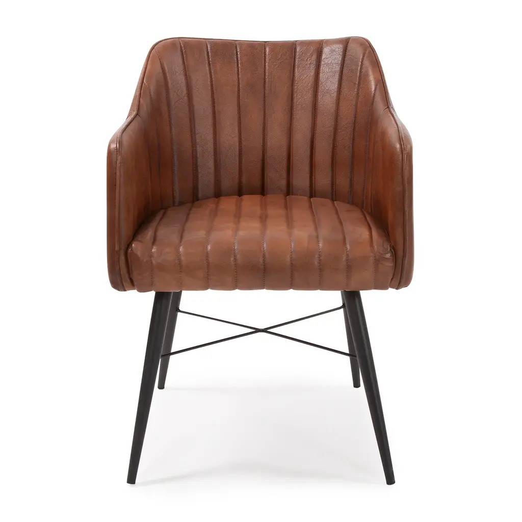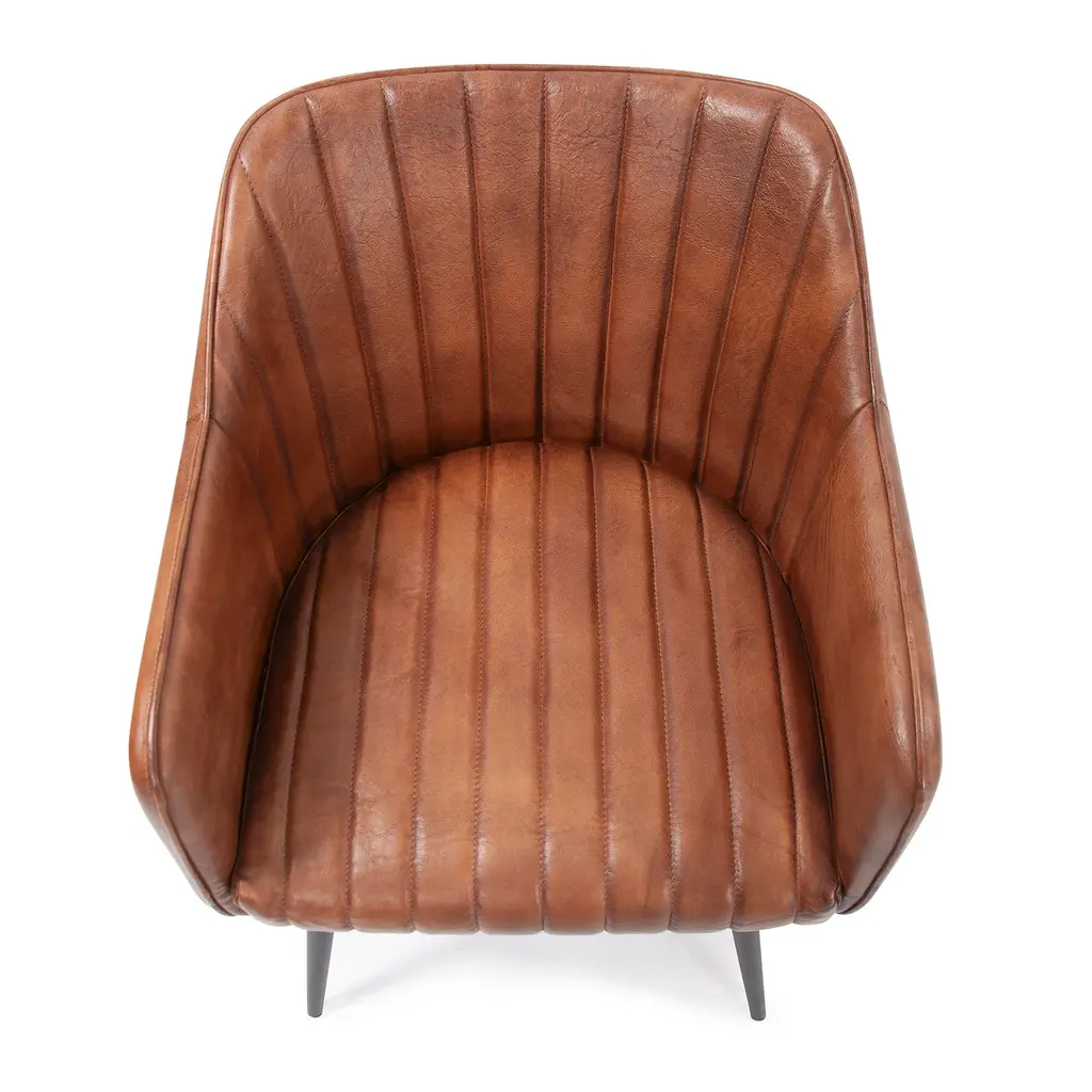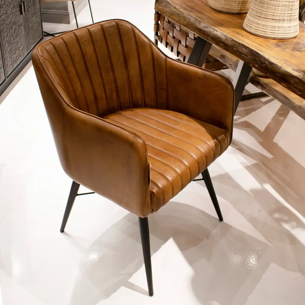 The Houston Leather Chair Our Houston Leather Chair is an example of classic design. The retro feel of this chair is seen in the shape of the legs and the shape of the chair itself. Buffalo leather features channeled top stitching and is set on black iron legs. This chair would work great as a desk chair or an occasional chair in your study or living room! Dimensions: 21.1/4" W x 27" D x 30.1/4" High Seat Height: 19" High Finish: Brown Buffalo Leather on Black Frame Materials: Steel & Leather Assembly Required: yes, apply legs. There is a set of 4 chairs here on our shop with a reduced rate for buying 4. Designer floor samples & new product from one of the hottest To The Trade & Retail Home Furnishings showrooms in the country. Located in Chicago's chic Roscoe Village, Kenneth Ludwig Chicago carries the industries best furniture & accessory brands. Always fresh, always inspiring. Quite often ( due to a discontinued style, fabric or frame ) they must sell off their showroom floor samples. You receive first quality pieces at amazing prices. Check back weekly for new inventory added.