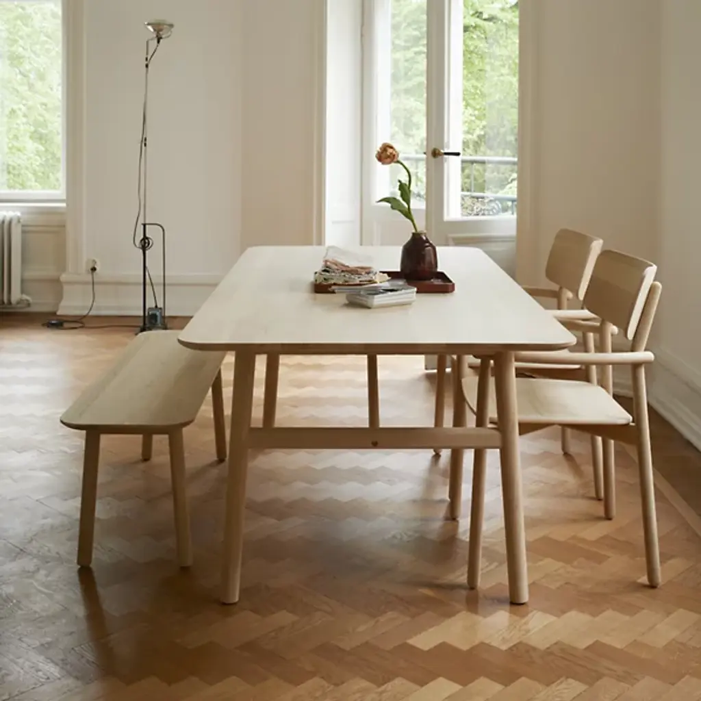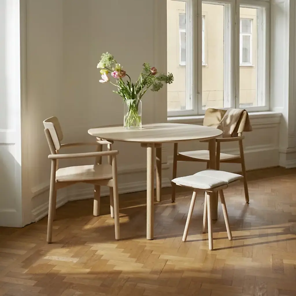 The Hven Armchair from Fritz Hansen, designed by contemporary Swedish designer Anton Björsing, features inviting, minimalist furniture with a natural Nordic charm. Named after the Swedish island between Denmark and Sweden, this collection blends seamlessly with other decor. The Hven Armchair, crafted from 100% FSC-certified oak, offers comfort and elegance. Its light, airy design is accentuated by subtle details like overlapping poles, rounded corners, and a gracefully curved shape, making it a perfect addition to any dining space for creating memorable moments.