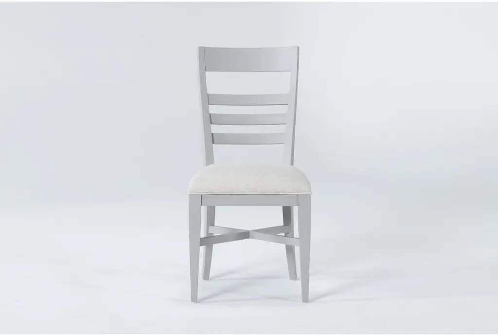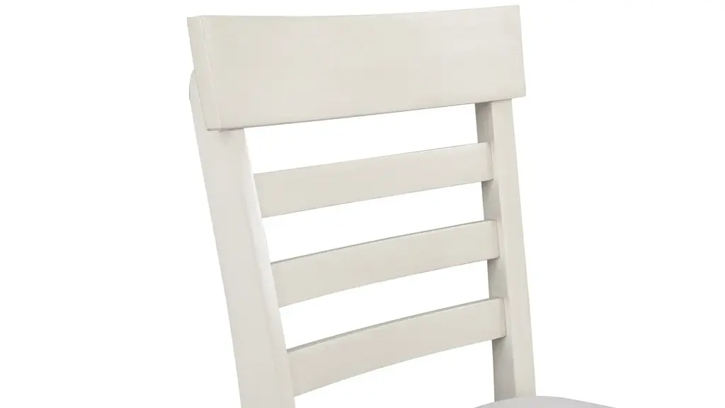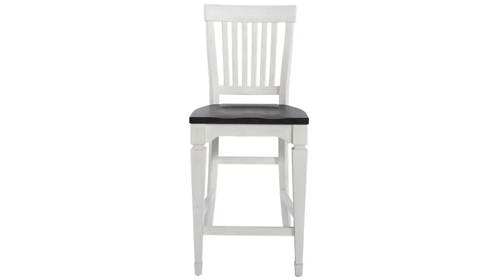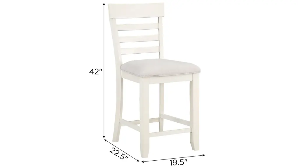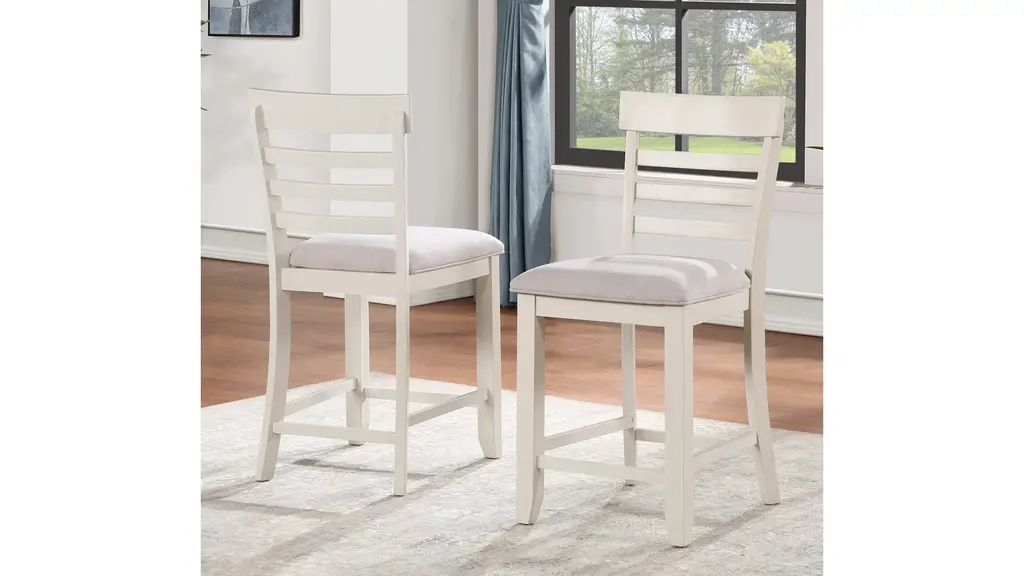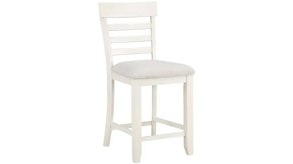 Hyland Counter Chair - Set of 2 that sports a crisp white finish and cream-colored fabric seat for a fresh, comfortable addition to any kitchen or dining area. The horizontal slat back design features a shaped top rail for a relaxed transitional appeal for modern, farmhouse or coastal environments. Stretchers add structural support and a place to rest your feet when seated at the Hyland Counter Table or a Counter Bar.