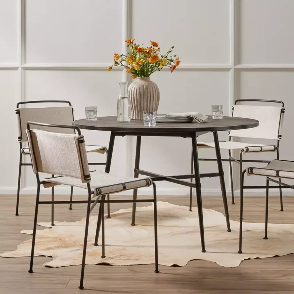 Lunch, cocktails, action: This dining chair puts an elevated twist on a classic director's seat. It's constructed with a sleek iron frame in a luminous finish, and the seat and back feature a sling design we love. Best of all, a dark hue and minimal silhouette let this versatile side chair work anywhere – from your office to your dining room and beyond. Plus, it arrives fully assembled, so you can skip straight to the fun part (aka styling your space).