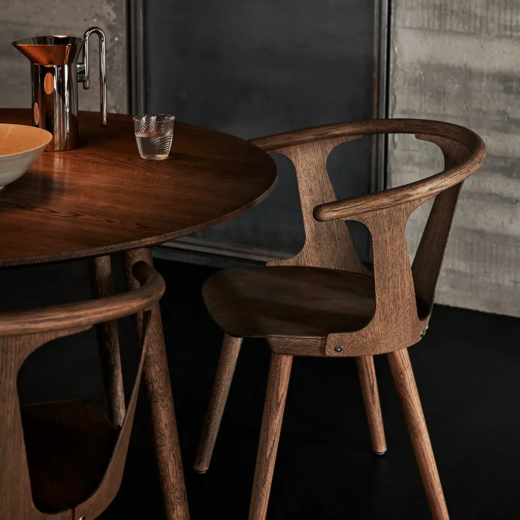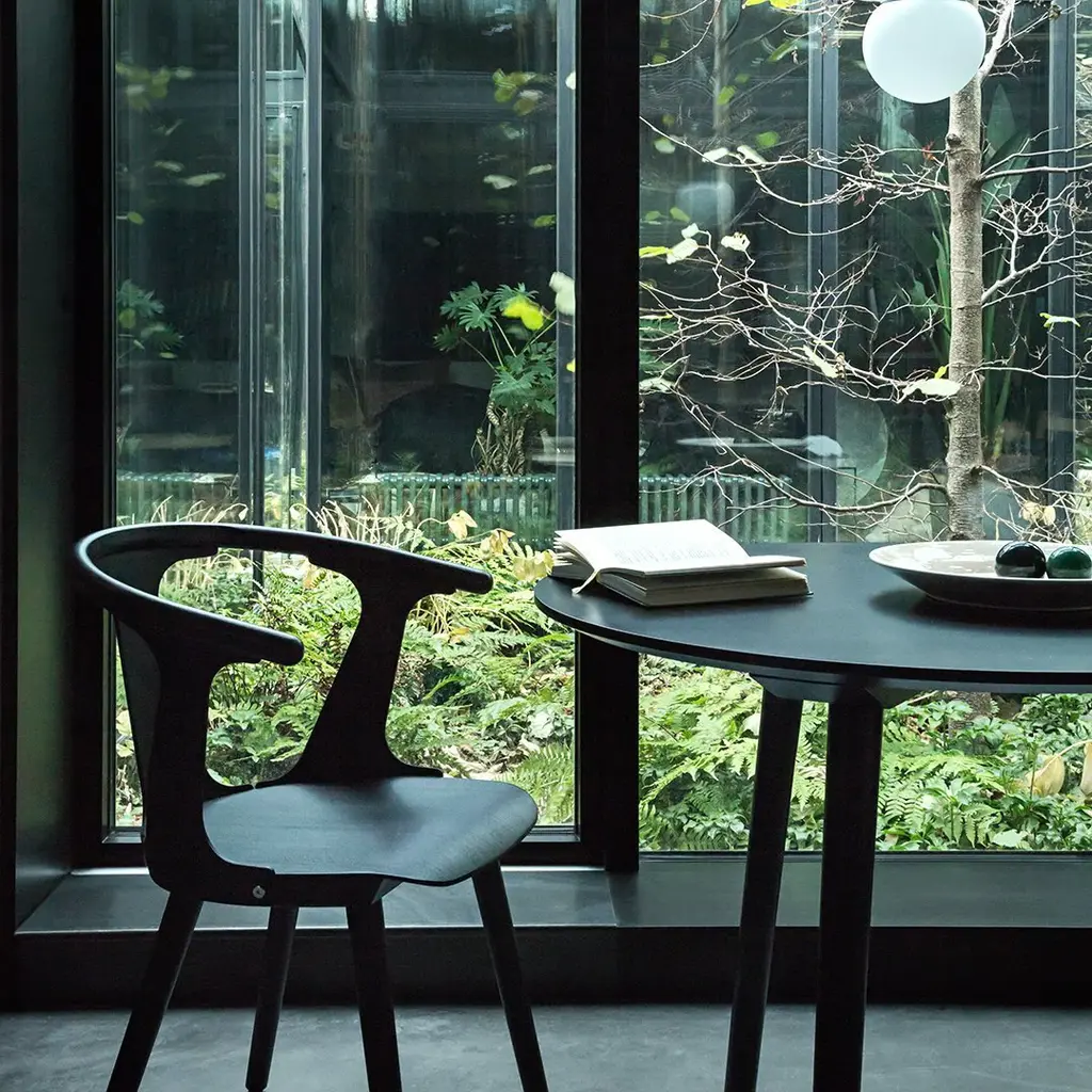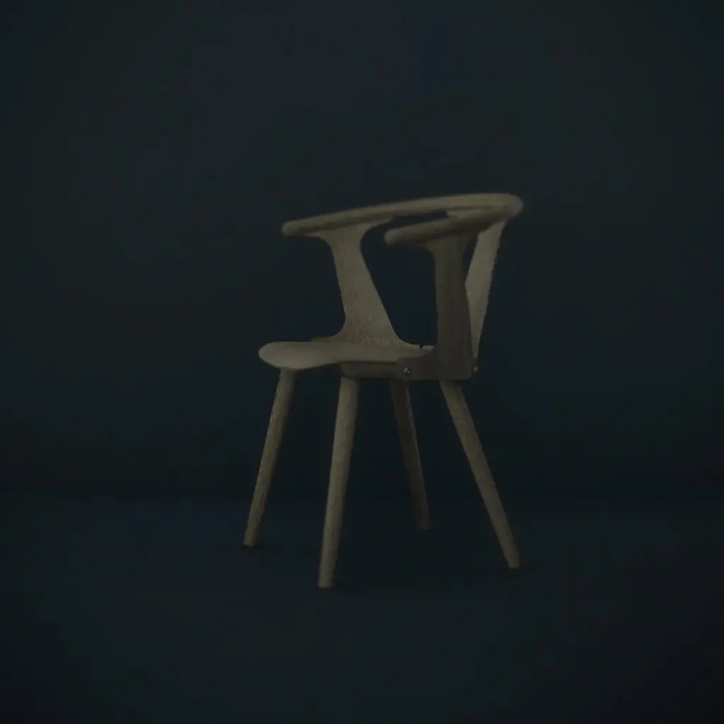 The interplay between positive and negative space is central to In Between, Sami Kallio's new chair for &Tradition. Its back and side panels provide a concrete shape and support, but forms are created equally by the gaps in between them