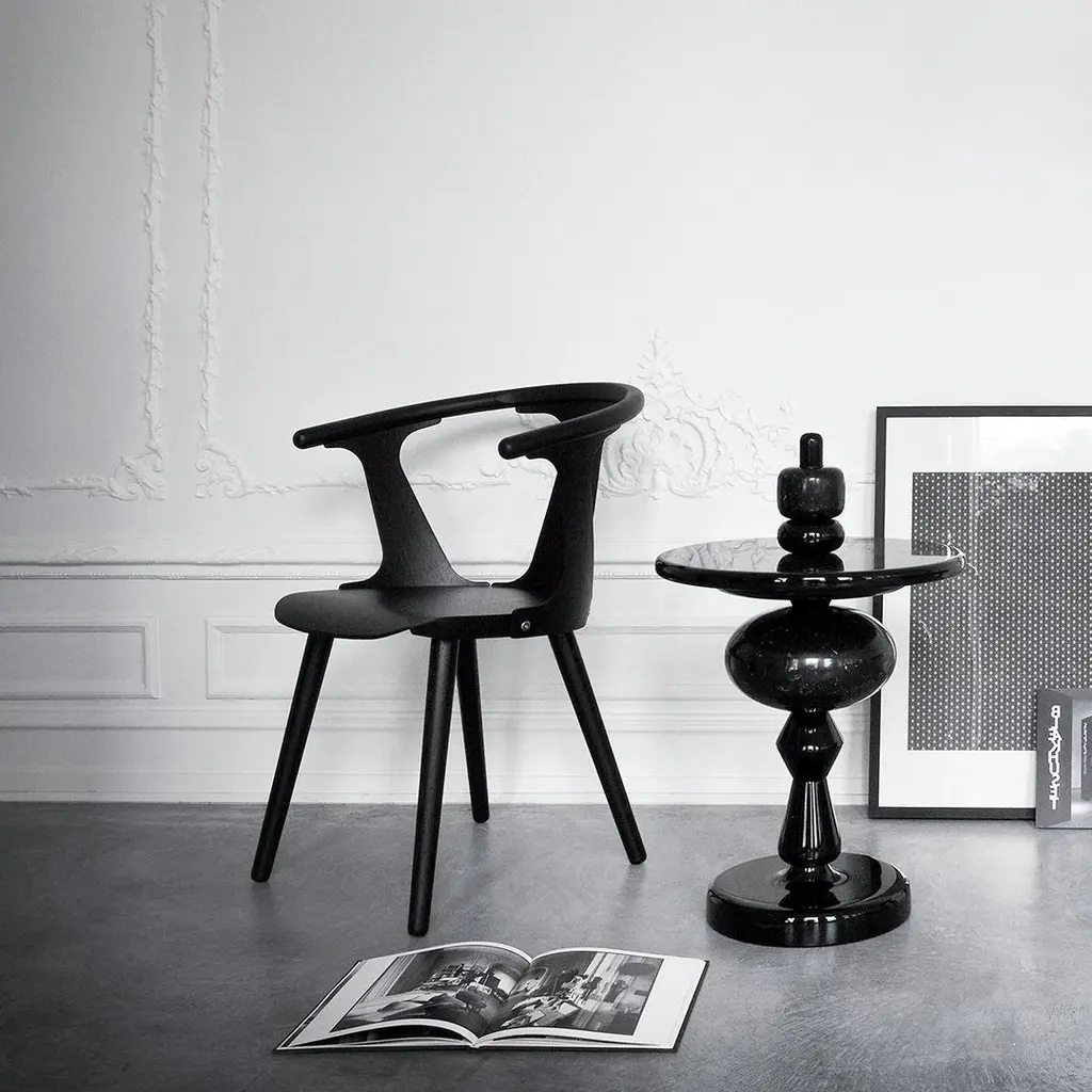 The interplay between positive and negative space is central to In Between, Sami Kallio's new chair for &Tradition. Its back and side panels provide a concrete shape and support, but forms are created equally by the gaps in between them