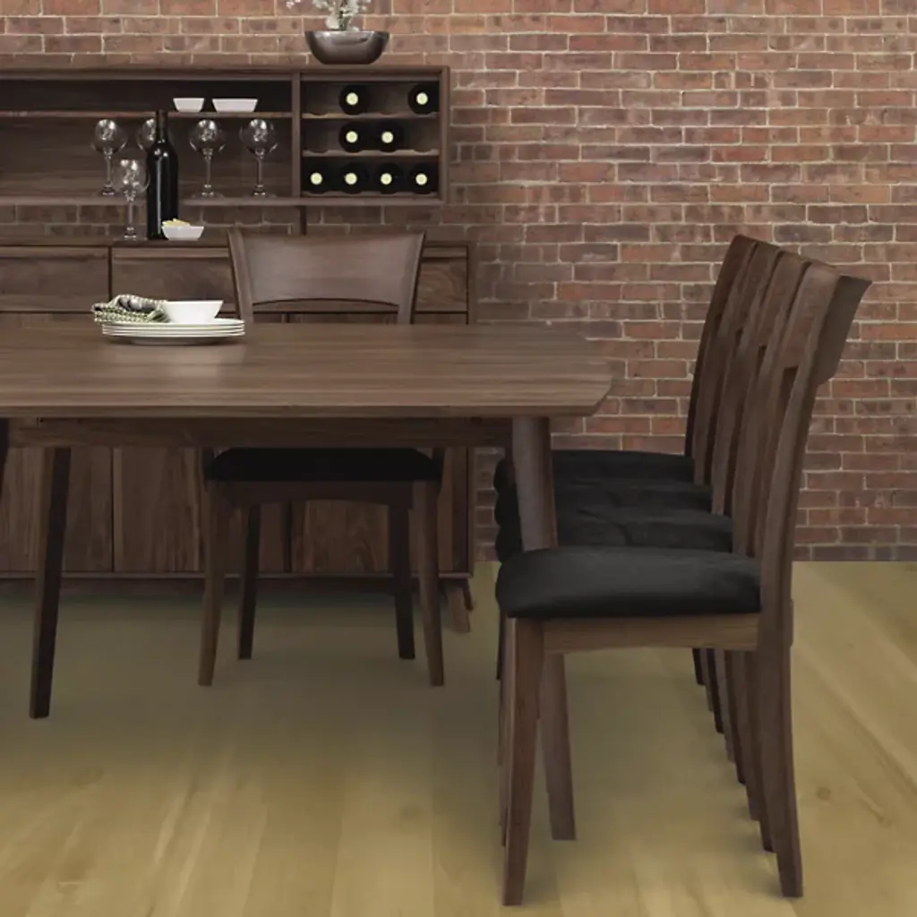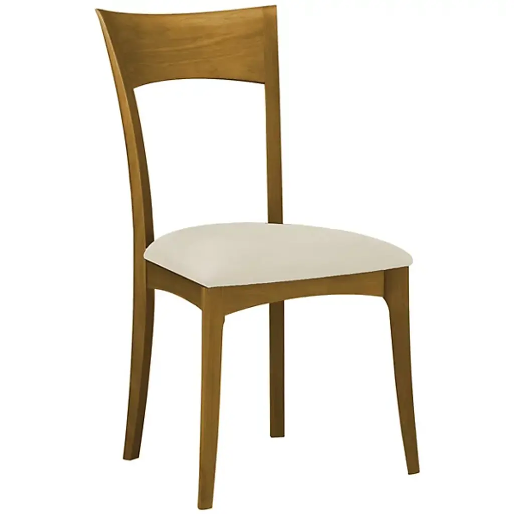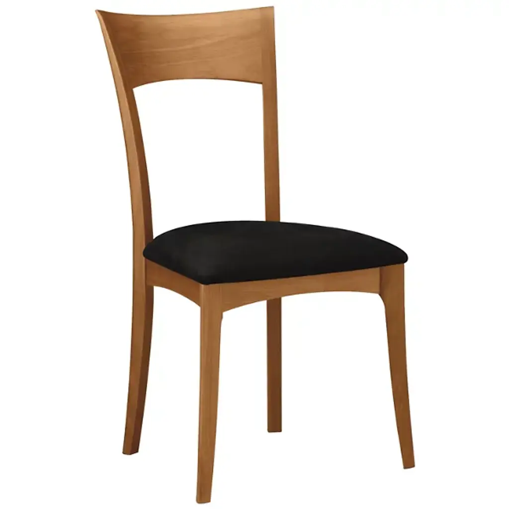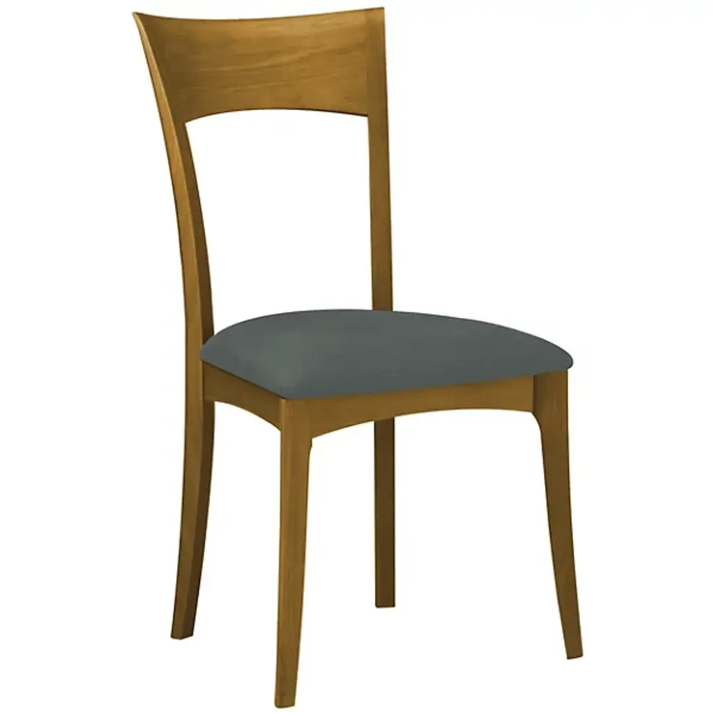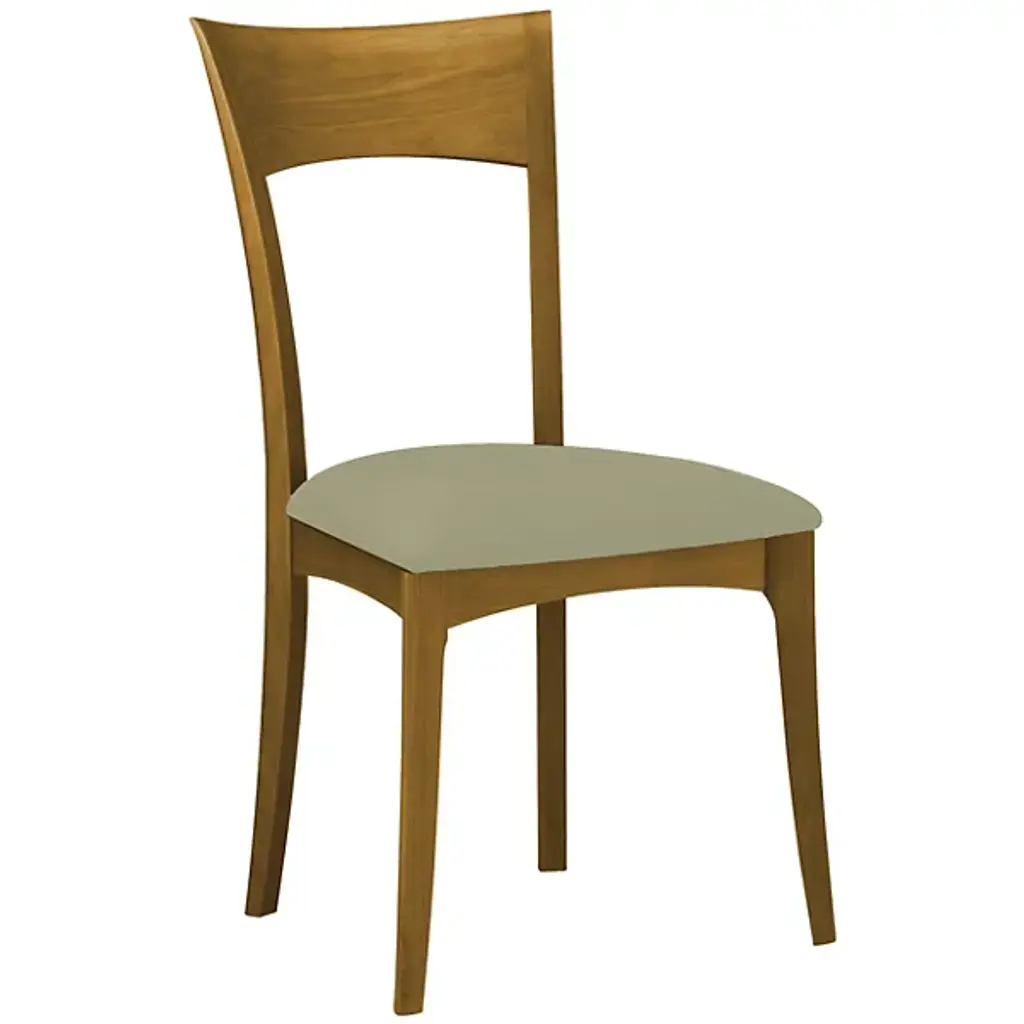 The Copeland Furniture Ingrid Chair is a welcome and comfortable addition around any dining table. It features an open, gently curving frame made out of solid American black walnut or cherry hardwood. The overall look--and feel--of the chair is softened even further by the leather or microsuede upholstered seat.