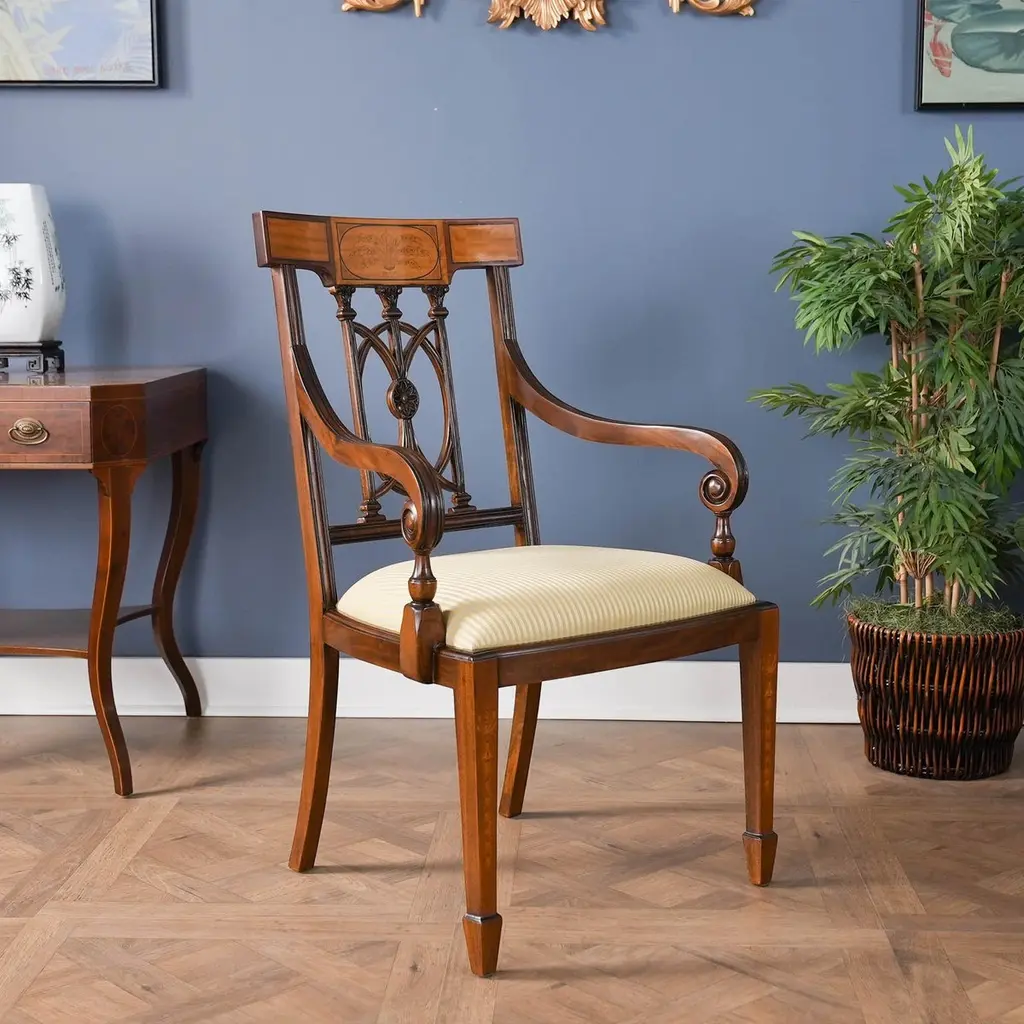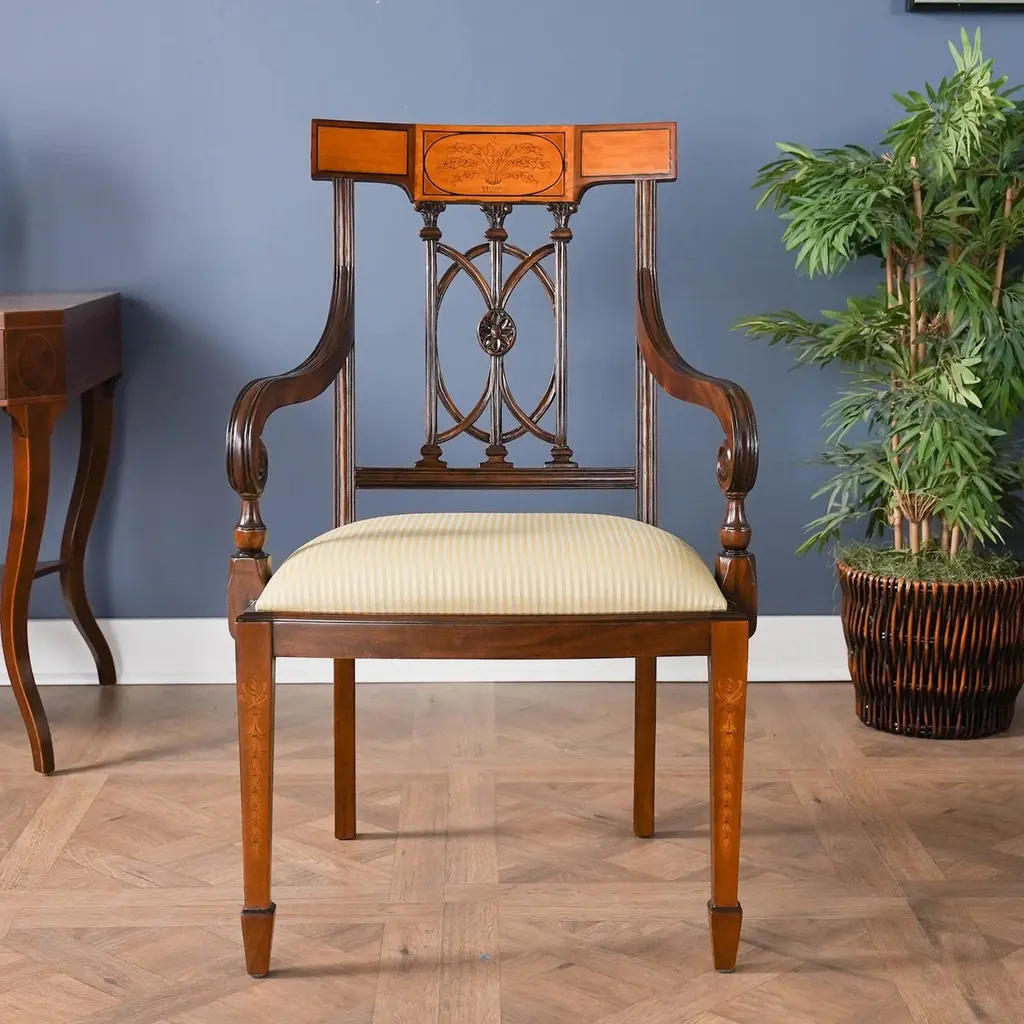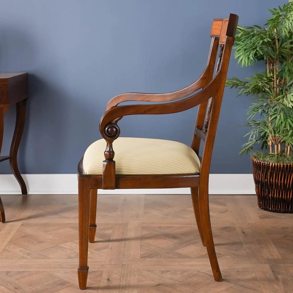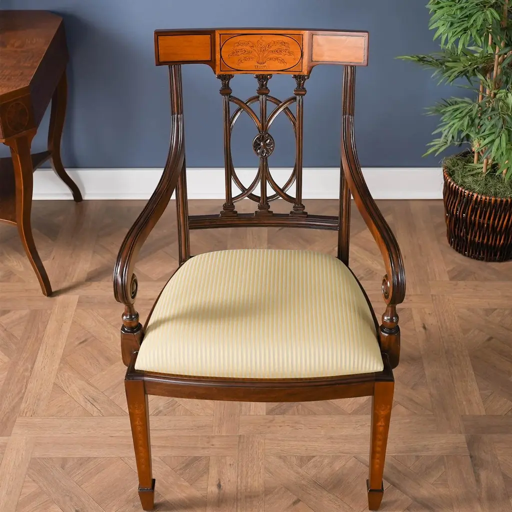 The Inlaid Hepplewhite Chairs, consisting of a set of ten chairs with 2 arm chairs and 8 side chairs. Each chair is decorated with hand inlaid panels across the crest rail, bellflower inlays along the front legs making these dining chairs an exercise in pure elegance. Great quality construction with details hand carved in a solid mahogany, back splat. The scrolled and turned arms descend from the side rails for comfortable support while seated. The bowed chair seat frame allows for the upholstery to be easily changed and the square, tapering legs end in spade feet similar to the original designs created by George Hepplewhite.Arm Height approximately 27 inches and seat height approximately 19 inches.Arm Chairs measure 24W x 24D x 39H.Side Chairs measure 21W x 22D x 39H.Set consists of 2 Arm and 8 Side Chairs.
