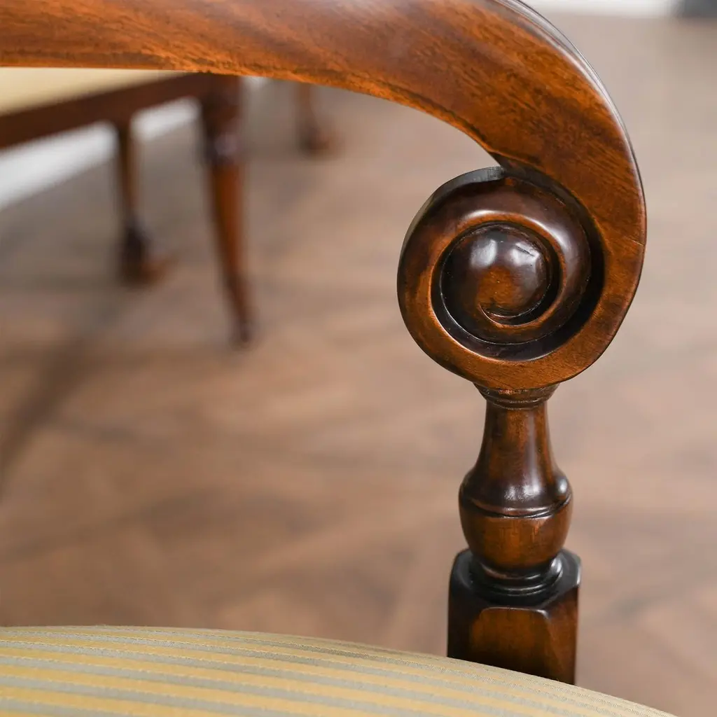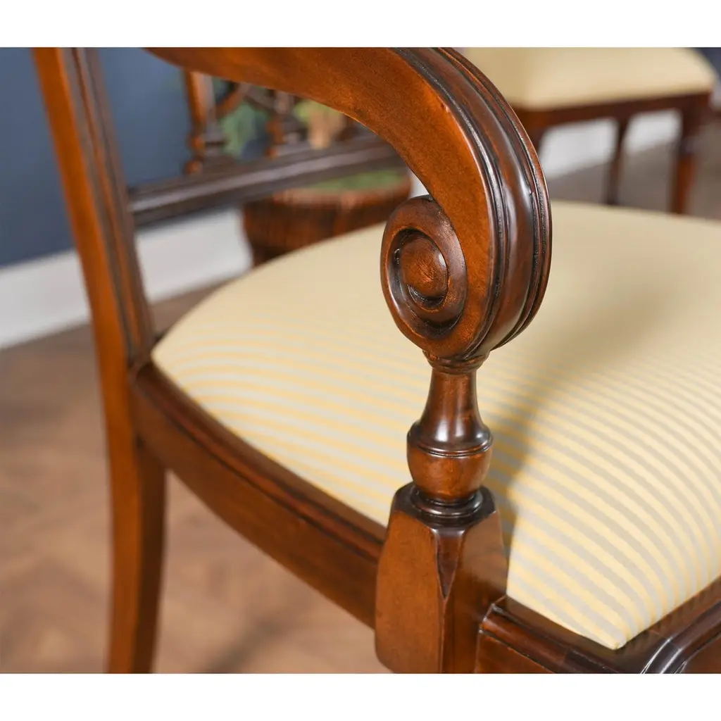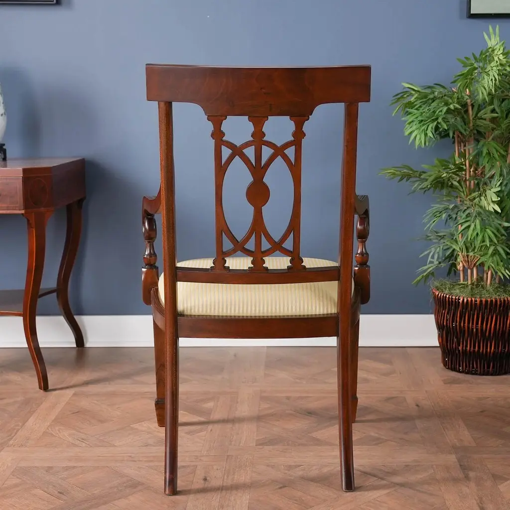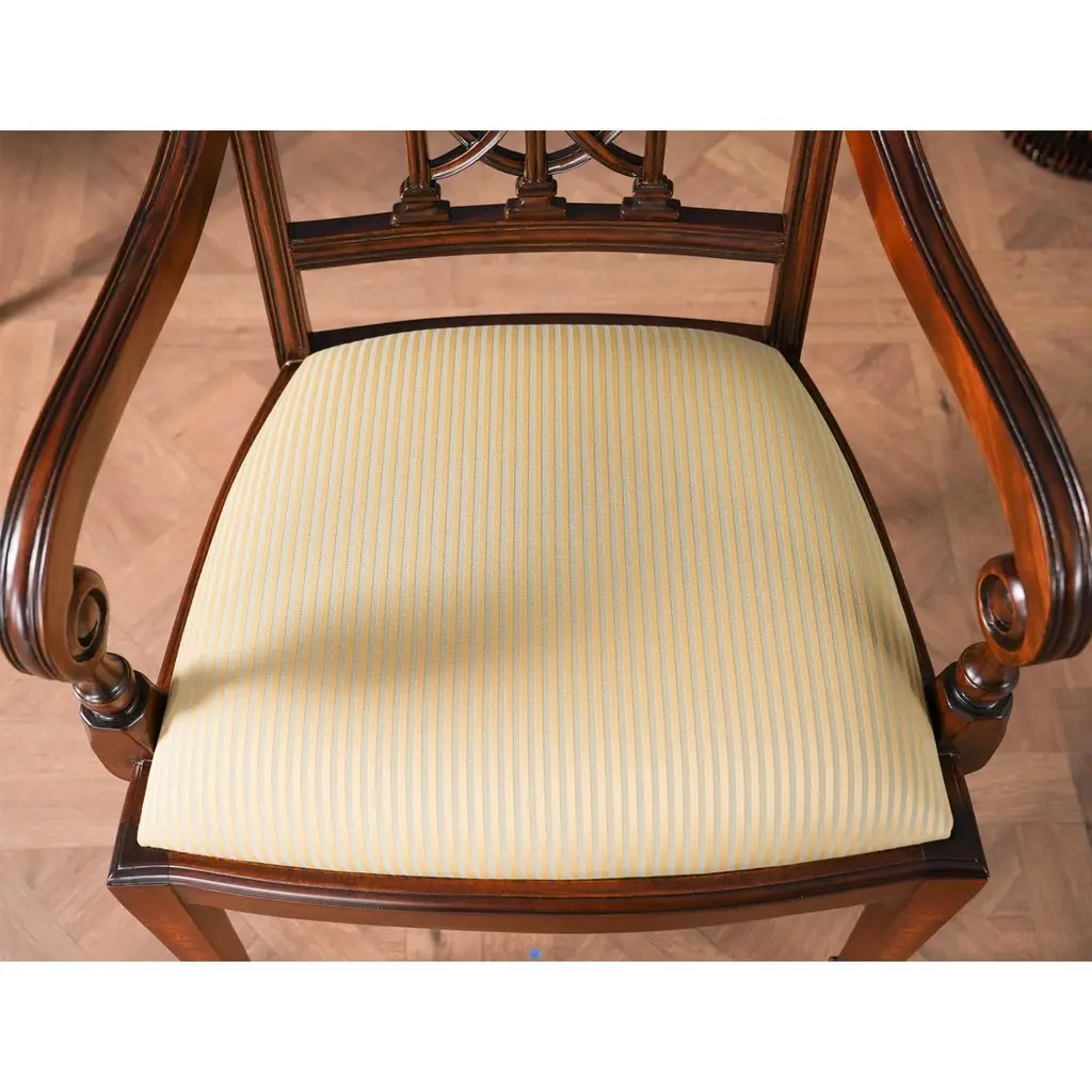 The Inlaid Hepplewhite Chairs, consisting of a set of ten chairs with 2 arm chairs and 8 side chairs. Each chair is decorated with hand inlaid panels across the crest rail, bellflower inlays along the front legs making these dining chairs an exercise in pure elegance. Great quality construction with details hand carved in a solid mahogany, back splat. The scrolled and turned arms descend from the side rails for comfortable support while seated. The bowed chair seat frame allows for the upholstery to be easily changed and the square, tapering legs end in spade feet similar to the original designs created by George Hepplewhite.Arm Height approximately 27 inches and seat height approximately 19 inches.Arm Chairs measure 24W x 24D x 39H.Side Chairs measure 21W x 22D x 39H.Set consists of 2 Arm and 8 Side Chairs.
