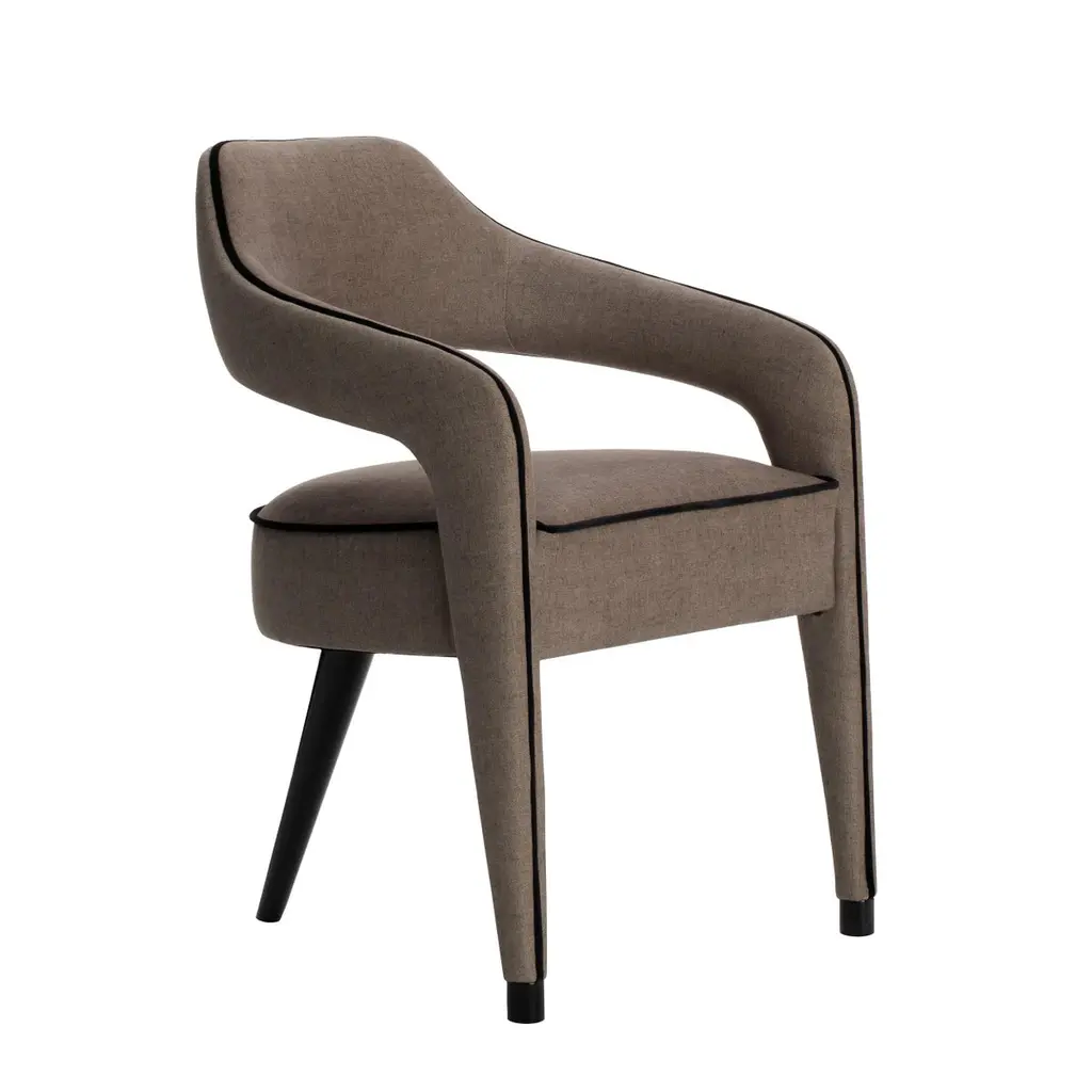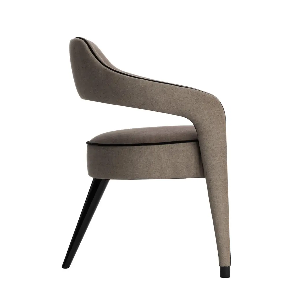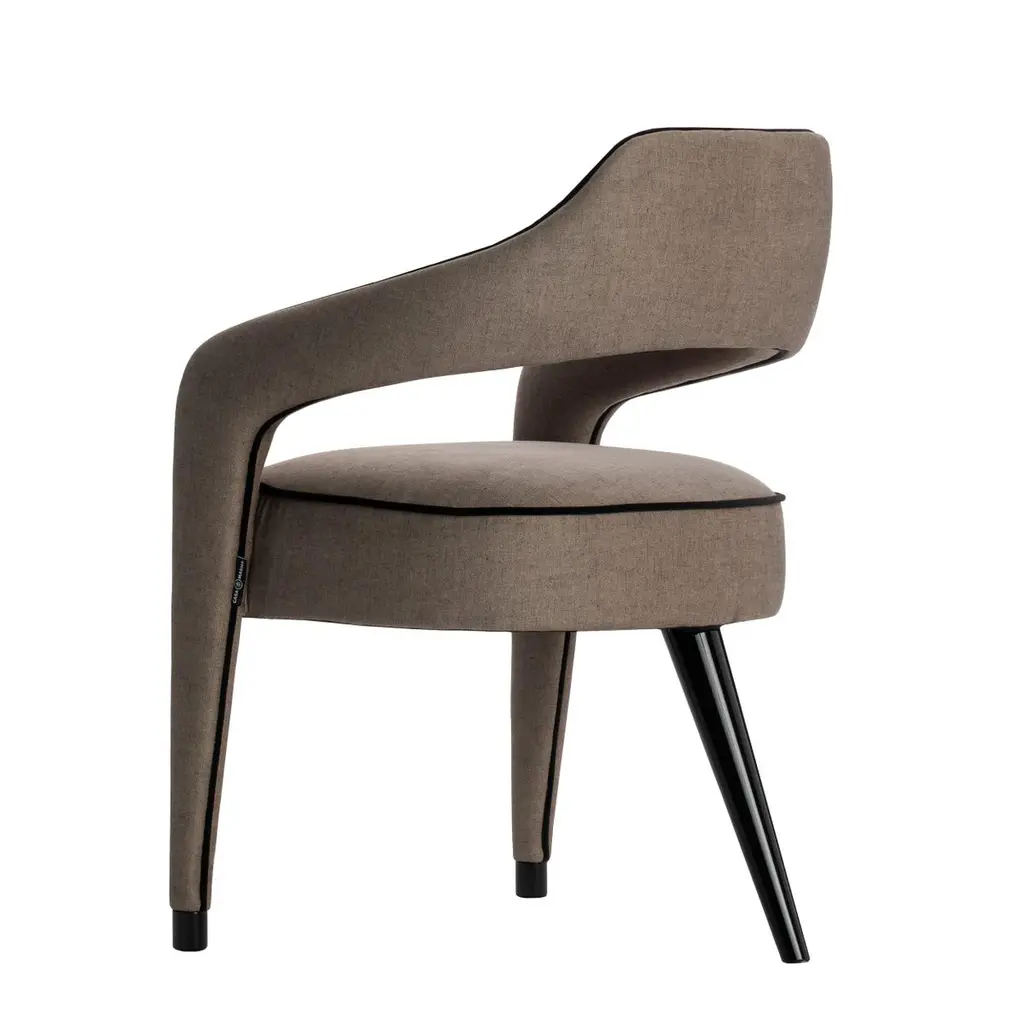 The INVICTA dining chair is a unique piece, and the impressive design with just one leg in the back, in solid wood, will make the dining room a sophisticated decor. Upholstered in fabric, with or without the contrasting piping that run from the front legs along the backrest and seat. Invicta is also available in natural leather, eco-leather or COM.Available in a wide range of fabrics from our catalog.Shown upholstered with Velvet Plus and mate lacquered rear leg and tips.