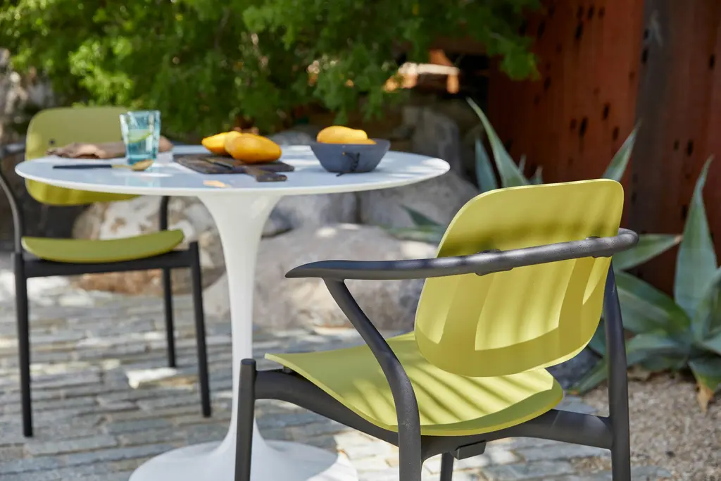 The chair design in Ini Archibong’s Iquo Café Collection features an elegant, curved silhouette and one continuous frame that’s both light and resilient. Ideal for indoor or outdoor dining.