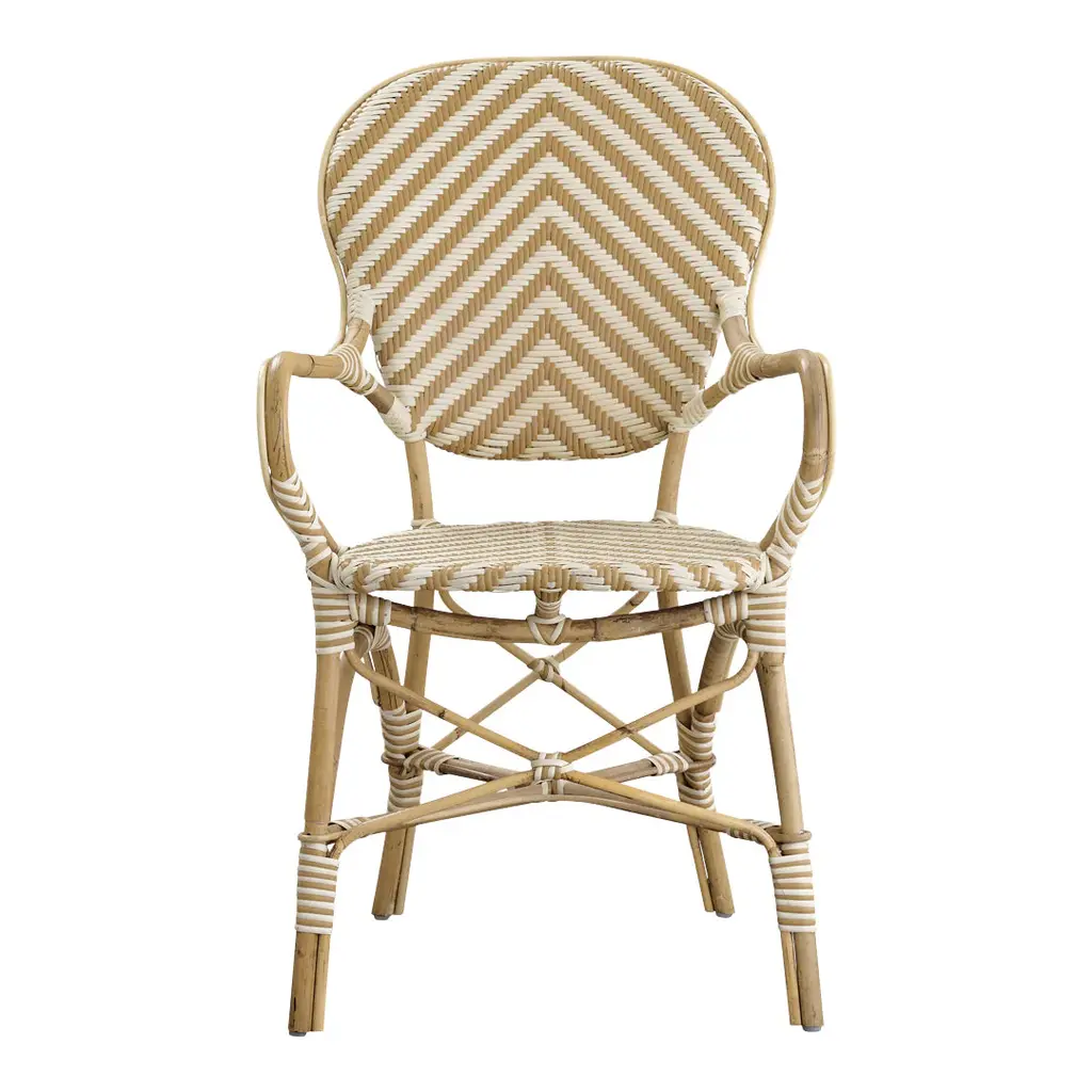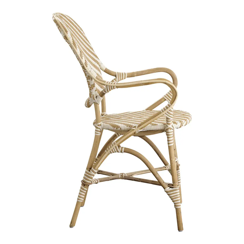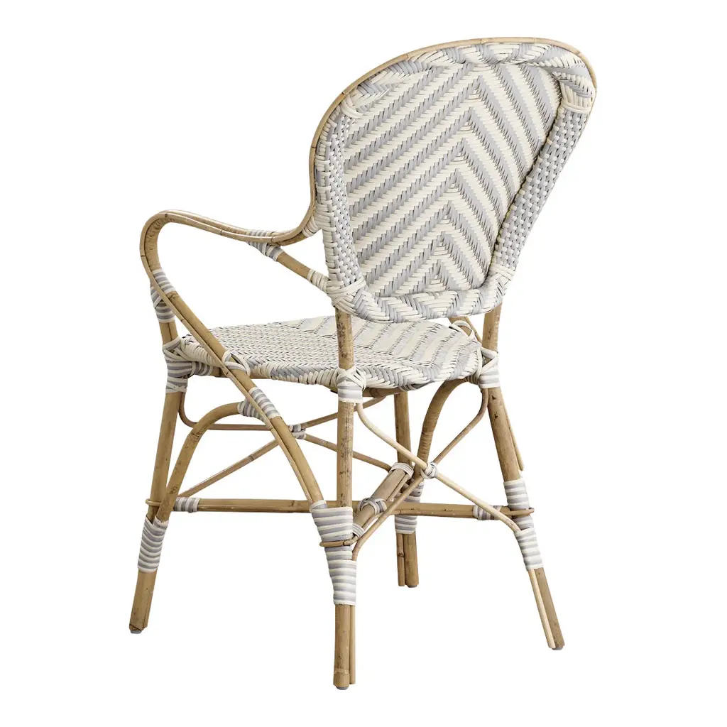 The Isabell Arm Chair is a modern update of a classic Paris bistro chair and can be found in upscale cafes, brasseries, bistros, and restaurants in historic European cities throughout the world. This bistro chair is hand made using the finest Malacca cane rattan, stainless hardware, and our exclusive ArtFibre that withstands the effects of inclement weather including rain, snow and sun. Each chair is meticulously handcrafted using the century-old method perfected by skilled Danish cane-makers in the 1970s. This technique creates signature organic marks by bending each piece of rattan into shape. These colorful chairs are stylish, comfortable, and durable enough for commercial use as well as private kitchens, patios, or gardens. Designed for indoor or covered outdoor use, the chair's rattan frame will patina to a lovely light gray finish over time. If the original natural rattan look is desired, rub with linseed oil.