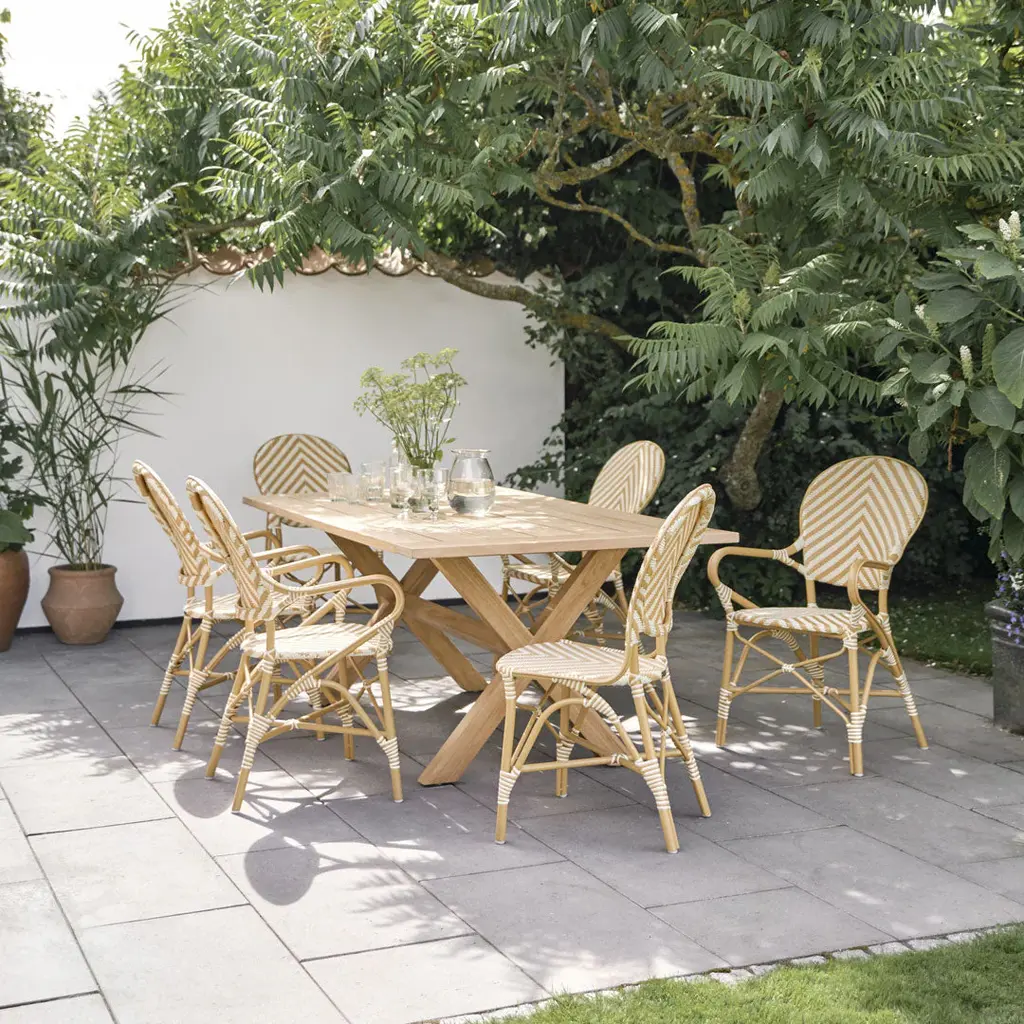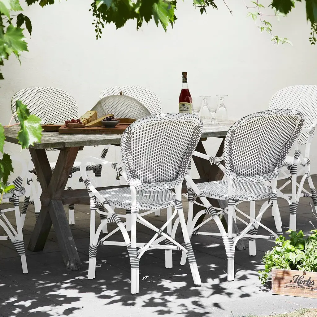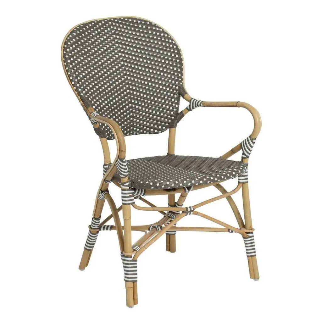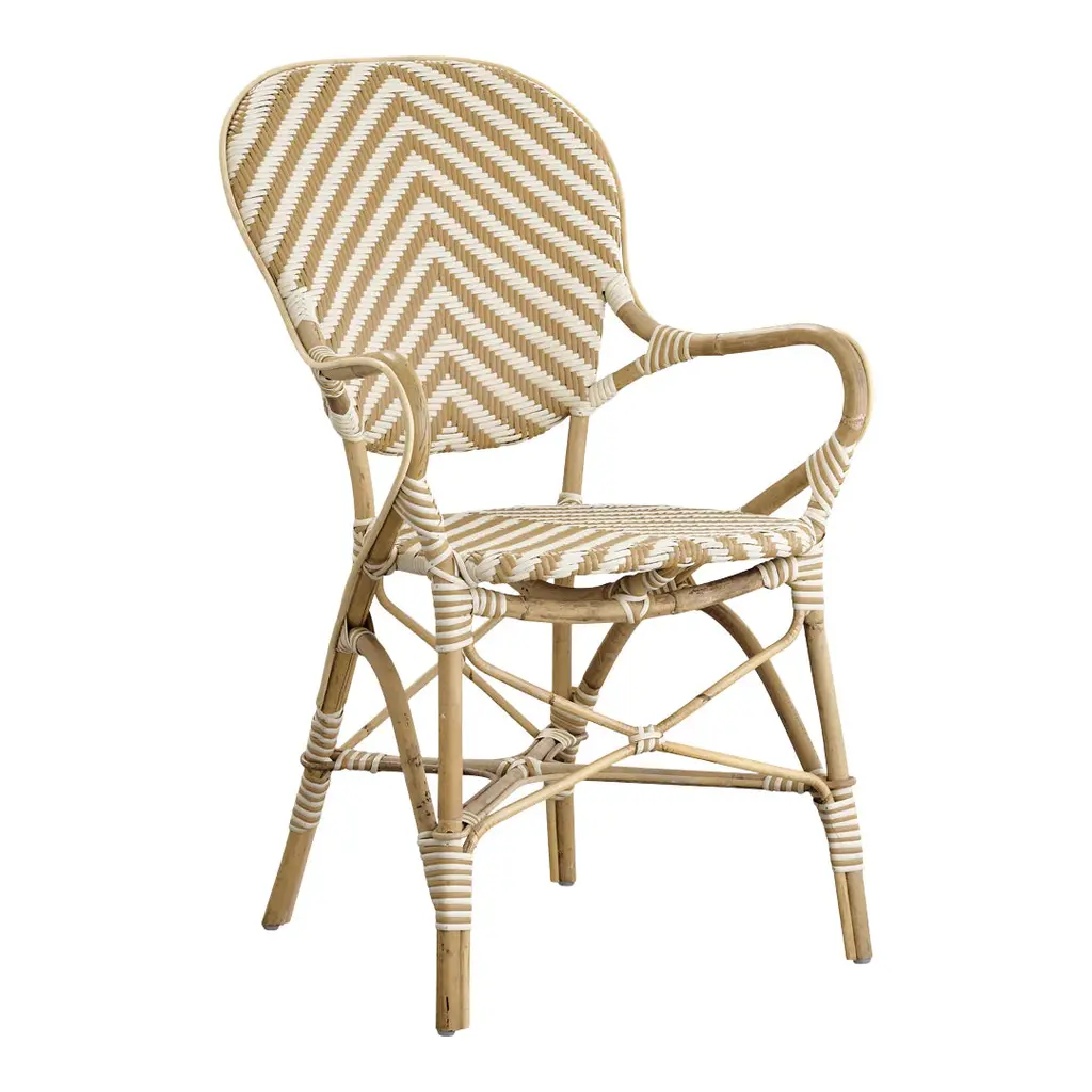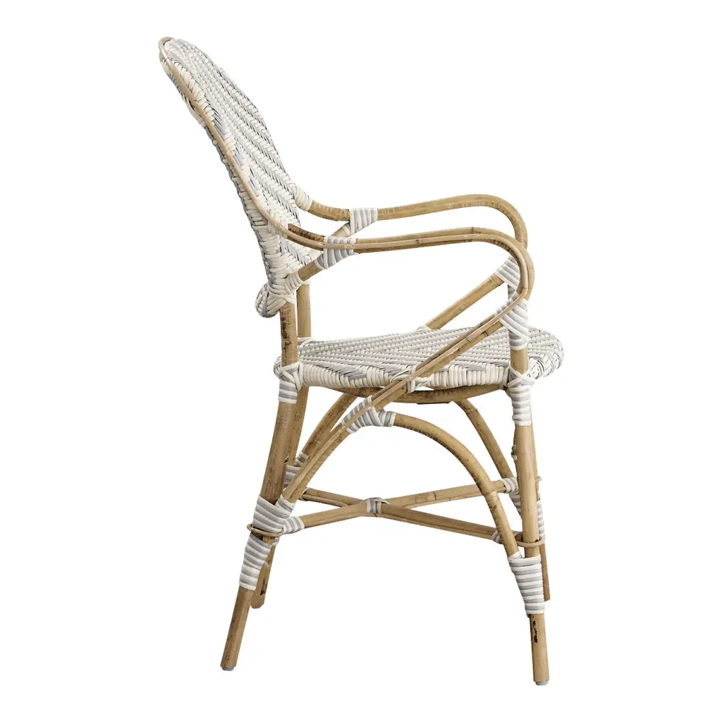 The Isabell Arm Chair is a modern update of a classic Paris bistro chair and can be found in upscale cafes, brasseries, bistros, and restaurants in historic European cities throughout the world. This bistro chair is hand made using the finest Malacca cane rattan, stainless hardware, and our exclusive ArtFibre that withstands the effects of inclement weather including rain, snow and sun. Each chair is meticulously handcrafted using the century-old method perfected by skilled Danish cane-makers in the 1970s. This technique creates signature organic marks by bending each piece of rattan into shape. These colorful chairs are stylish, comfortable, and durable enough for commercial use as well as private kitchens, patios, or gardens. Designed for indoor or covered outdoor use, the chair's rattan frame will patina to a lovely light gray finish over time. If the original natural rattan look is desired, rub with linseed oil.