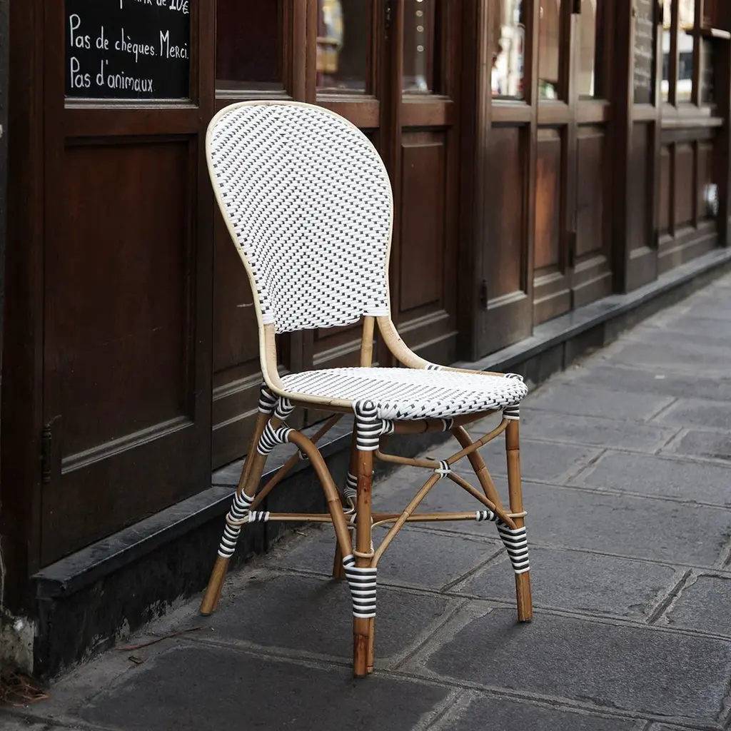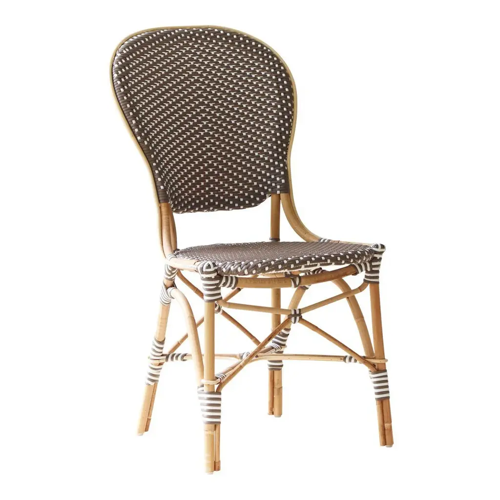 The Isabell Side Chair is a modern update of a classic Paris bistro chair and can be found in upscale cafes, brasseries, bistros, and restaurants in historical European cities throughout the world. This side chair is hand made using the finest Malacca cane rattan, stainless hardware, and our exclusive ArtFibre that withstands the effects of inclement weather including rain, snow and sun. Each chair is meticulously handcrafted using the century-old method perfected by skilled Danish cane-makers in the 1970s. This technique creates signature organic marks by bending each piece of rattan into shape. These colorful chairs are stylish, comfortable, and durable enough for use in restaurants as well as private kitchens, patios, or gardens. Designed for indoor or covered outdoor use, the chair's rattan frame will patina to a lovely light gray finish over time. If the original natural rattan look is desired, rub with linseed oil.