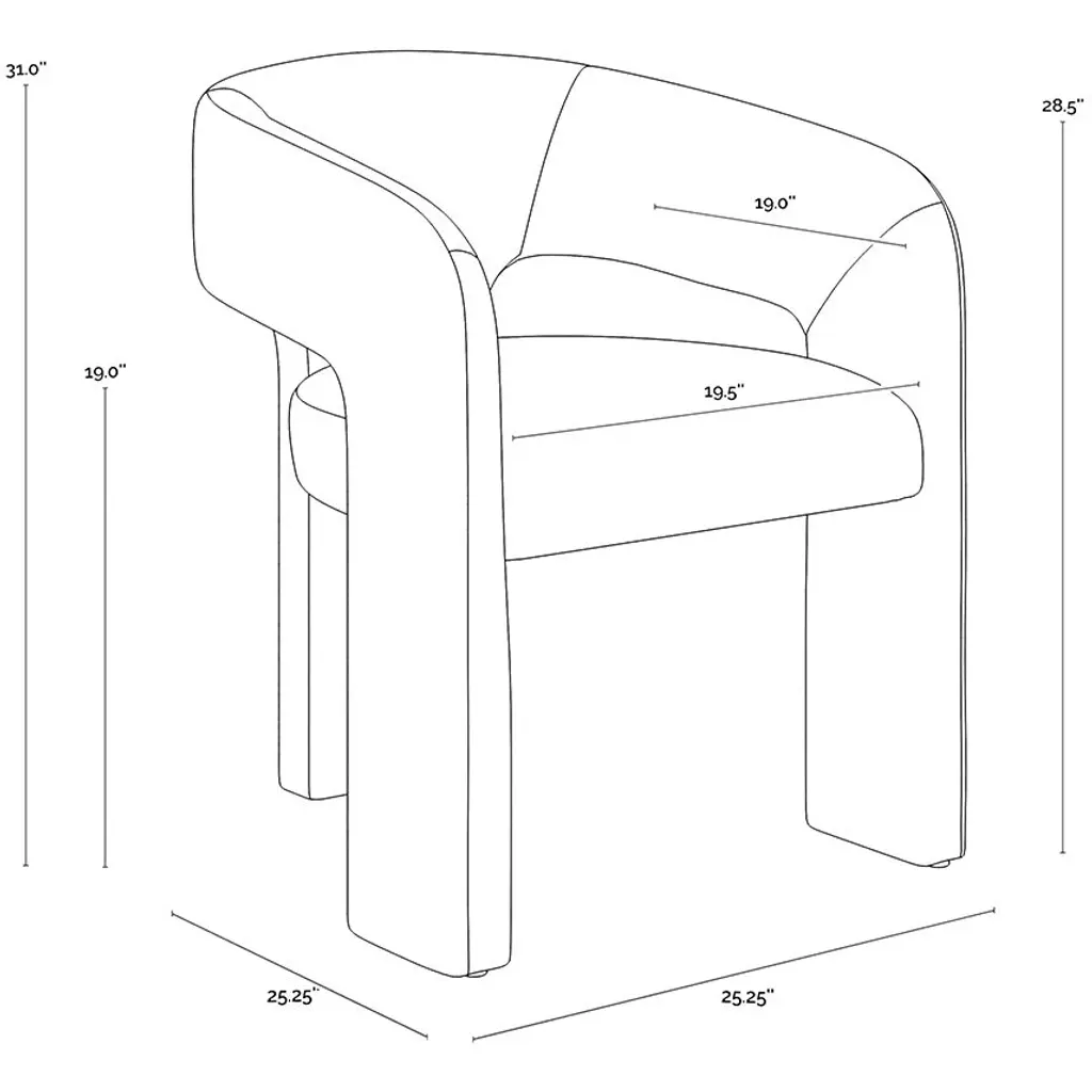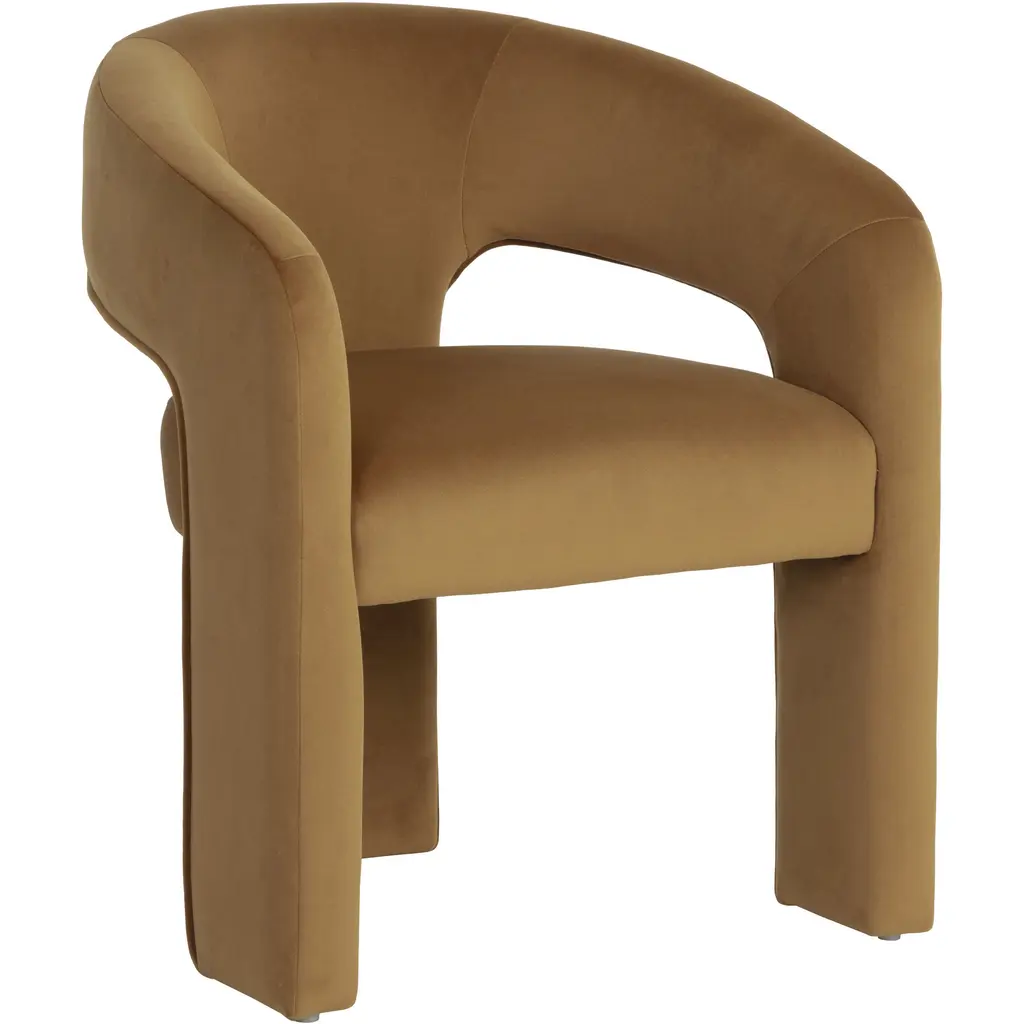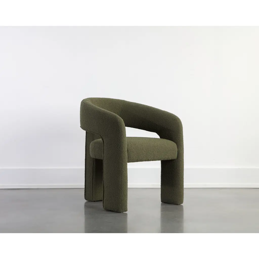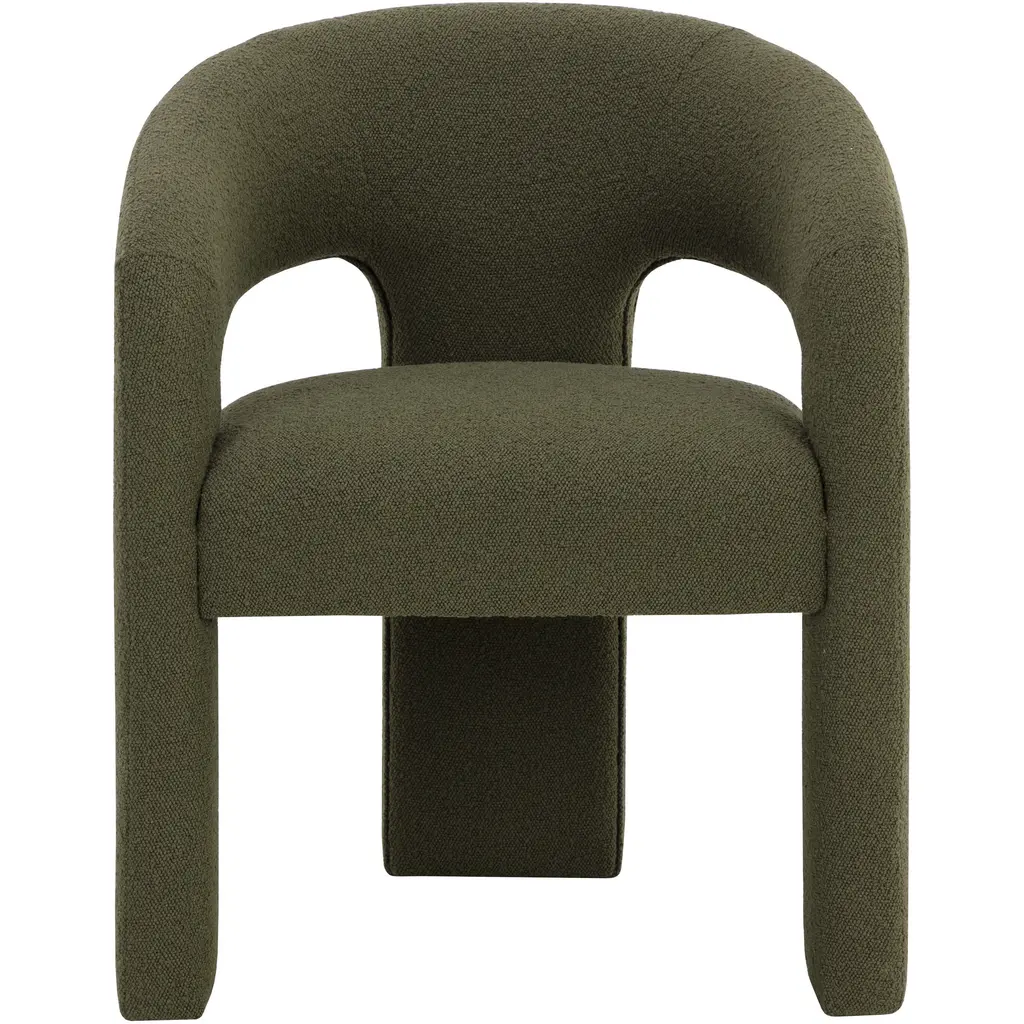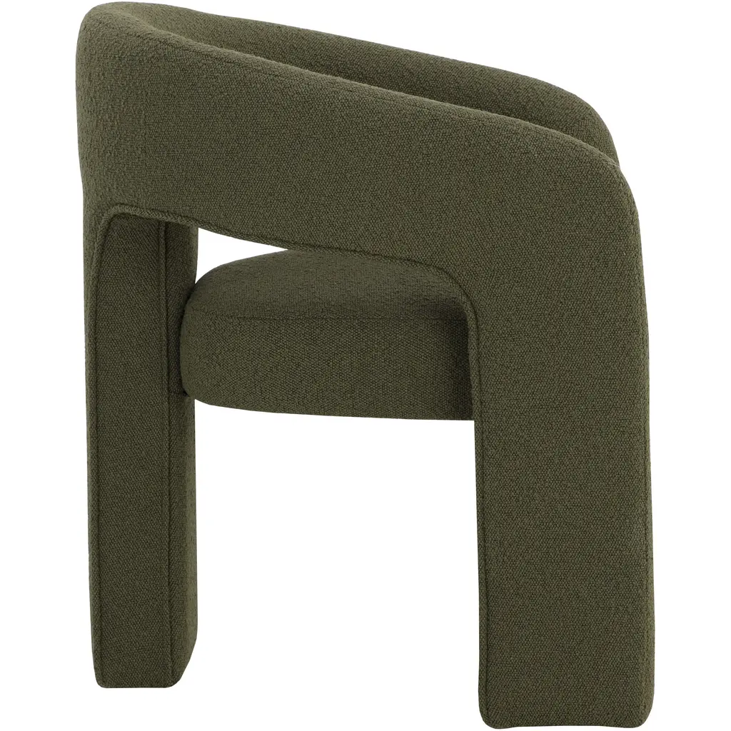 Clean lines and contoured arches add style and structure to this contemporary dining chair. Features a curved backrest and open back for optimal comfort. Eye-catching from all angles. Fully upholstered in copenhagen olive fabric.