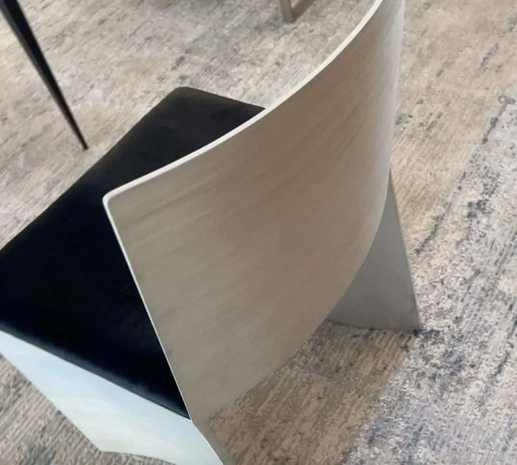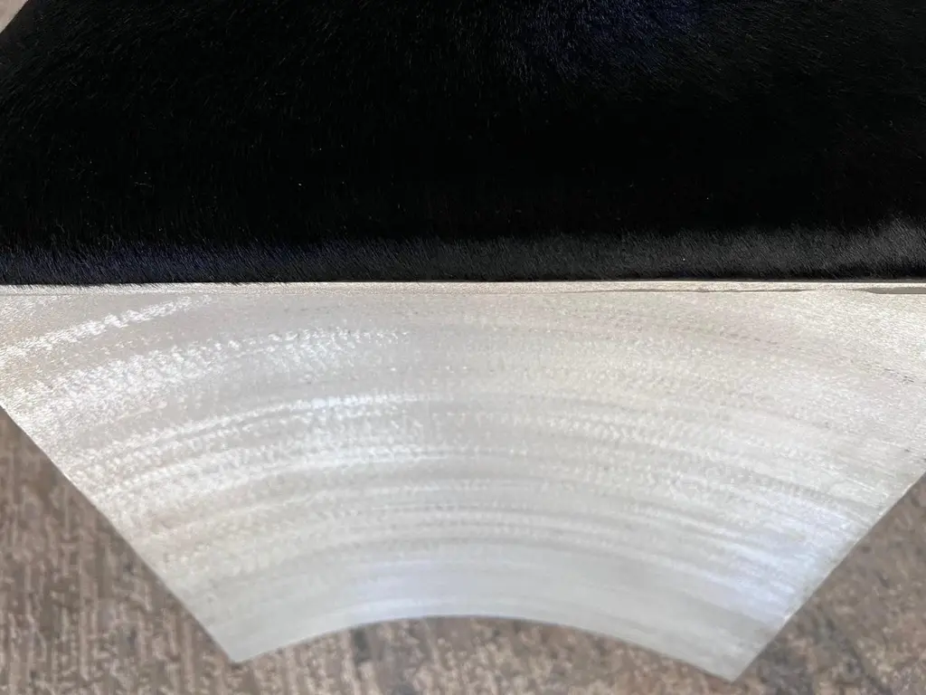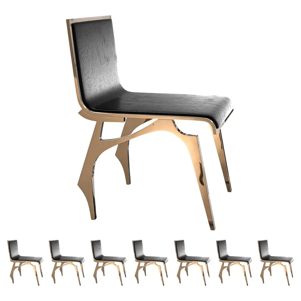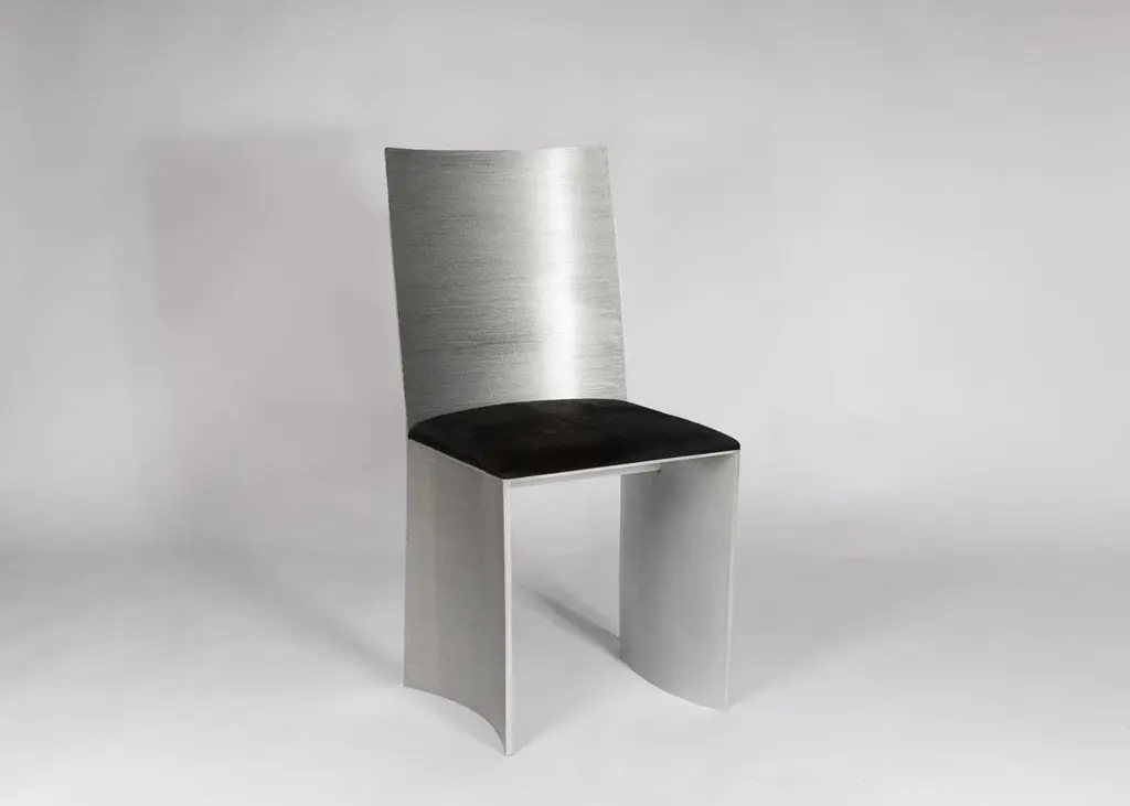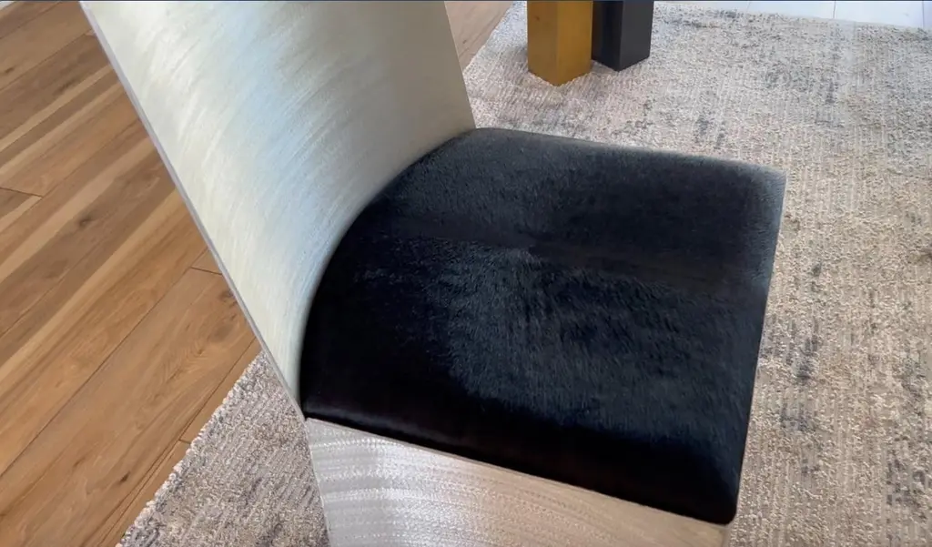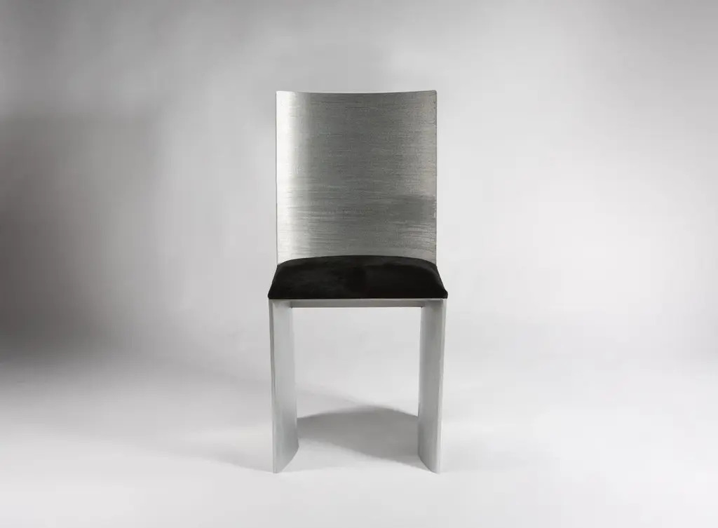 ISU Highback chair has a handcrafted satin grazed textured metal finish that sheens when exposed to light. The 1.50" high seat cushion is a lustrous black hair on hide. COM accepted on approval.The perfect seating for a dining room and/or living room.The ISU chair is also available with a 31" Lowback. See other listings for pricing.ISU is also suitable for the outdoors with a water repellant cushion. Please inquire for additional information on COM, outdoor fabrics and/or customization.Designed and handcrafted by Soraya Osorio.