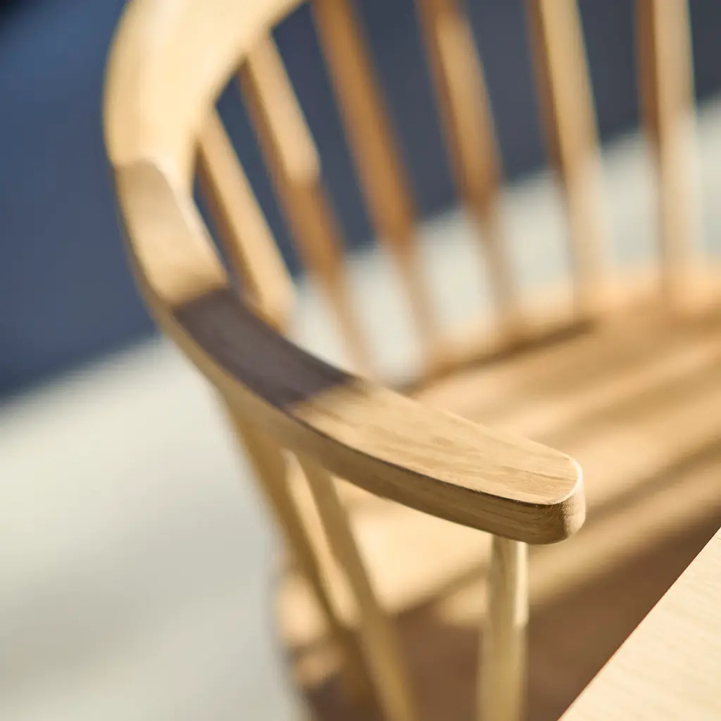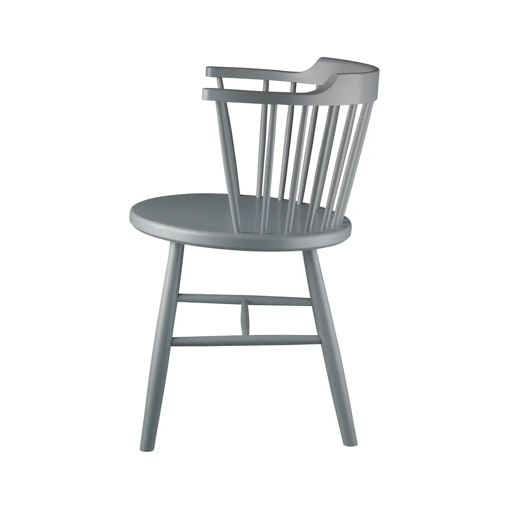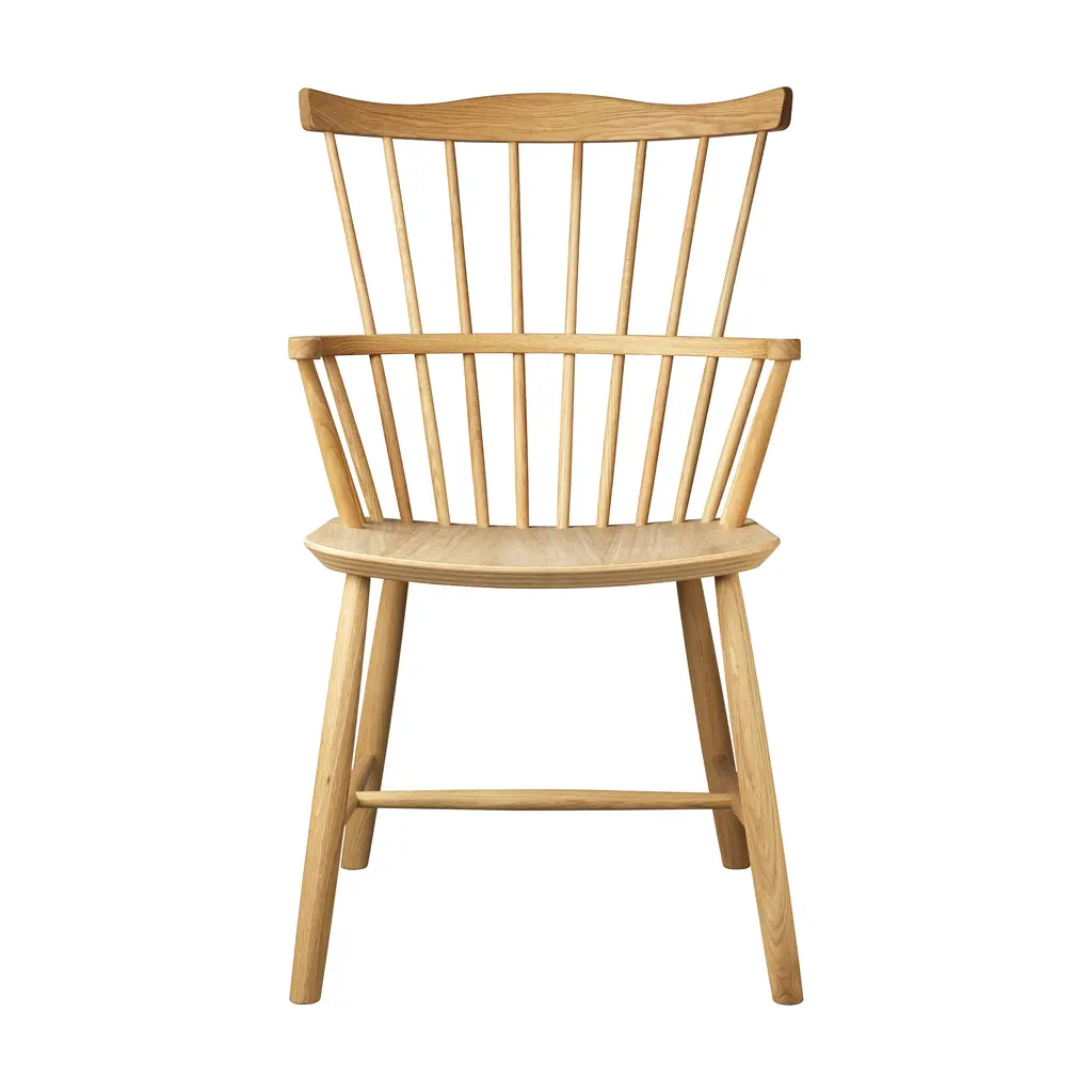 The J18 Dining Armchair from FDB Mobler, designed by Borge Mogensen in 1945, exemplifies Nordic design philosophy through its clean lines and functional simplicity. Inspired by eighteenth-century English Windsor chairs, this refined piece features a solid backrest that flows seamlessly into armrests designed to fit beneath most tabletops. The gently sloping, bowl-shaped wooden seat ensures exceptional comfort while maintaining the understated elegance that defines Mogensen's timeless aesthetic. Highlights