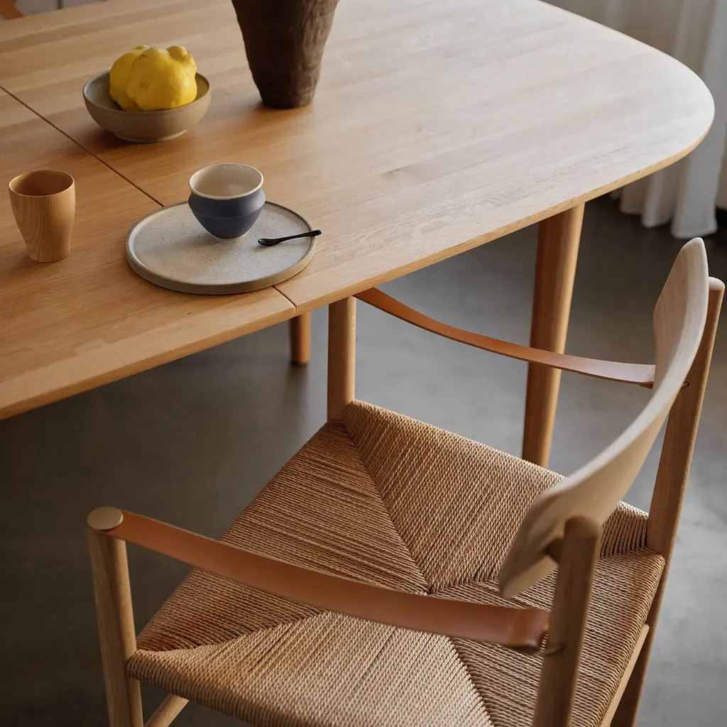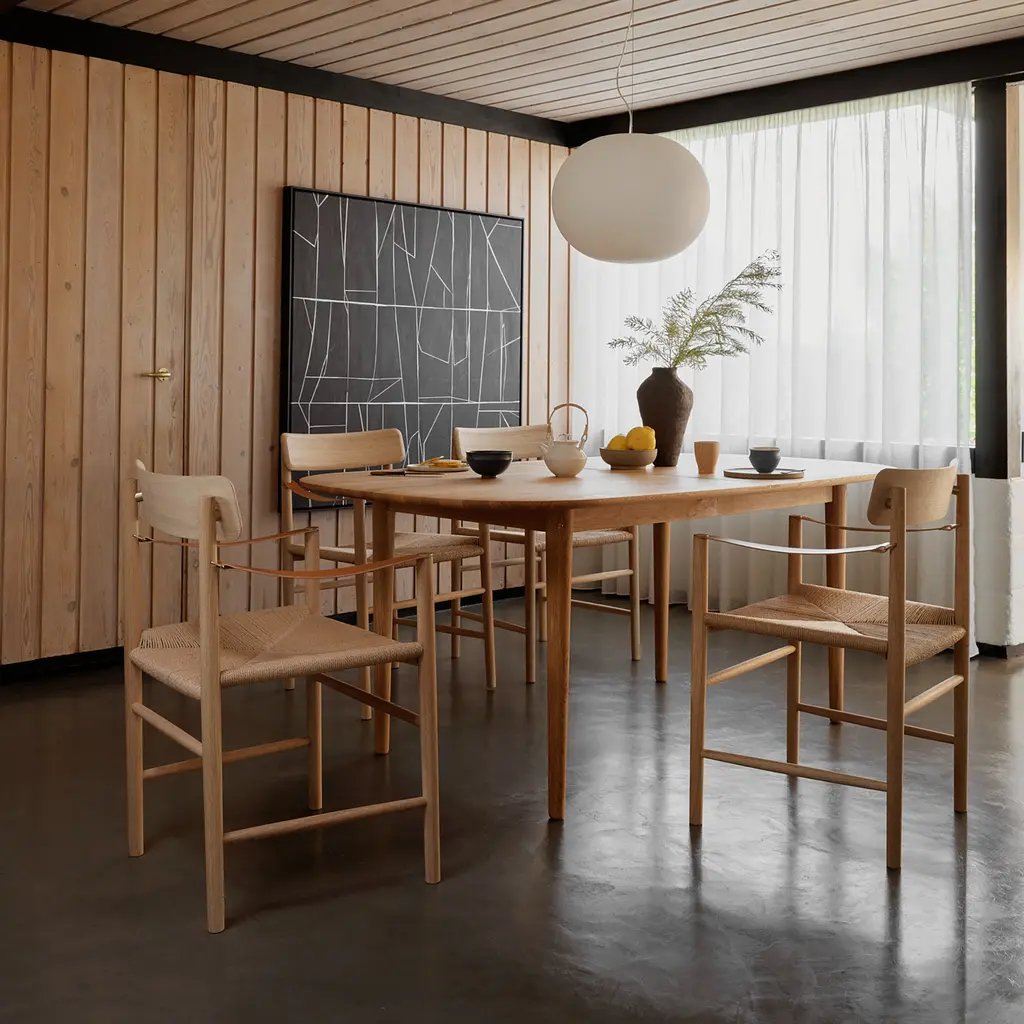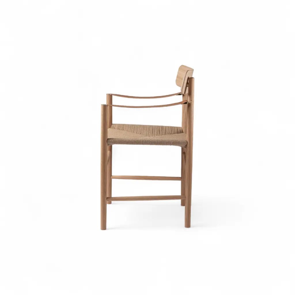 The J186 Hesbjerg Chair is a thoughtful take on Nordic design—quiet, inviting, and made to last. Designed by Unit10 and crafted from oiled oak veneer with a woven paper cord seat, it’s a piece that carries its own presence without demanding attention. The form is simple but nuanced, with subtle curves in the backrest and arms that make it just as comfortable as it is composed. Intended as a dining chair, it suits daily meals and long dinners alike, but its clean geometry makes it just as at home in a hallway, bedroom, or reading nook. The name “Hesbjerg” comes from a hilltop in North Zealand where generations of the designers’ family have gathered—fitting for a chair that’s quietly rooted in time and place.