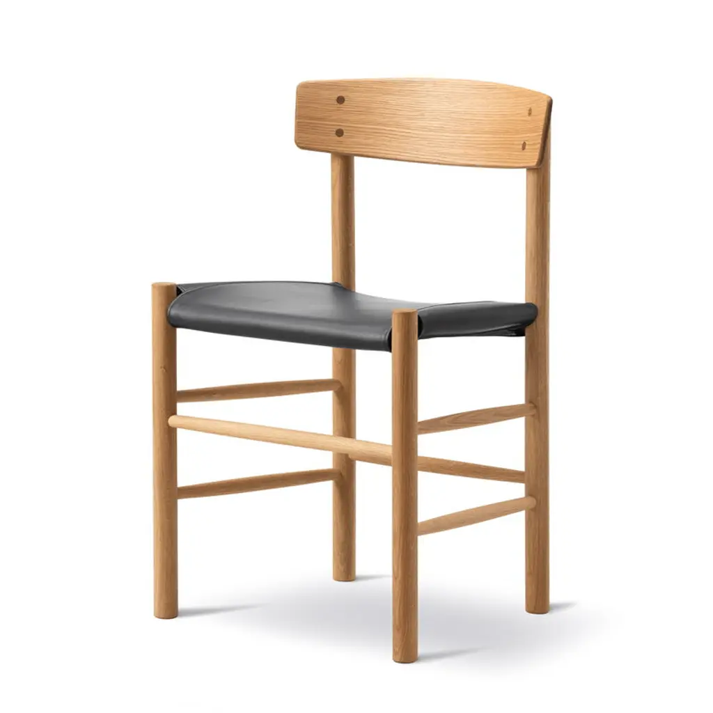 Fredericia’s J39 chair combines a solid wood frame with a lightly padded seat upholstered in leather. Originally designed in 1947 by Danish architect Børge Mogensen with a paper cord seat, this upholstered version follows the curved lines of the cord weave and is based on Mogensen’s 1969 prototype. With its timeless and natural character, the J39 chair works beautifully as a dining chair, as well as adding warmth and presence to an office or living space. Mogensen designed the chair originally for FDB, the Danish Consumers’ Co-operative Society, which chose Mogensen as its head designer in 1939. FDB’s furniture production began in the 1940s, with the main idea being functionalist and democratic design for the people. As the J39 chair gained popularity, it also earned the nickname ‘The People’s Chair’.