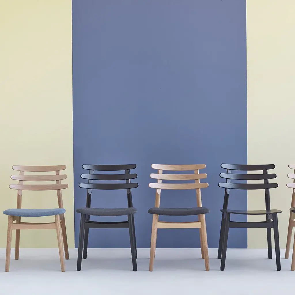 The J48 chair is Poul Volther's classic dining chair from 1951, which over the years has proved to be one of the most popular chairs in the FDB Mobler range. With its solid oak design, and the upholstered seat in either leather or textile, the J48 chair exudes quality. The rounded, separate back supports, similar to those on Poul Volther's Corona chair, provide a high degree of sitting comfort and an extremely aesthetic and uniquely original look.