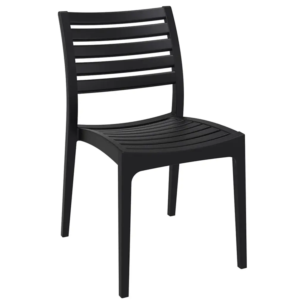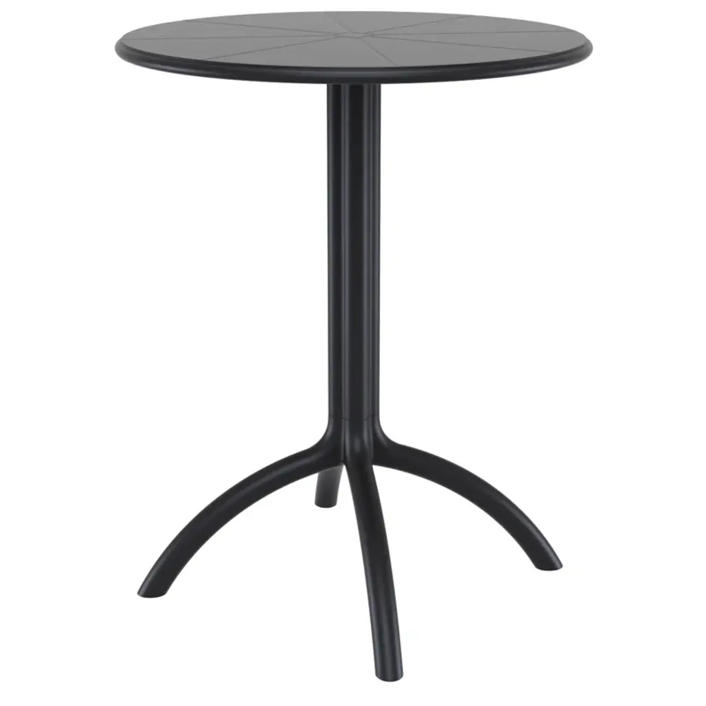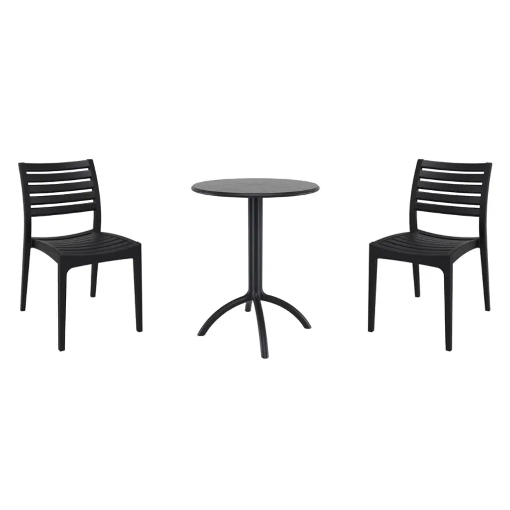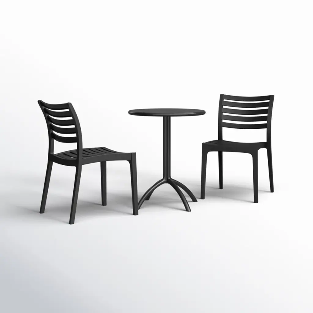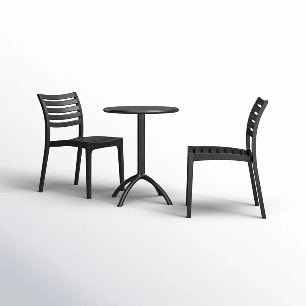 Bistro set with comfortable dining chairs and a round table. Great for outdoor spaces, patios and decks. Used by restaurants, cafes and hotels. Chairs and table are made from marine grade polypropylene. Stackable chairs are super sturdy with commercial strength.