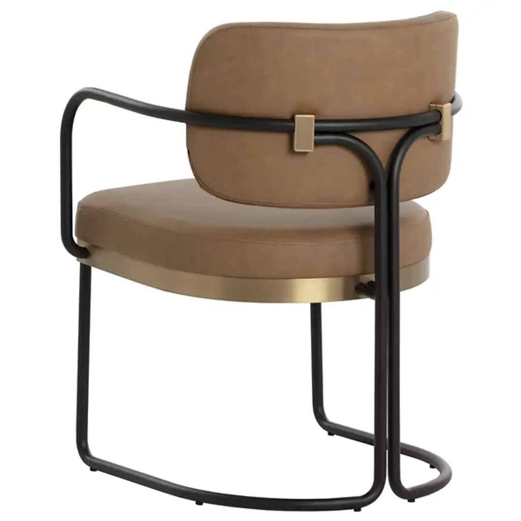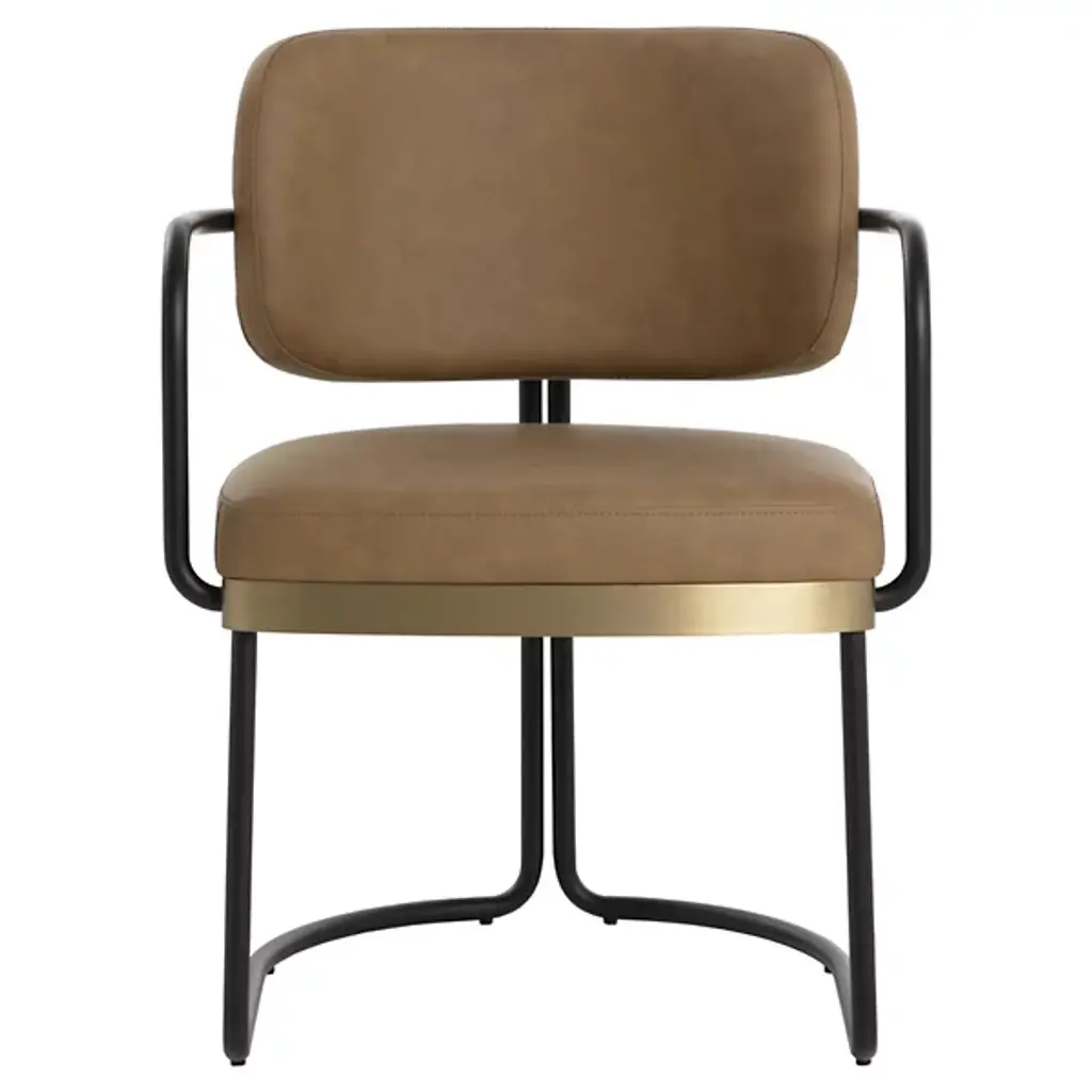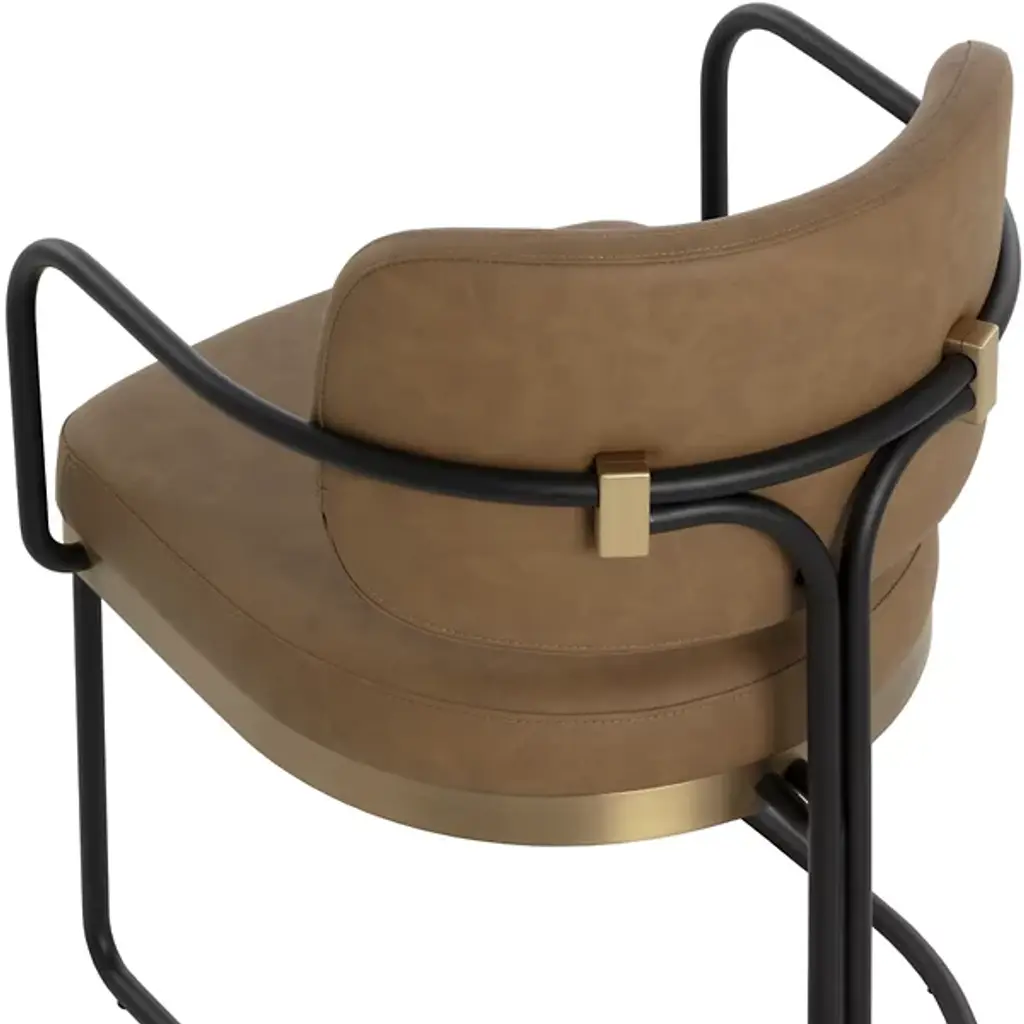 The Jalen Dining Armchair from Sunpan offers sophisticated comfort to its surroundings, intersecting sculptural elegance with contemporary design. The artfully curved powder-coated iron frame rises gracefully, highlighted by a gleaming gold-finished stainless steel seat base that catches the light. Each chair is thoughtfully crafted and upholstered in premium Milliken cognac faux leather, developing distinctive character marks that tell its own story. Art Deco-inspired details and generous foam cushioning create an inviting seat that elevates any gathering space.