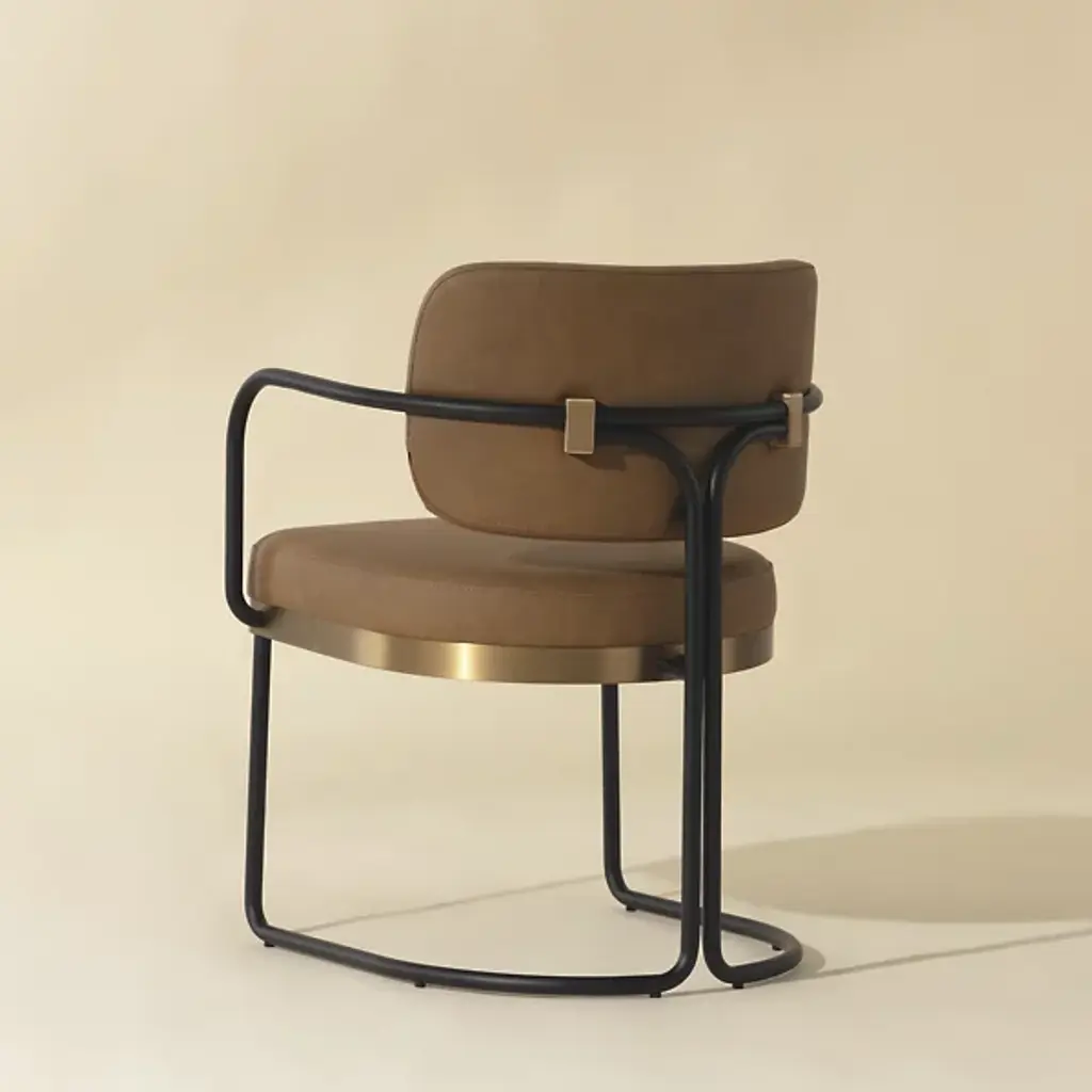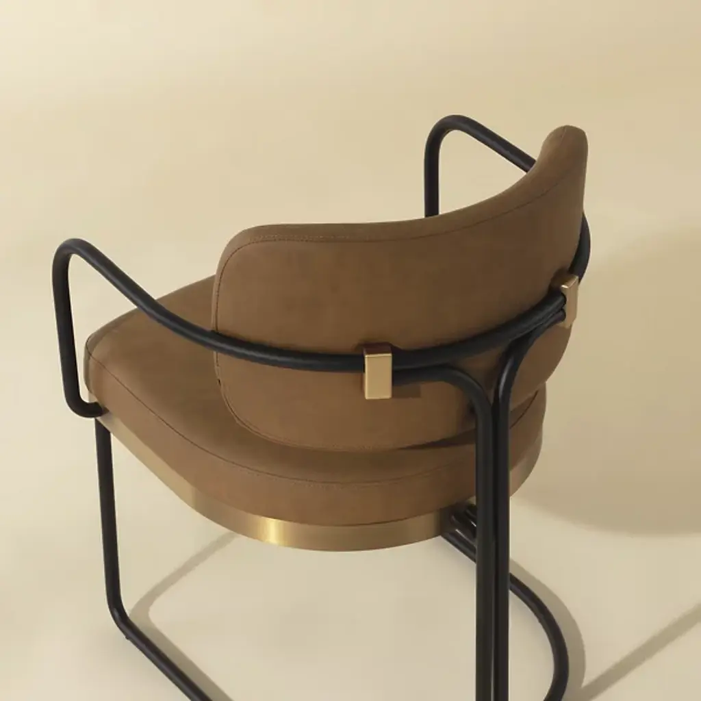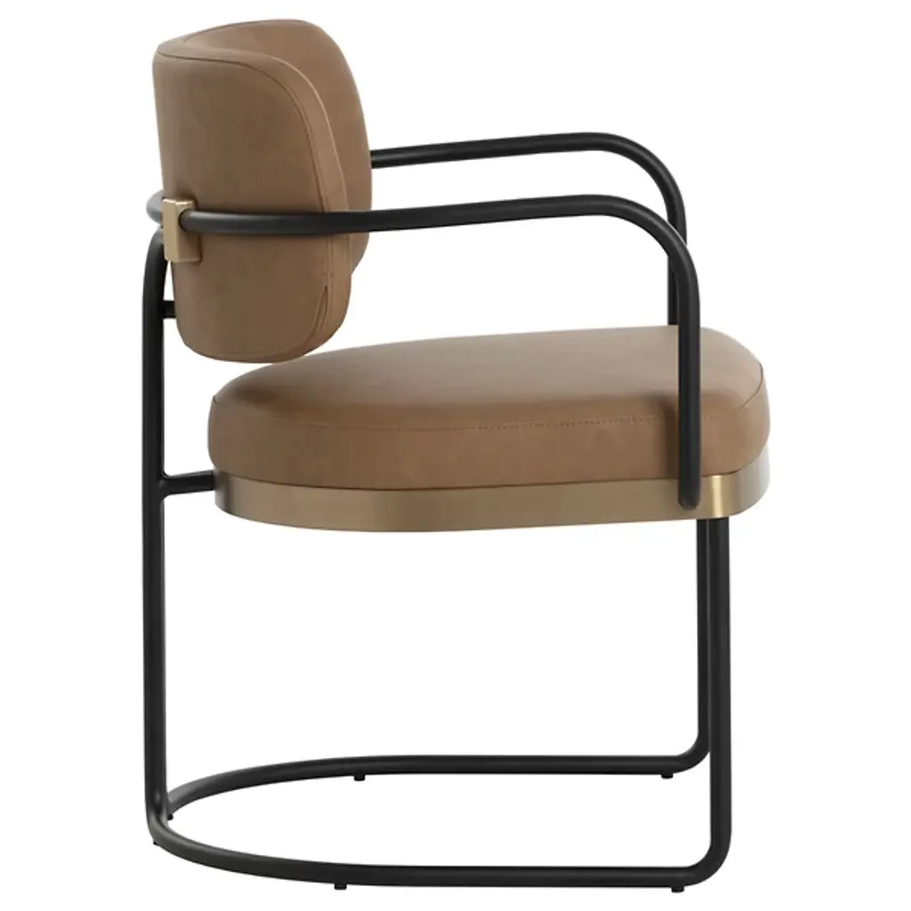 The Jalen Dining Armchair from Sunpan offers sophisticated comfort to its surroundings, intersecting sculptural elegance with contemporary design. The artfully curved powder-coated iron frame rises gracefully, highlighted by a gleaming gold-finished stainless steel seat base that catches the light. Each chair is thoughtfully crafted and upholstered in premium Milliken cognac faux leather, developing distinctive character marks that tell its own story. Art Deco-inspired details and generous foam cushioning create an inviting seat that elevates any gathering space.