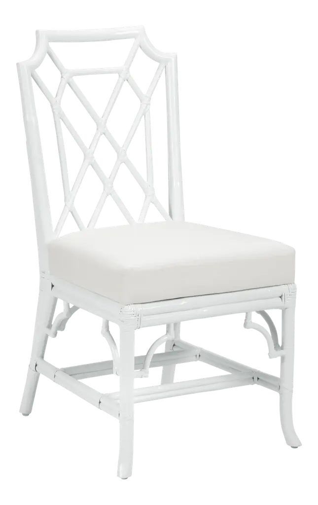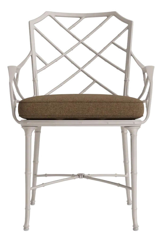 The Jardin Collection revisits one of Villa & House’s beloved design motifs, inspired by classic Chinoiseries. A rich lacquered finish adds to the sophistication of the design, which sees solid mahogany artisanally hand-carved to resemble bamboo. Decorative lattice fretwork, diagonal stretchers, and gently tapered legs add visual and structural interest while maintaining an air of elegant simplicity. Completed with a linen drop in cushion, the Jardin Side Chair feels at once relaxed and undeniably upscale. Either at a desk or dining table, this chair invites you to sit back in style.