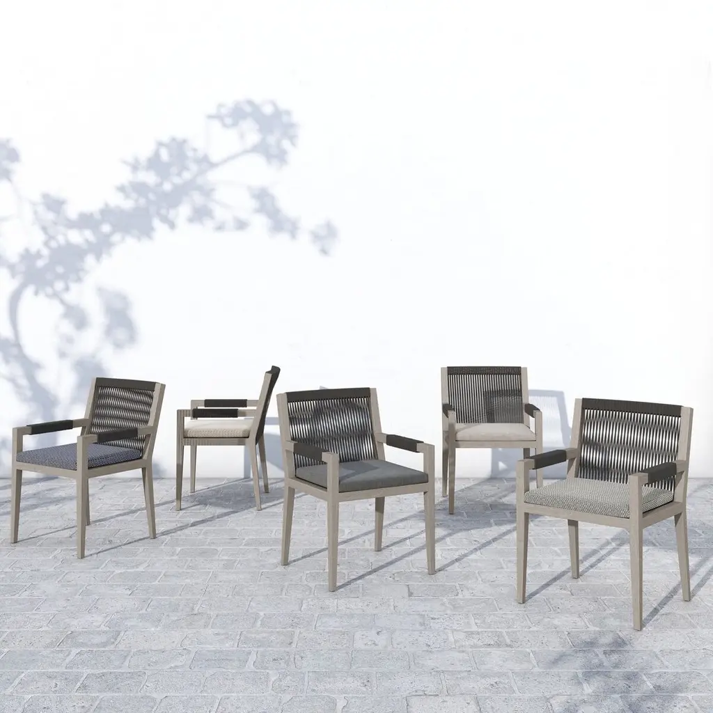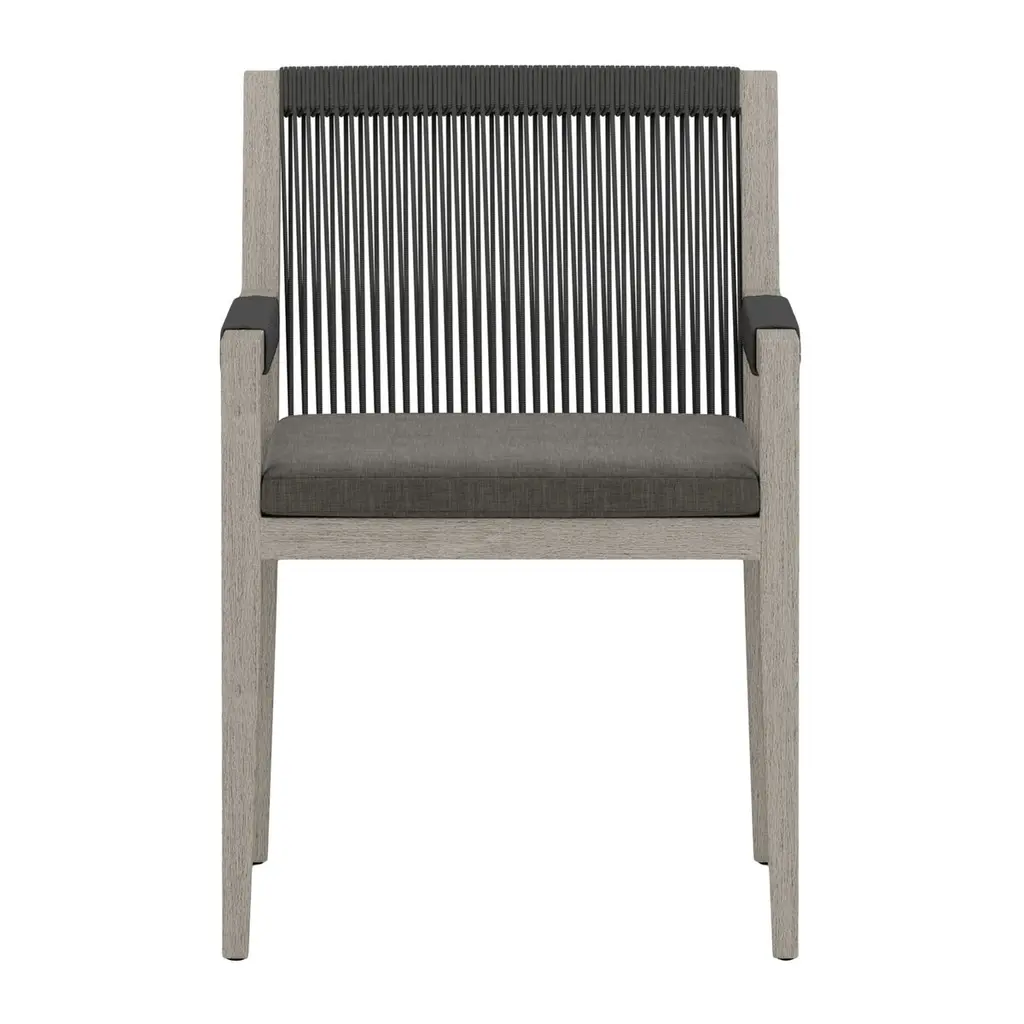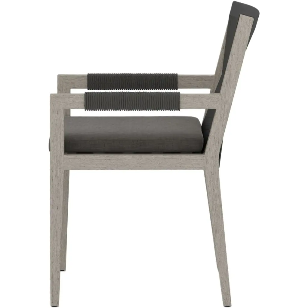 Modern materials craft a stylish silhouette for outdoor dining. Teak forms a clean frame for UV-resistant and water-repellent Sunproof fabric, ensuring durability and comfort. This chair is designed to withstand the elements, though it is recommended to cover or store indoors during inclement weather. Enhance your outdoor dining experience with this elegantly designed armchair.