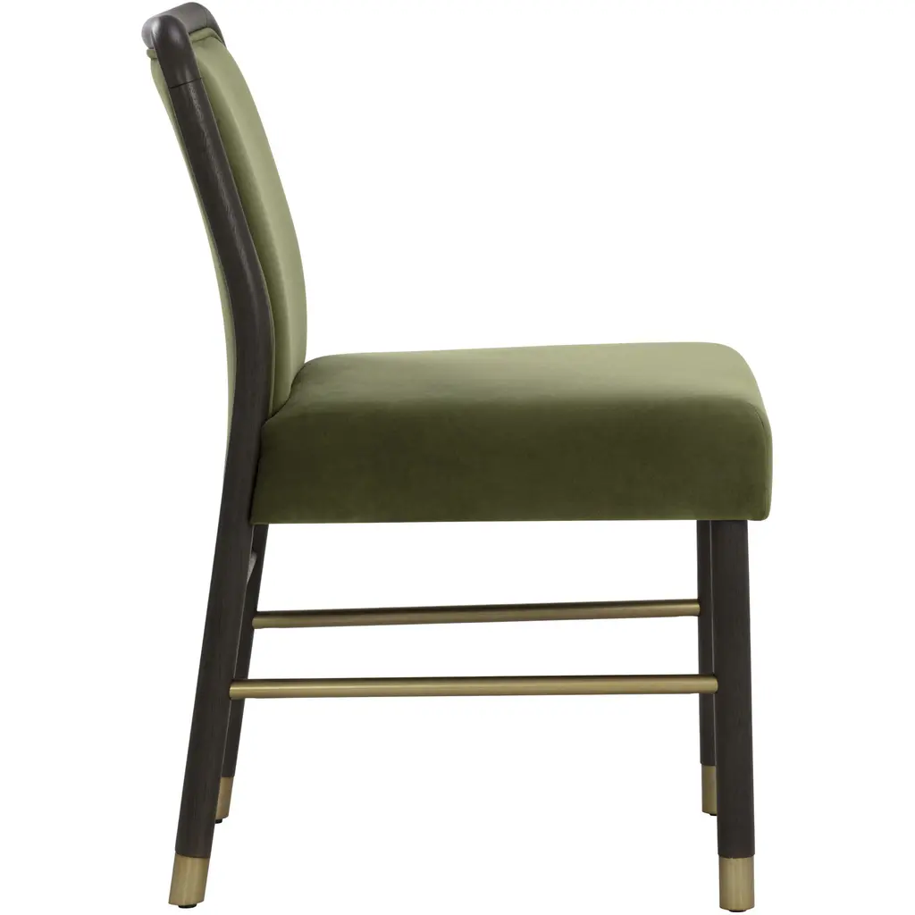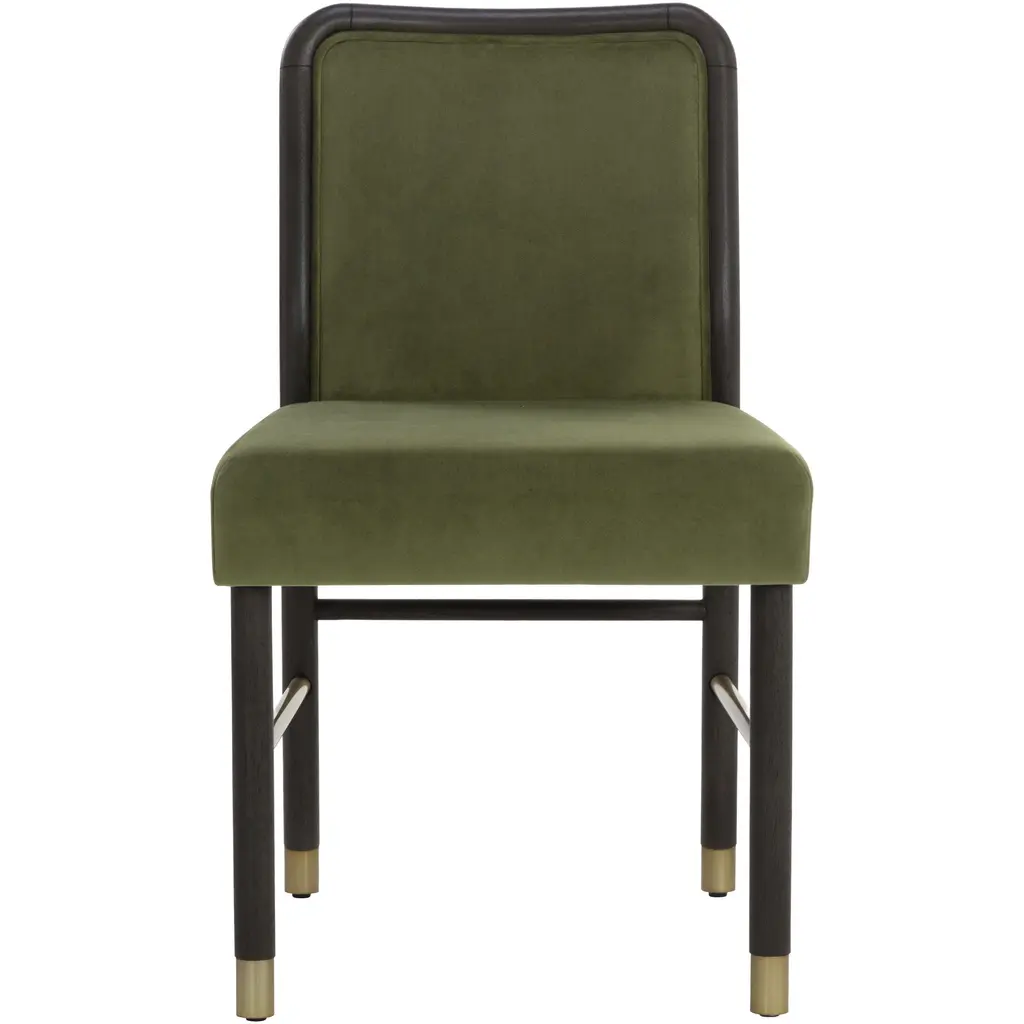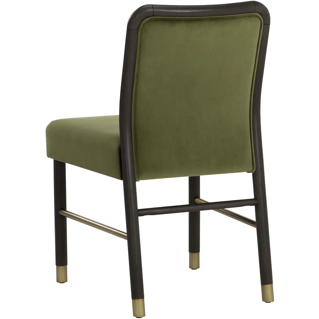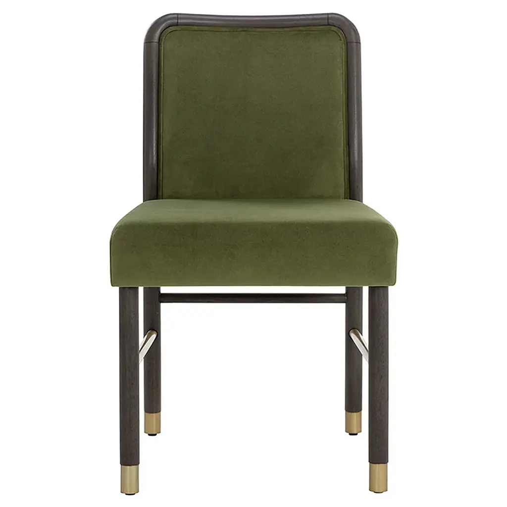 The Jeno Dining Chair is a sophisticated study of mid-century design. A velvet fabric seat in meg olive combined with a smoke grey rubberwood frame gives a striking balance of impeccable style and comfort. Brass metal stretchers and foot caps enhance the overall look. As wood is an organic, porous material, these pieces will contain natural variation of texture and may also exhibit fine indentations and cracks. Wood pieces will also display a disparity of colour and grain, and visible knots and burls that add to the character of each piece.