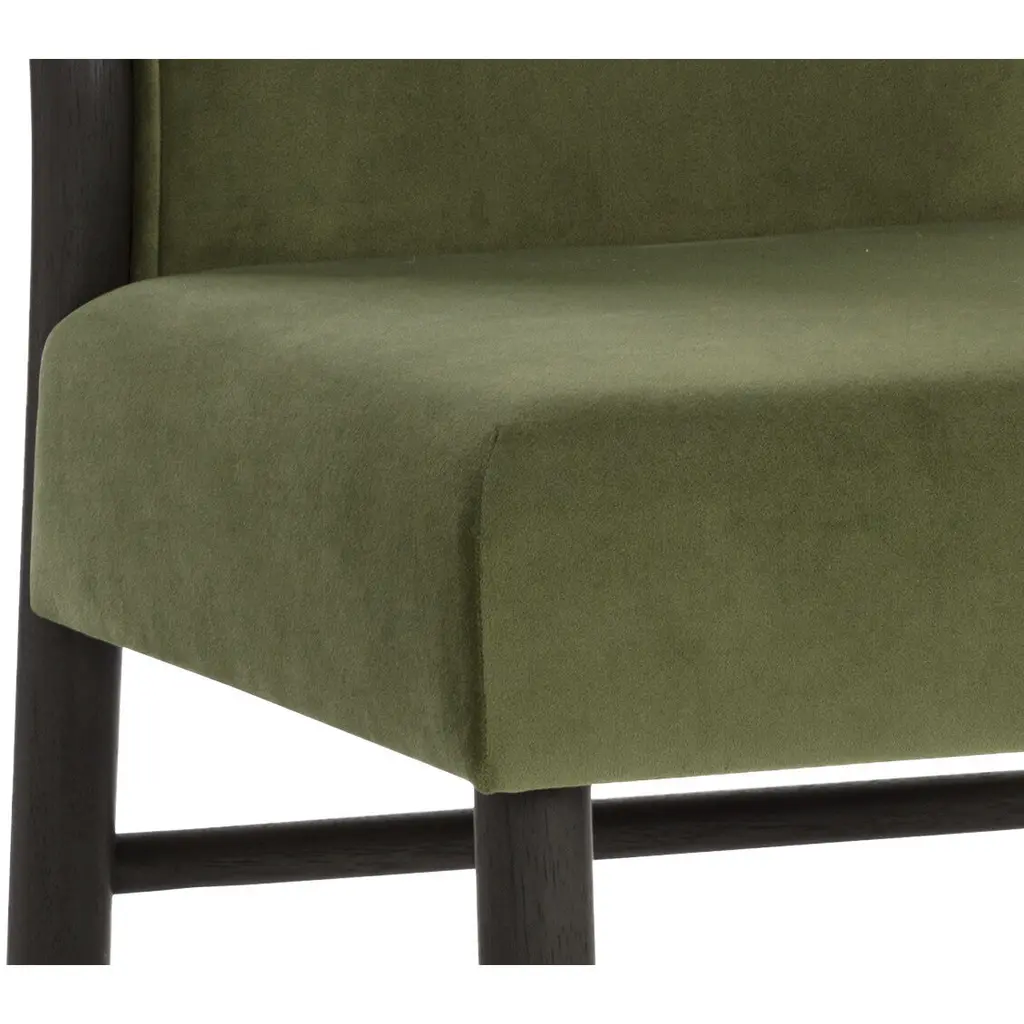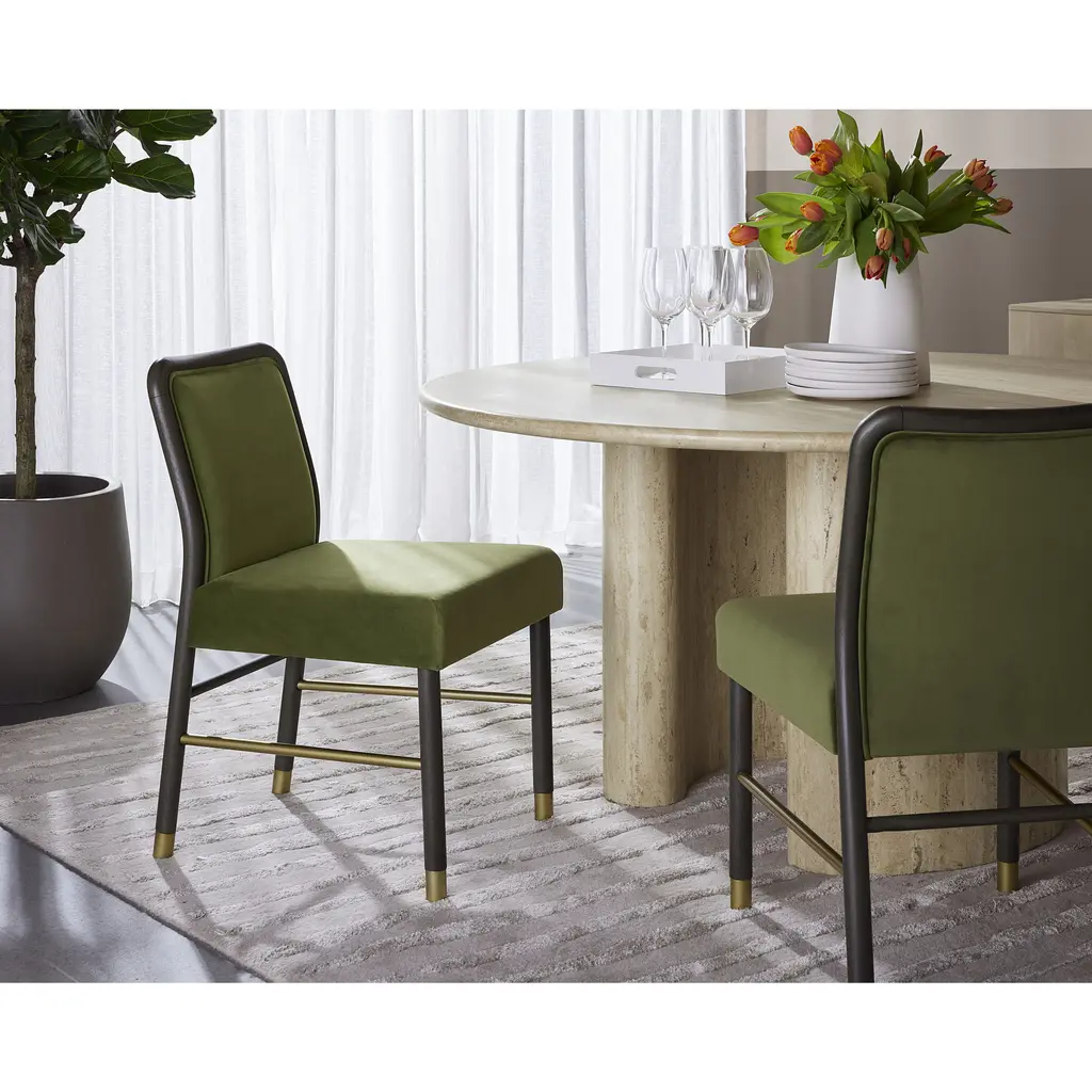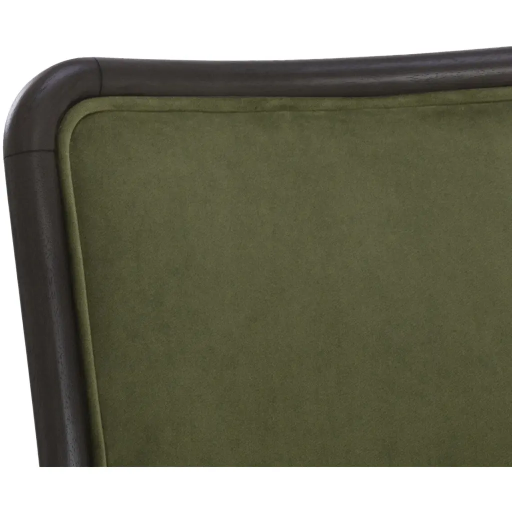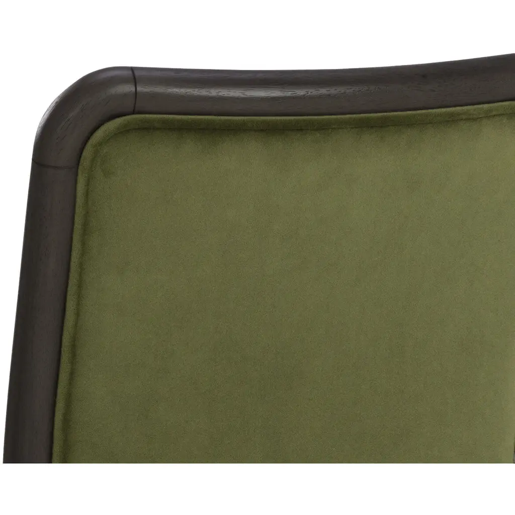 The Jeno Dining Chair is a sophisticated study of mid-century design. A velvet fabric seat in meg olive combined with a smoke grey rubberwood frame gives a striking balance of impeccable style and comfort. Brass metal stretchers and foot caps enhance the overall look. As wood is an organic, porous material, these pieces will contain natural variation of texture and may also exhibit fine indentations and cracks. Wood pieces will also display a disparity of colour and grain, and visible knots and burls that add to the character of each piece.