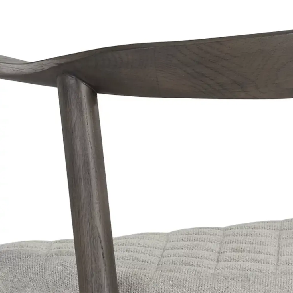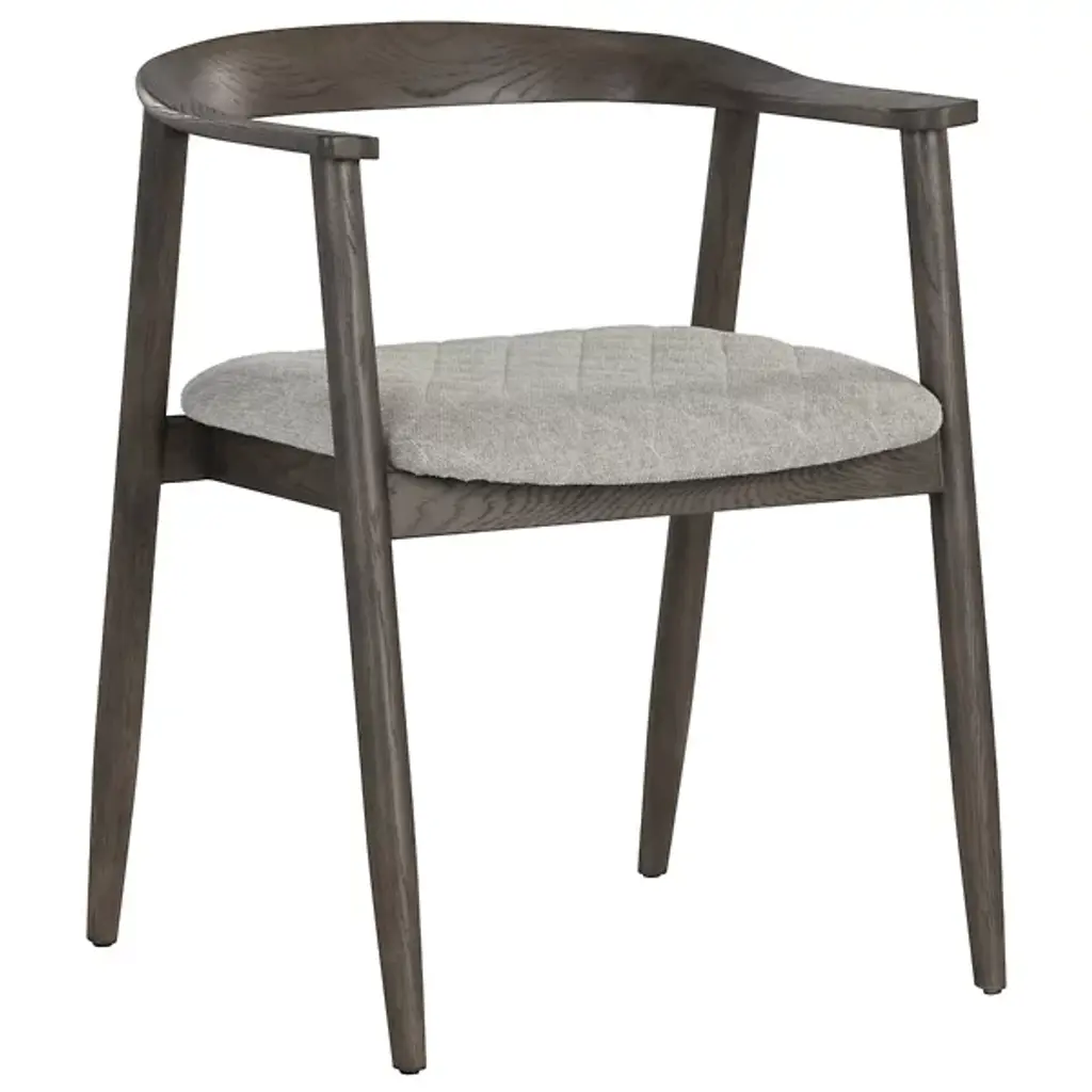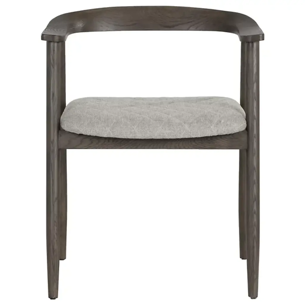The Jeremy Dining Armchair from Sunpan offers the timeless beauty of mid-century design and celebrates the art of simplicity. Its comfortable quilted cushion, dressed in belfast heather grey fabric, invites you to linger at the table. The chair is gracefully supported by a dark brown solid oak wood frame. Embrace the uniqueness of organic, porous wood; each piece boasts natural texture variations, fine indentations, and the character of knots and burls.