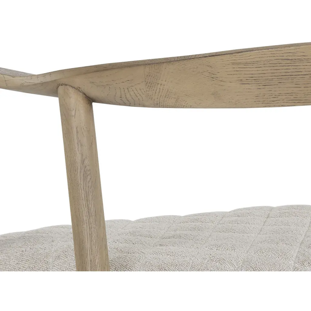 An alluring mid-century dining armchair that embraces the beauty of simplicity. Features a comfortable, quilted cushion in dove cream fabric. Completed with a brown, weathered solid oak wood frame. As wood is an organic, porous material, these pieces will contain natural variation of texture and may also exhibit fine indentations and cracks. Wood pieces will also display a disparity of colour and grain, and visible knots and burls that add to the character of each piece.