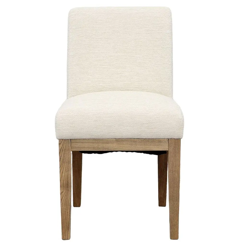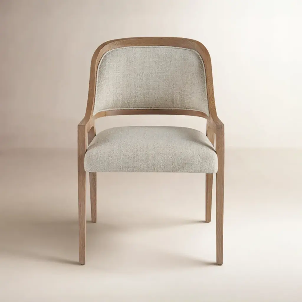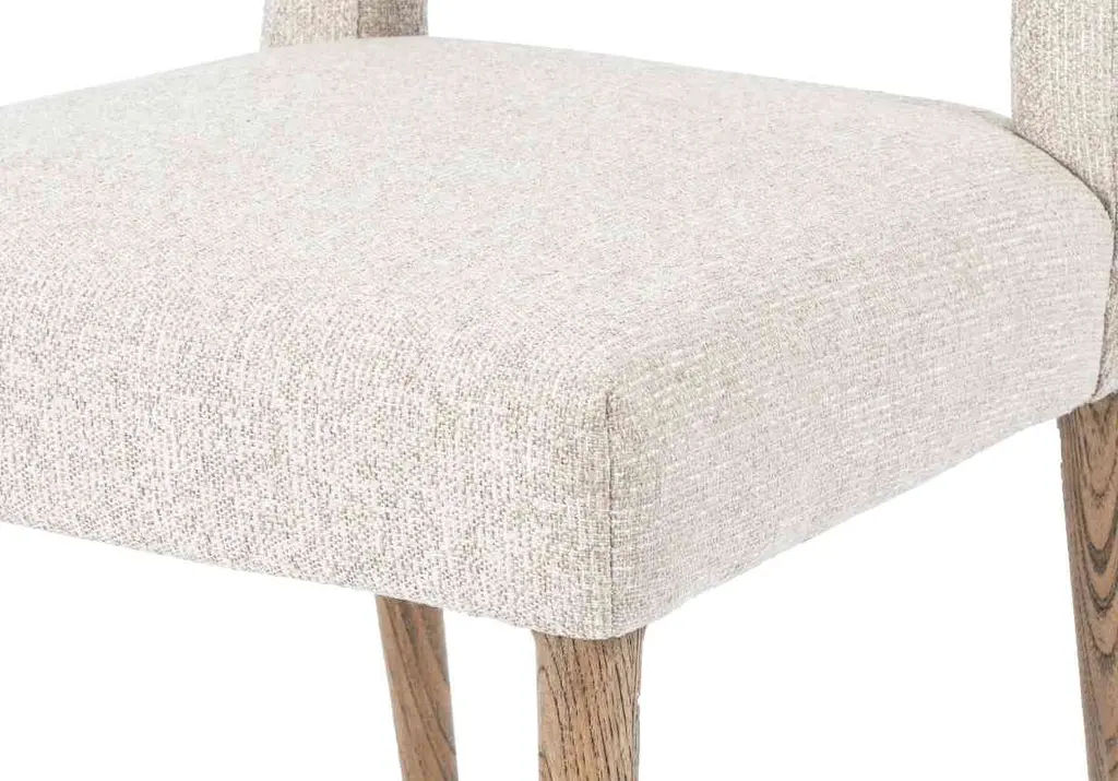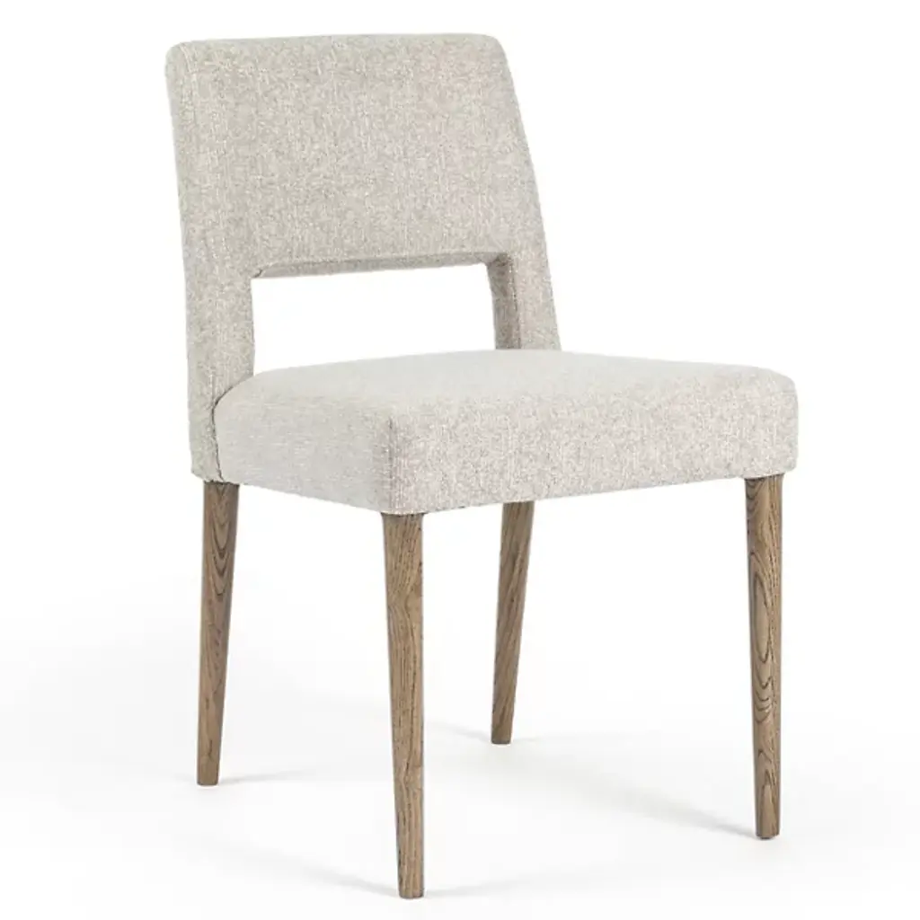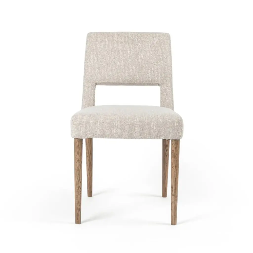 This refined dining chair lends a tasteful look with its toasted nettlewood legs complemented by a light taupe upholstery. A chic back cutout adds an airy look, creating a simple, sophisticated design.