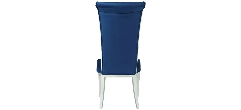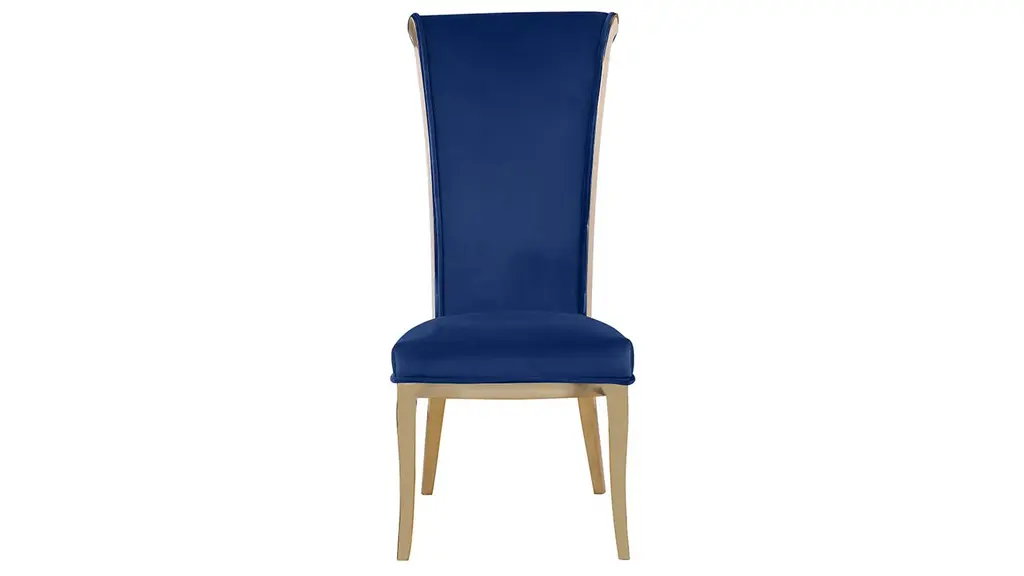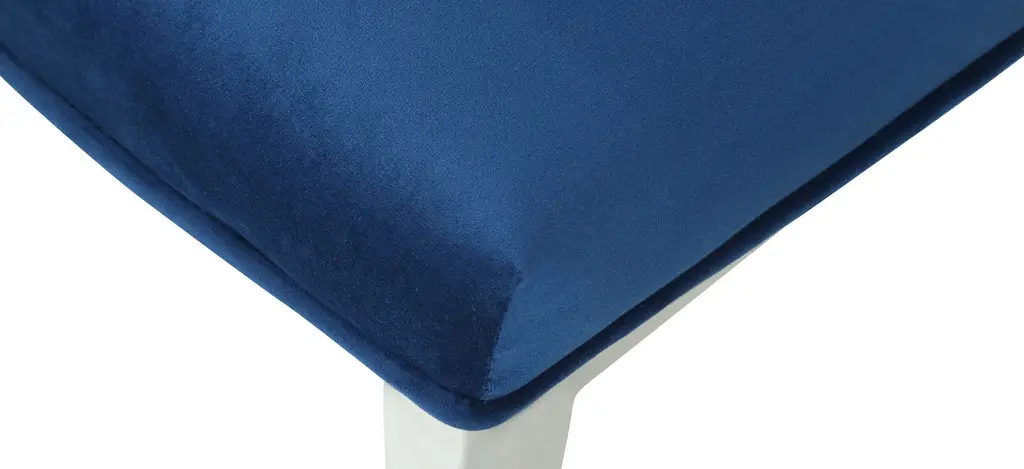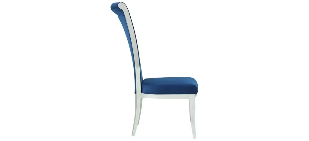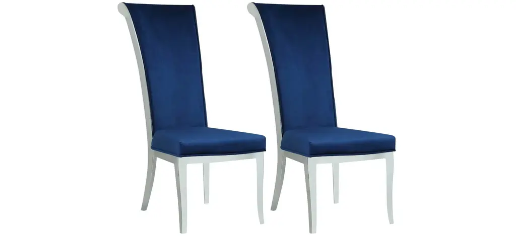 This Joy side chair set of 2 features a thick seat cushion upholstered in fabric, with double stitching on the back and decorative piping on a polished stainless steel frame.