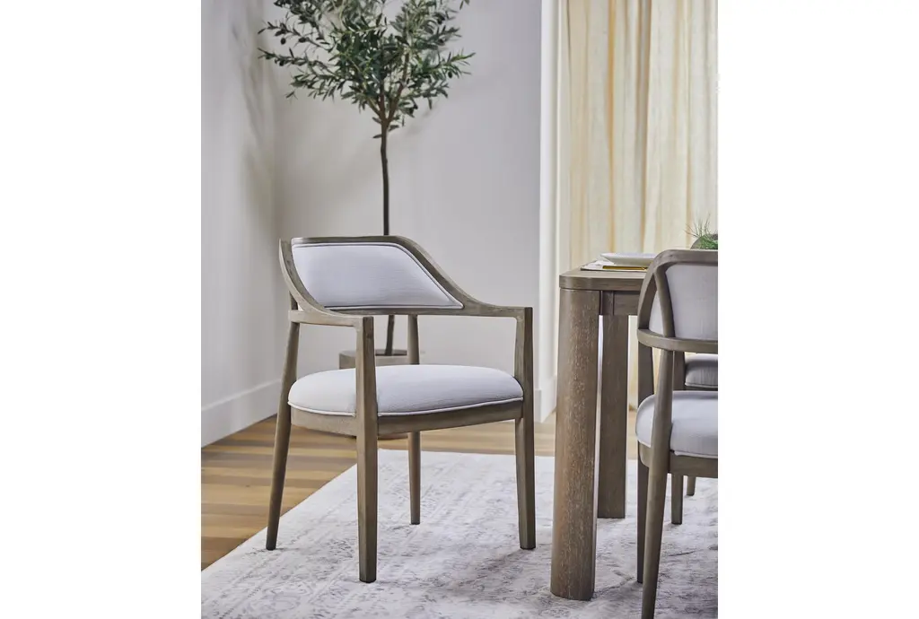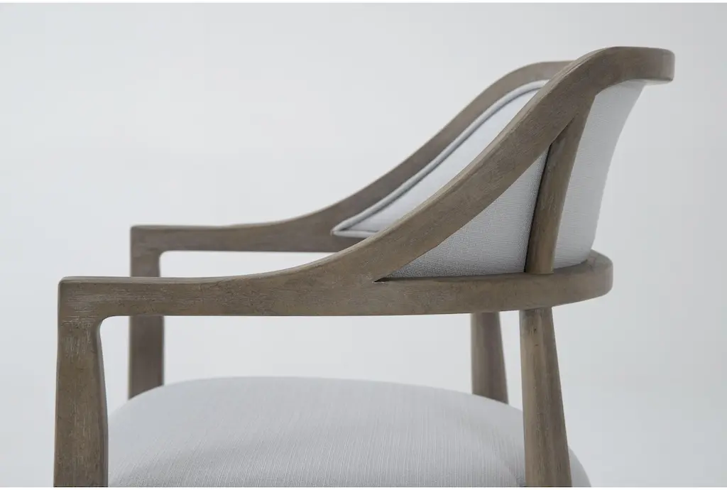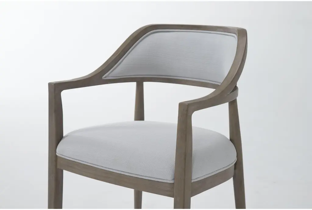 Turn any occasion into a special celebration with our classic Kasey dining arm chair. Elements of rustic design and traditional style combine to craft an elegant piece that boasts uniquely beautiful details. Soft edges and shapely legs create a graceful silhouette, while solid hardwood and oak veneers in a washed grey finish bring in natural character. Upholstered seating is tailored yet cozy, and invites you to tuck into meals and make memories.