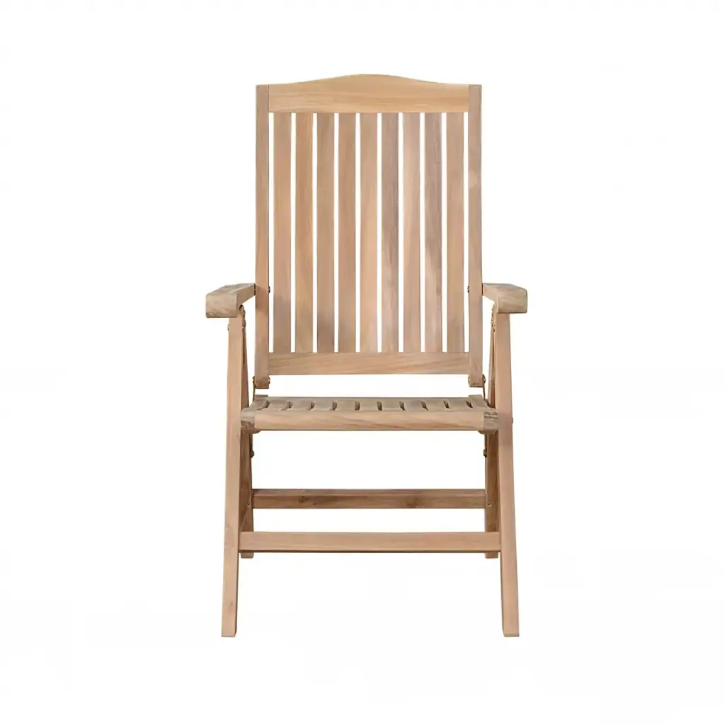 The Katana Five-Position Reclining Chair is easily adjusted from an upright dining position to a relaxed reading position to a reclined position to suit your pleasure. The chairs also folds easily for moving and storing so you can accommodate guests when you need to and hide the set when you don’t. With a 5-position adjustment, our recliners are very comfortable and versatile. A simple ratchet action makes adjustment quick and easy. Made from genuine grade teak, it is sanded smooth without any finish in its natural form and color.