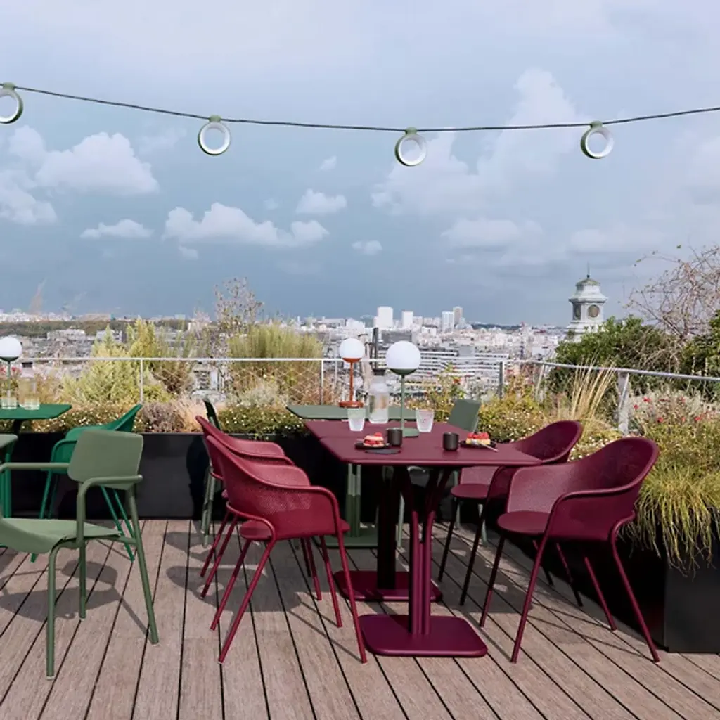 A sleek and soft-looking seat for indoor or outdoor dining areas. The defining design detail of the Kate Chair, Set of 2 by Fermob is its curved steel shell backrest, which encircles a sitter and features numerous irregular perforations that give the chair an almost shimmering effect. The rest of the chair is also made of steel, including a steel sheet seat and tubular steel frame. All the available powder coat finishes make this piece suitable for outdoor use. Designed by Patrick Jouin.