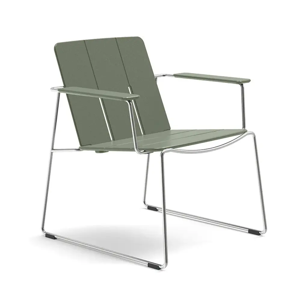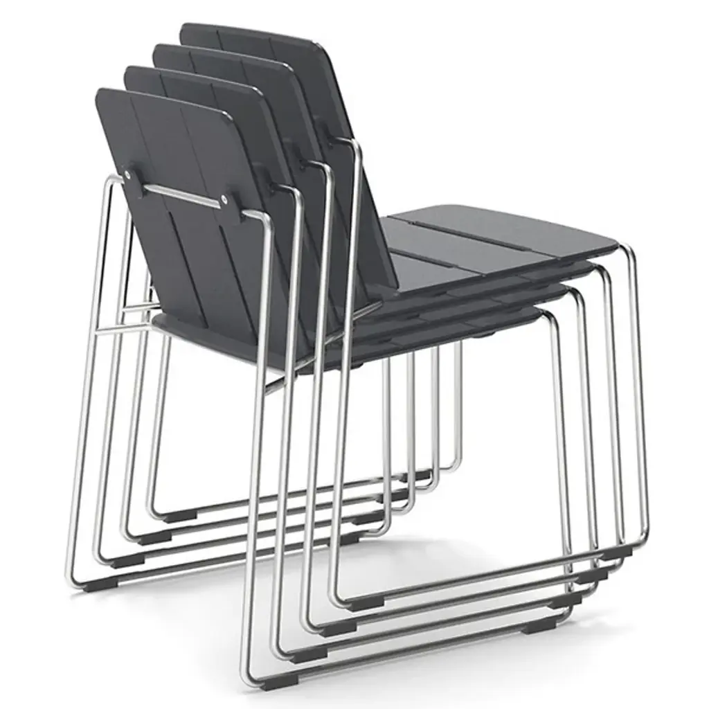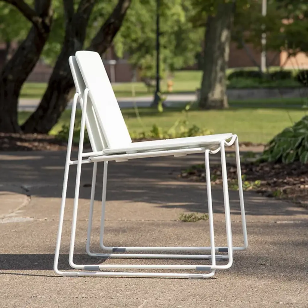 The Keene Outdoor Dining Chair from Loll Designs combines minimalist form with eco-conscious manufacturing. Made in the USA, its slim stainless steel frame supports a smooth seat and backrest crafted from recycled HDPE primarily sourced from post-consumer milk jugs due to their lack of pigment. Built to survive the outdoors, the seat includes drainage slots to prevent water buildup, while protective glides keep surfaces scuff-free. Stackable up to four high for easy storage, this strong, lightweight chair is easy to move and comfortable to sit in.
