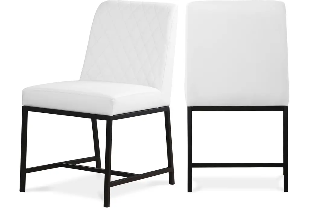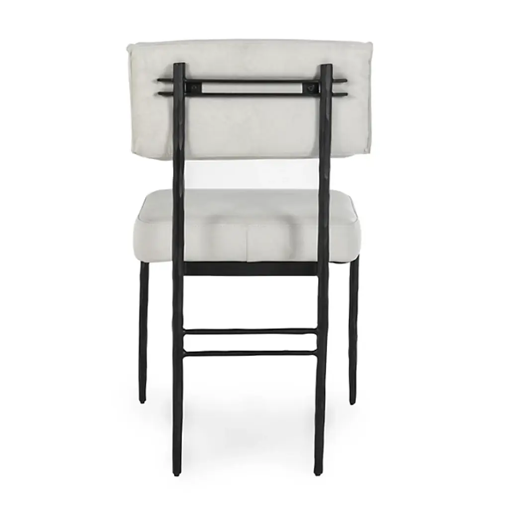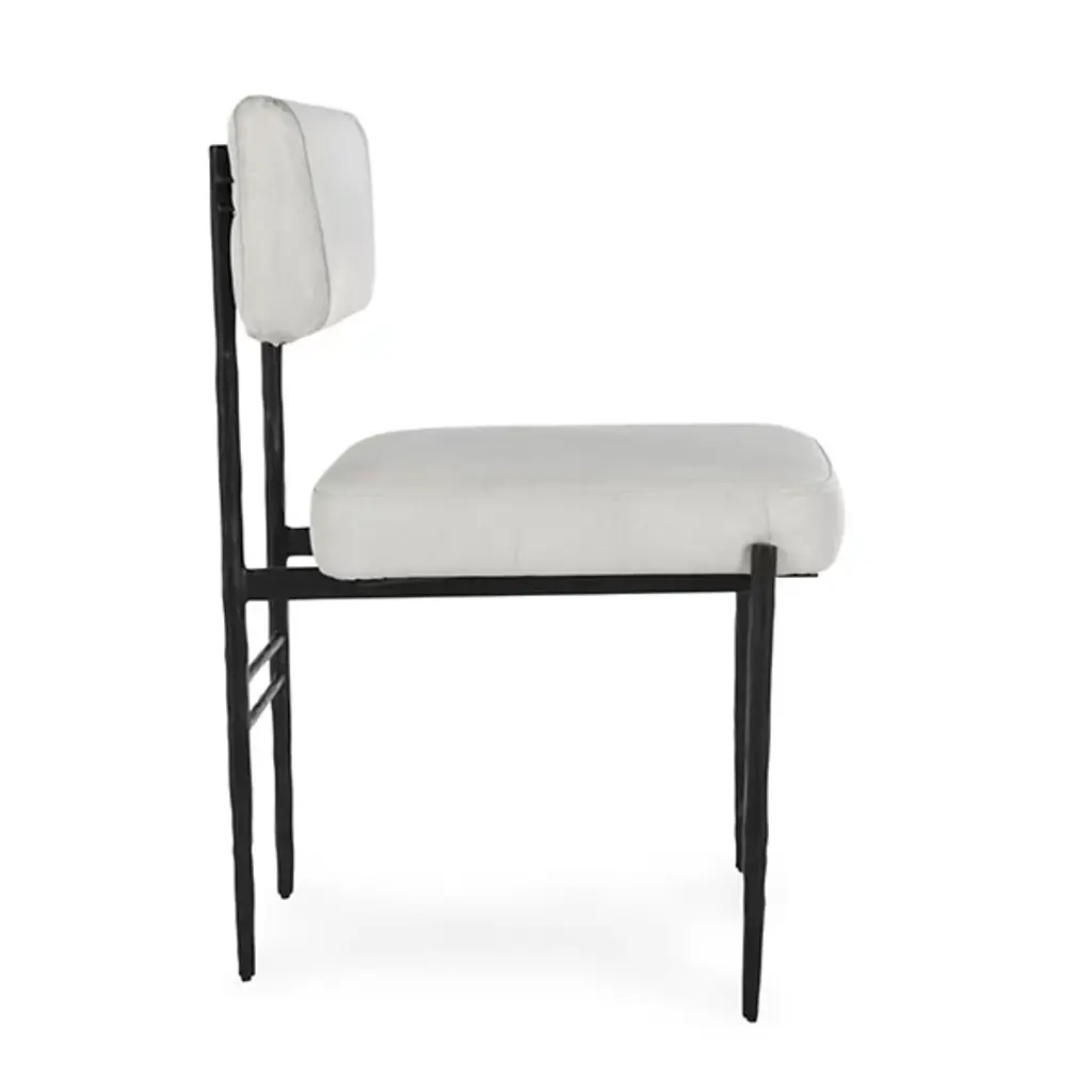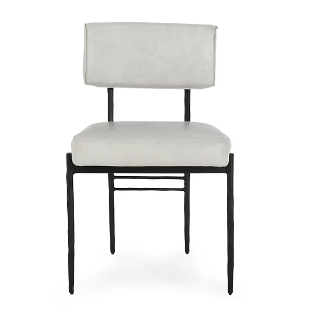 The Kester Dining Chair, Set of 2 from Classic Home balances delicate proportions with substantial materials through its hammered iron frame. The distinctive texture of the metal creates a subtle light play that enlivens the chair's minimalist profile. Top-grain leather cushions on the seat and back add inviting softness against the industrial frame. Tapered legs provide stable support while maintaining lightness throughout the design. Floor protectors underneath ensure your flooring remains unmarked. This chair’s versatile design works equally well in formal dining setups or casual eating areas.