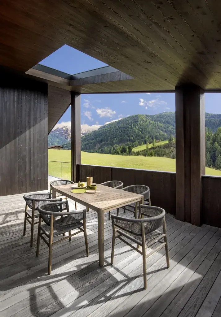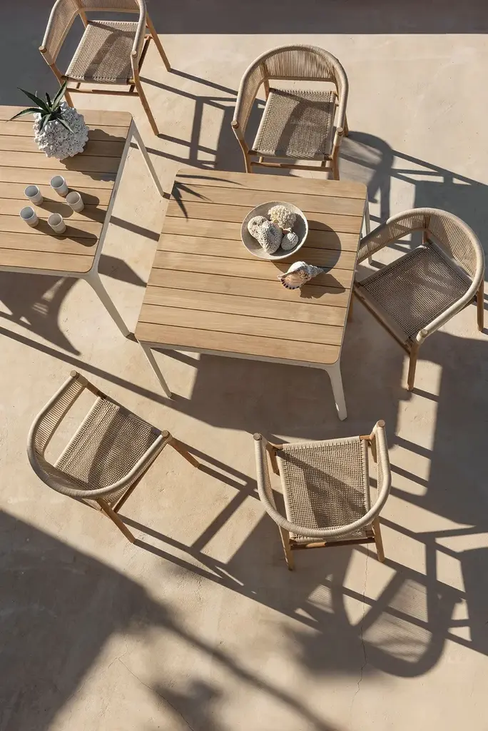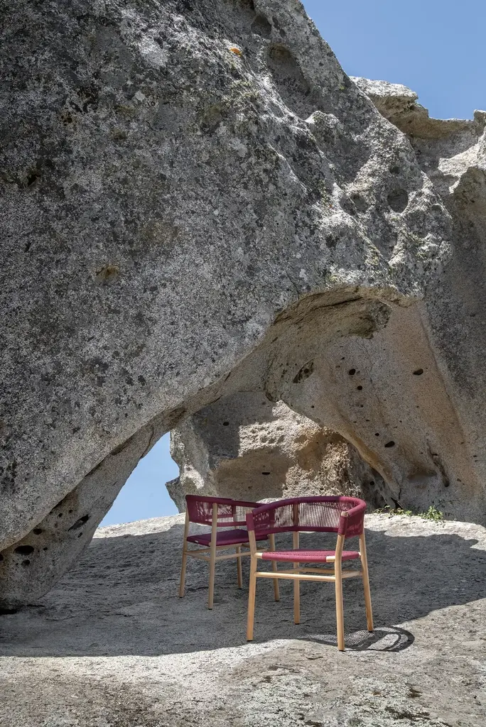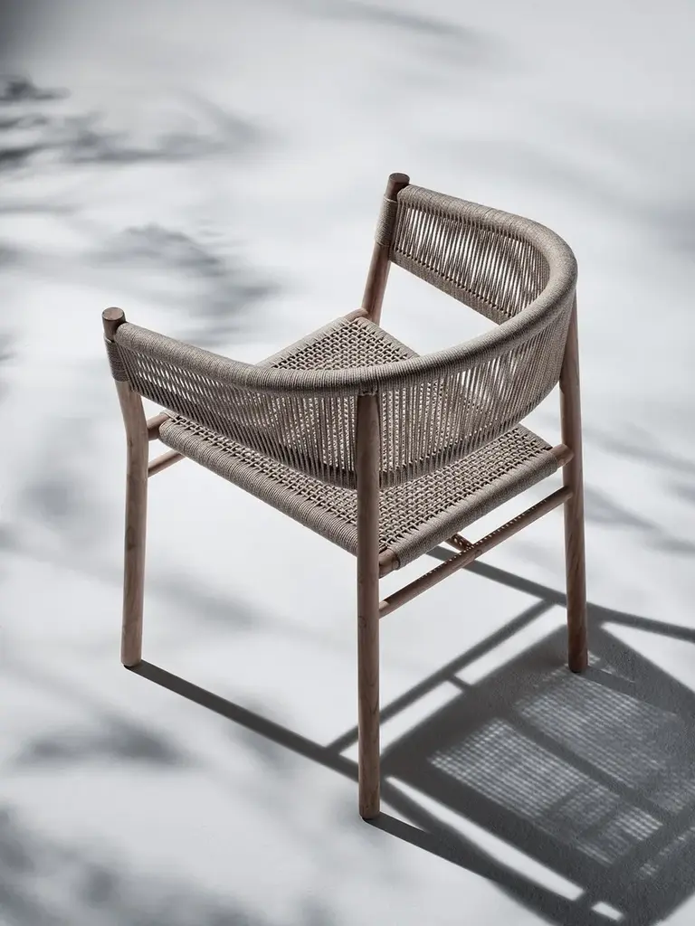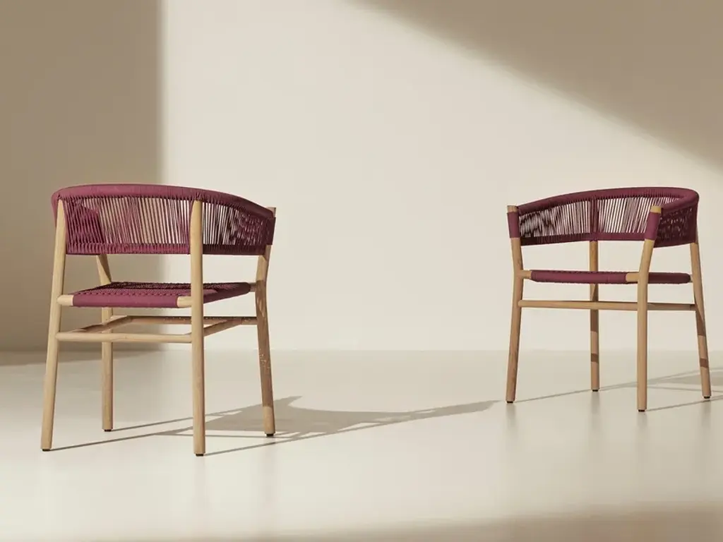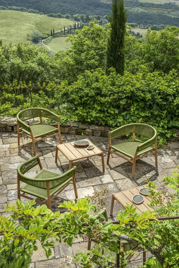 Kilt is a stackable rope and teak garden chair.One of the special characteristics of contemporary design is its ability to mix beauty and functionality in extremely simple furnishing accessories. Kilt, the chair conceived by Marcello Ziliani for Ethimo, springs from the desire to encapsulate the best qualities required by a design destined for the outdoors in one single product. ‘Kilt takes its cue from the image of the famous piece of fabric wrapped around the waists of the proud inhabitants of the Highlands – explains the designer Marcello Ziliani. - In the same way, the backrest is wrapped around the chair while remaining detached, like a skirt that leaves the knees bare’.Solidity, lightness and versatility are in fact the features that make this accessory ideal for enhancing outdoor spaces in a range of different residential and contemporary contract contexts. Kilt is stackable and meets all comfort needs: the use of a dense weave of rope to form the backrest and the chair ensures both optimum comfort as well as resistance to the elements. The collection comes in versions with frame in teak or in stainless steel, which makes Kilt a versatile product, capable of expressing different looks and interpreting its setting with uniqueness and without upsetting the balance of colour and aesthetics.Kilt is presented in two new versions to furnish outdoor spaces with personality and create unique settings through the use of colour.A blend of the elegant and the natural, the Kilt armchair in its Dining and Lounge version combines its distinctive FSC certified teak frame with new hues for its natural rope, reinterpreted in two vivid colours inspired by the warm shades of Mediterranean vegetation.Its dense weave in Olive Green and Ruby Wine evokes positive moods and good vibes, making Kilt both unique and simply beautiful.Kilt, the seating designed by Marcello Ziliani, available in versions with a teak or aluminum frame, is capable of expressing different looks and interpreting the space it inhabits. In the collection, the braided rope stretches its dense weave to embrace the grains of the teak. Ethimo and Marcello Ziliani reinterpret the material characteristics of the Kilt lounge and dining proposals to create a new maxi accessory dedicated to moments of outdoor relaxation. With the Kilt outdoor bed, the beautiful season comfortably settles by the poolside, in the garden, on the terrace, at the beach, or in a metropolitan solarium. The warmth and purity of natural teak, the soft and delicate shade of the rope, and the harmony of the design make it the ideal solution to enhance a variety of settings, meeting any style and furnishing needs. The FSC-certified teak and natural fiber express the green soul of this furniture, confirming the ongoing dialogue between design and nature that has always defined Ethimo's projects.