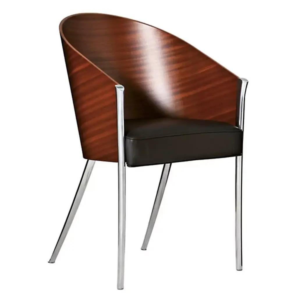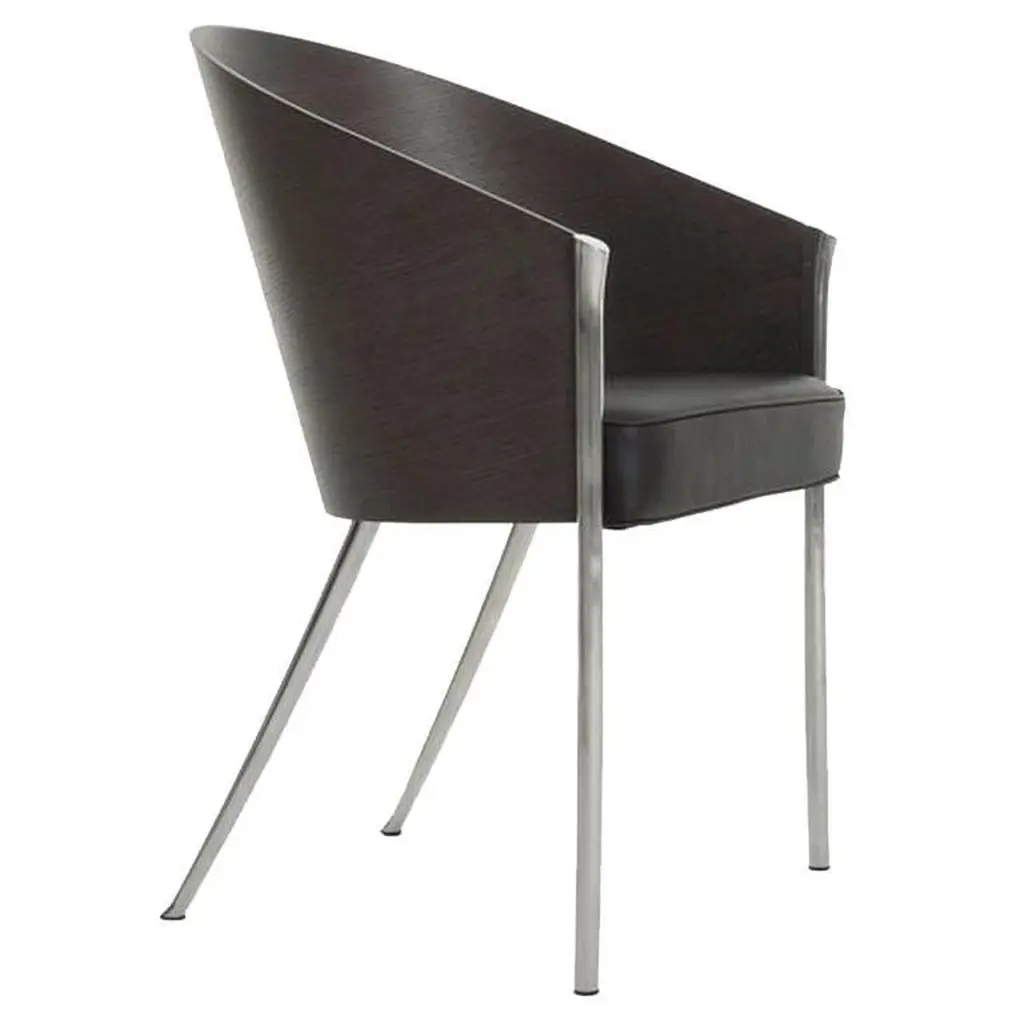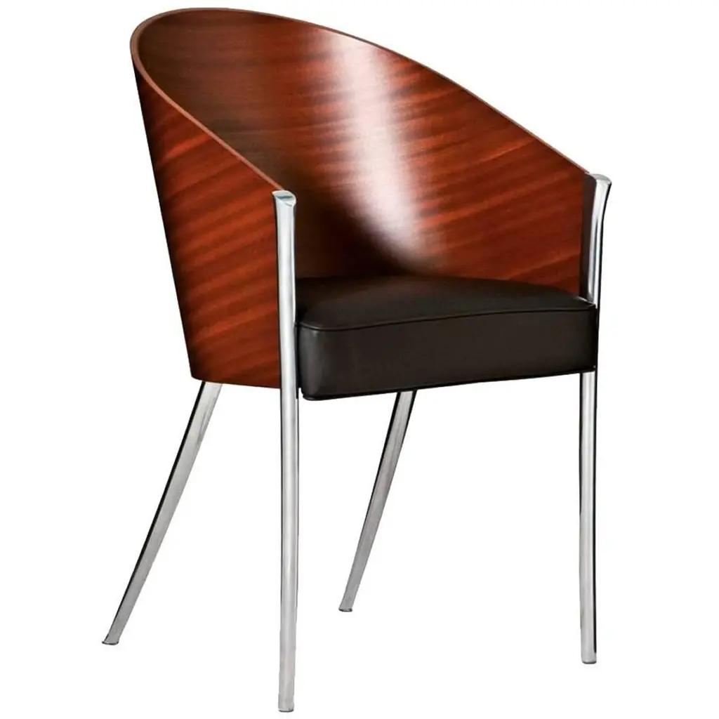 Made in Italy. Designed with a sleek and masculine profile, the King Costes Chair's minimal silhouette enables it to be a design versatile piece suitable for a variety of situations. Whether it's used in the dining room or the home office, the modern armchair brings an element of elegance to any space because of its rounded, wood finished shell, padded leather seating, and polished aluminum leg details. Available in multiple shell finishes, finding the right chair couldn't be easier.