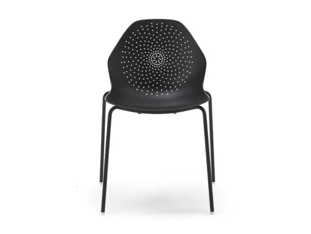 The Klera chair features a total black aluminum design with a four-legged steel frame. Its sleek, all-black aesthetic combines with a sturdy steel frame for a modern and sophisticated look. Ideal for contemporary interiors, the chair offers both durability and style, making it a versatile addition to any modern space.