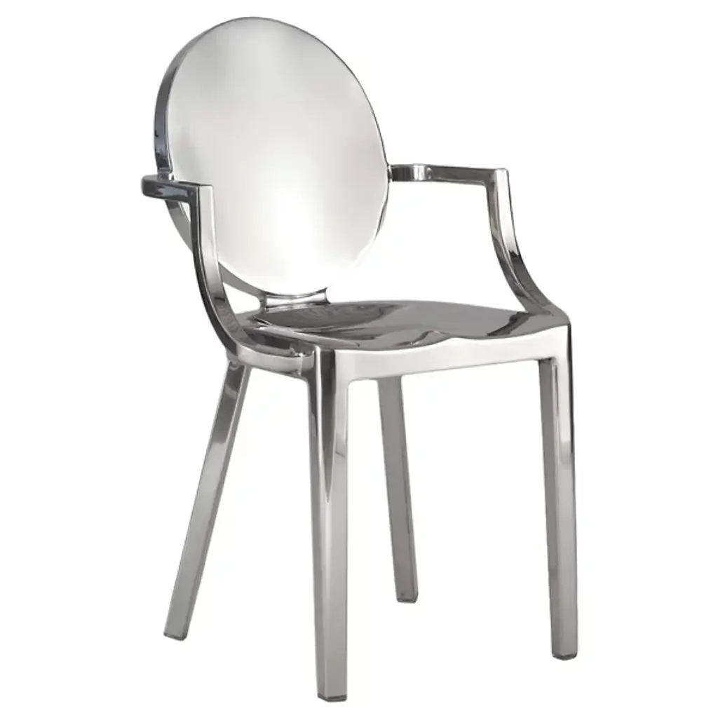 Feel like one of the beautiful people in a Kong Armchair by Emeco. The original was designed to let super models gracefully sit down or slide out. Featuring an elegant rounded backrest, scooped armrests and a contoured seat, it's iconic and inviting contemporary furniture for a chic dining area, living space or office. This Philippe Starck design is hand-welded of recycled aluminum and available in brushed or polished finishes for a sturdy, stylish chair.