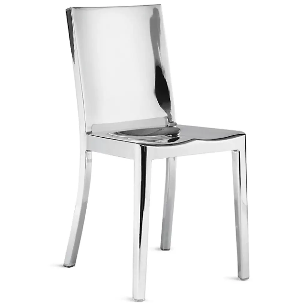 Stylishly dine and socialize in a stunning Kong Chair by Emeco. The original was designed by Philippe Starck for a trendy restaurant in Paris frequented by super models. Virtually indestructible, this iconic furniture is handcrafted by welding 24 pieces of recycled aluminum together. Hours of hand-polishing result in a sleek contemporary finish. Featuring a round backrest and thoughtfully placed contouring, here's chic, comfortable seating for the kitchen, dining room or office.