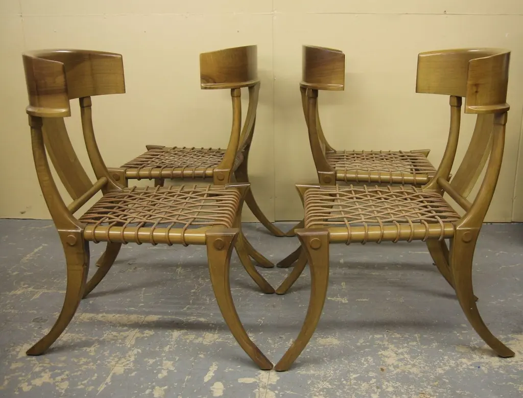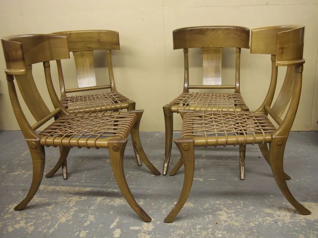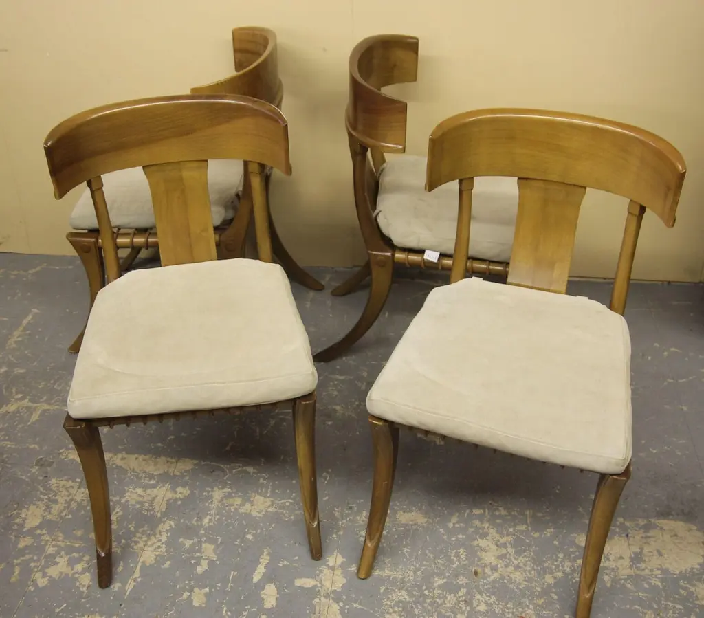 Pleased to offer this great set of 4 Klismos chairs. This classic dining chairs are in great shape and retain their original signed suede seat cushions. Could also work as side chairs throughout the house.