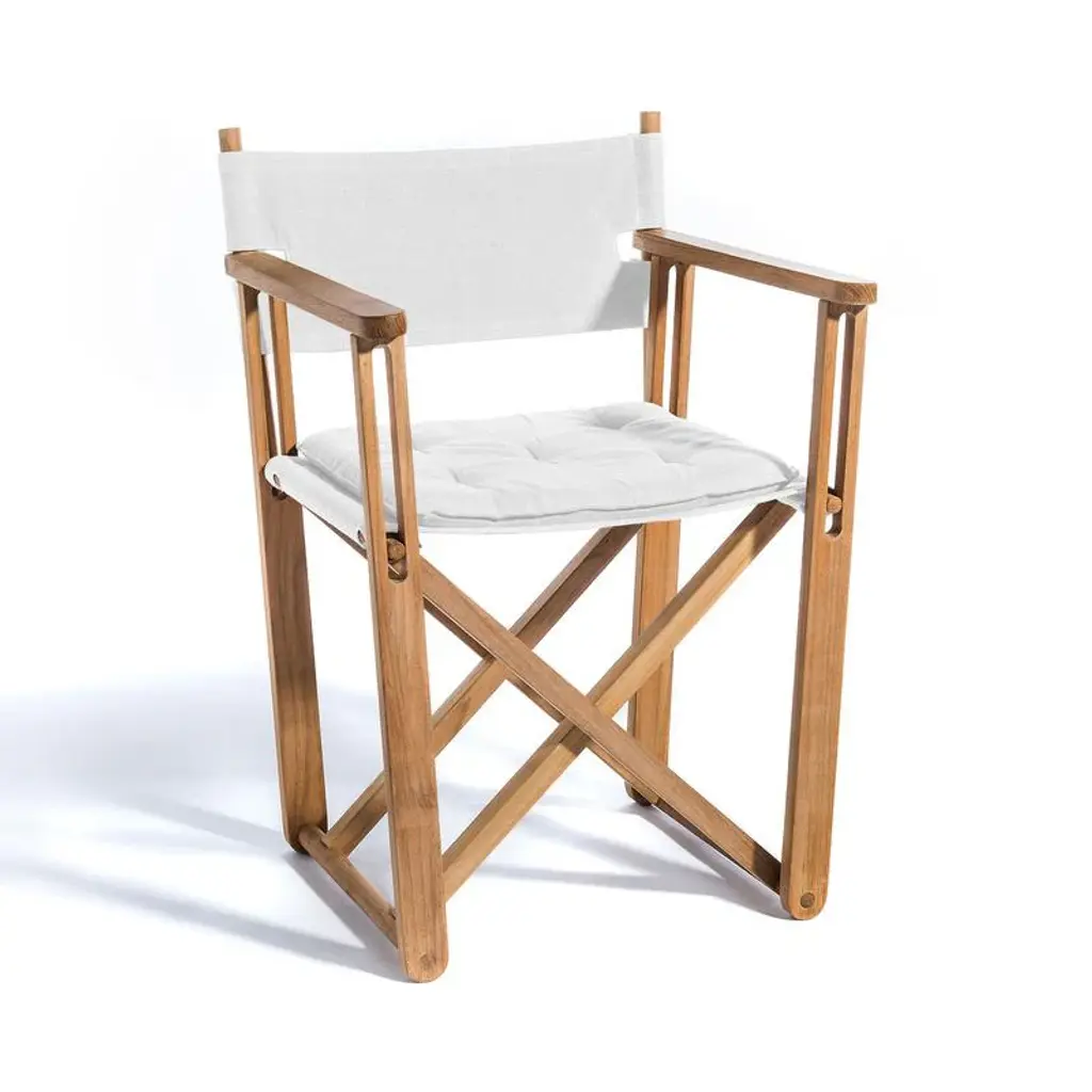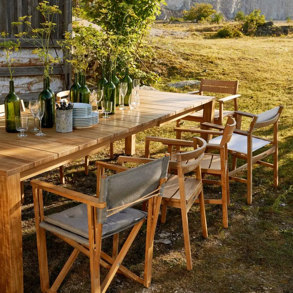 A dining chair that is as beautiful as it is effortless, the Kryss Dining Chair from Skargaarden offers incredible detailing and comfort for both indoor and outdoor use. Designed in teak, with high-quality cushions in both canvas and Sunbrella fabrics, the outdoor version is made to endure both the sun and the rain for worry-free use al fresco. Originally designed for a roof terrace on the Swedish Embassy in Cairo in 1975, this chic seat folds up in seconds for easy storage or transport from indoor dining room to outdoor lounge area. Features