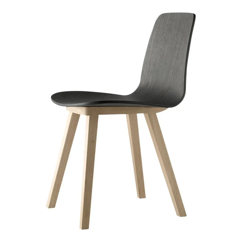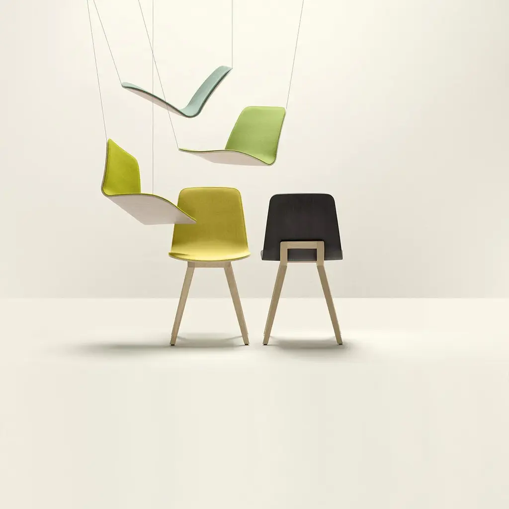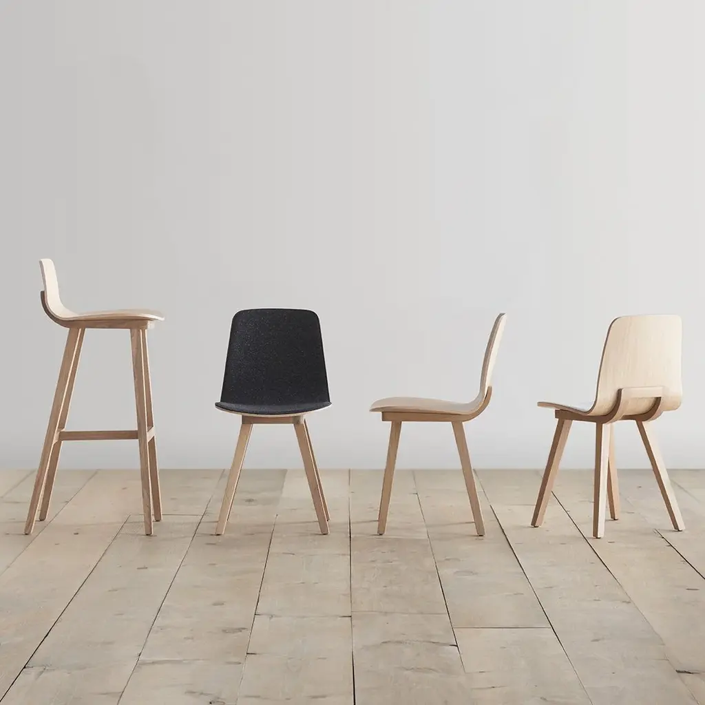 The Kuskoa chair is composed of a delicate upholstered or wood shell resting in oak wood trestle. The shell can be in leather, both sides covered in wool or back in wood, front in wool or leather.