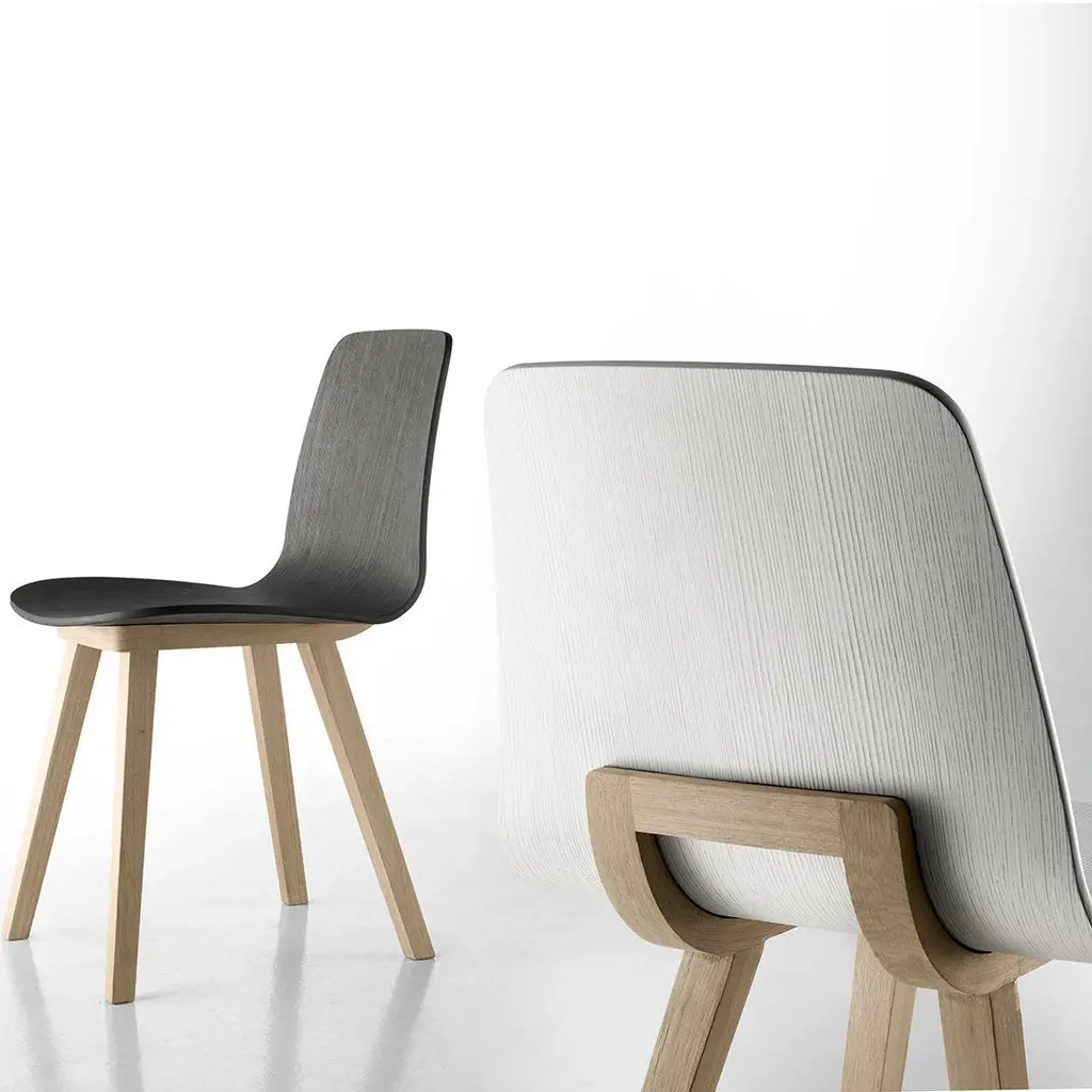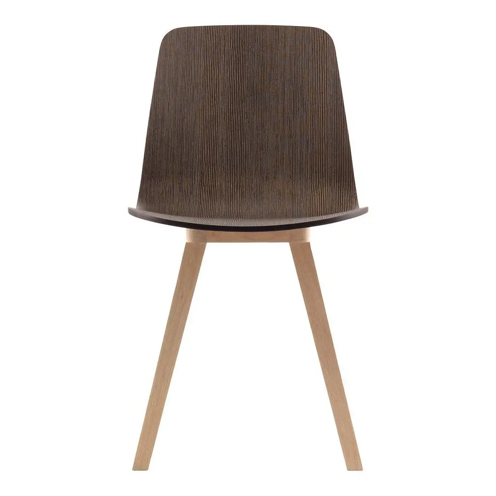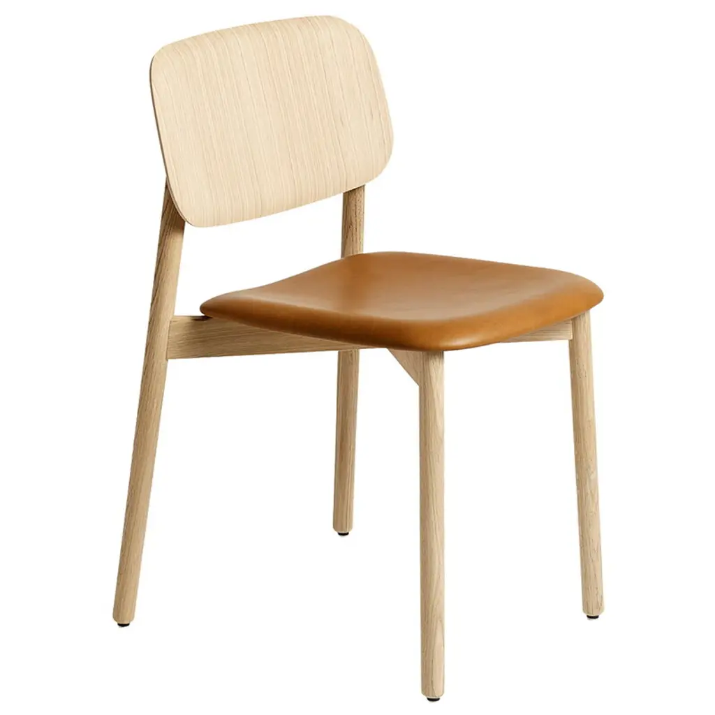 The Kuskoa chair is composed of a delicate upholstered or wood shell resting in oak wood trestle. The shell can be in leather, both sides covered in wool or back in wood, front in wool or leather.