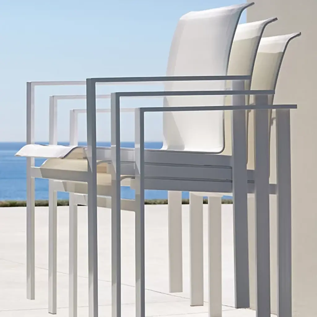 Introduce a touch of contemporary design to your dining space with the KWADRA Outdoor Dining Arm Chair - Set of 2 from Sifas. This chair offers a unique blend of style and functionality, beautifully crafted from lacquered aluminum for a sleek aesthetic that promises to endure. Accented by canvas woven polyester, this dining armchair enhances the sitting experience, providing a superb balance of comfort and durability. Perfect for any modern dining room or kitchen space.