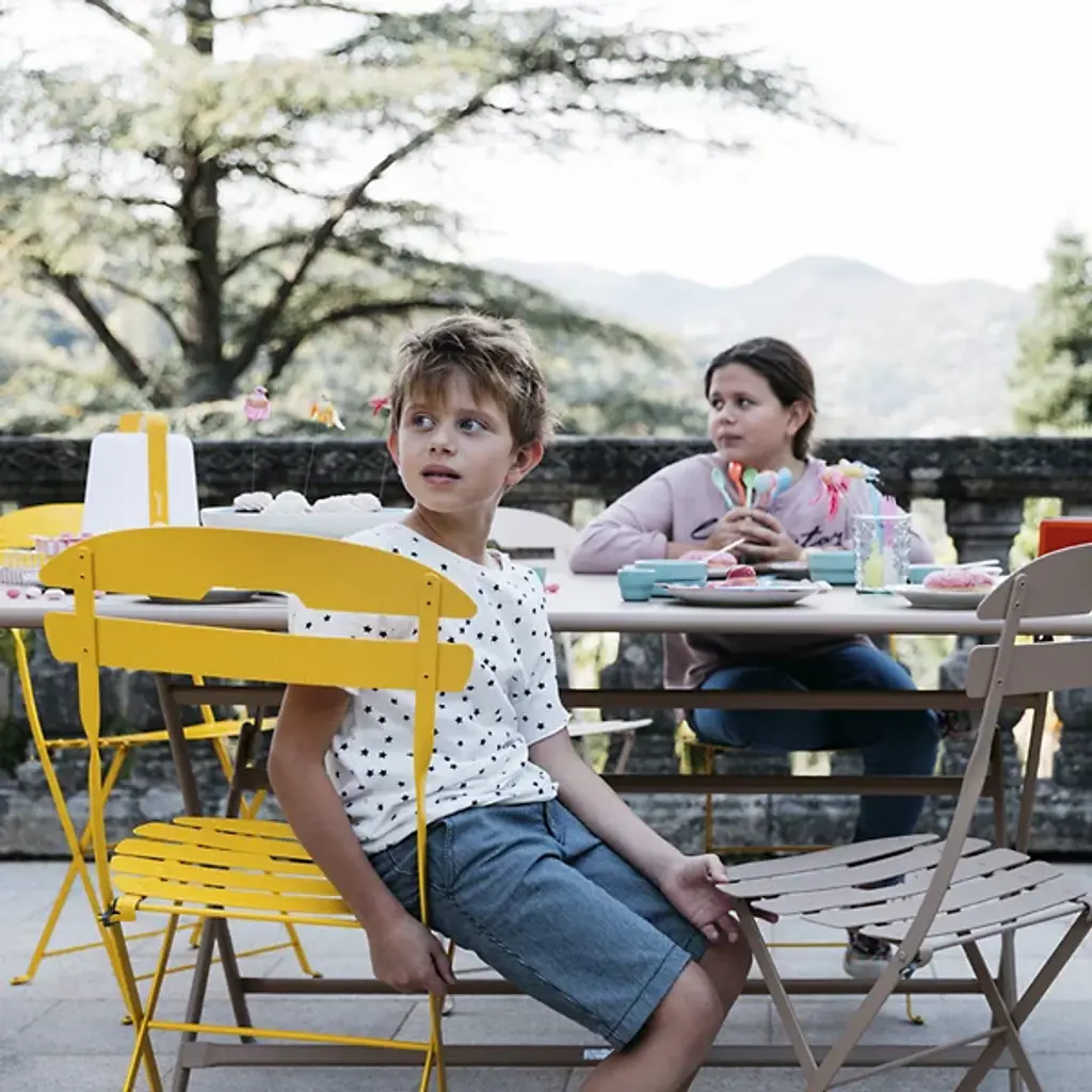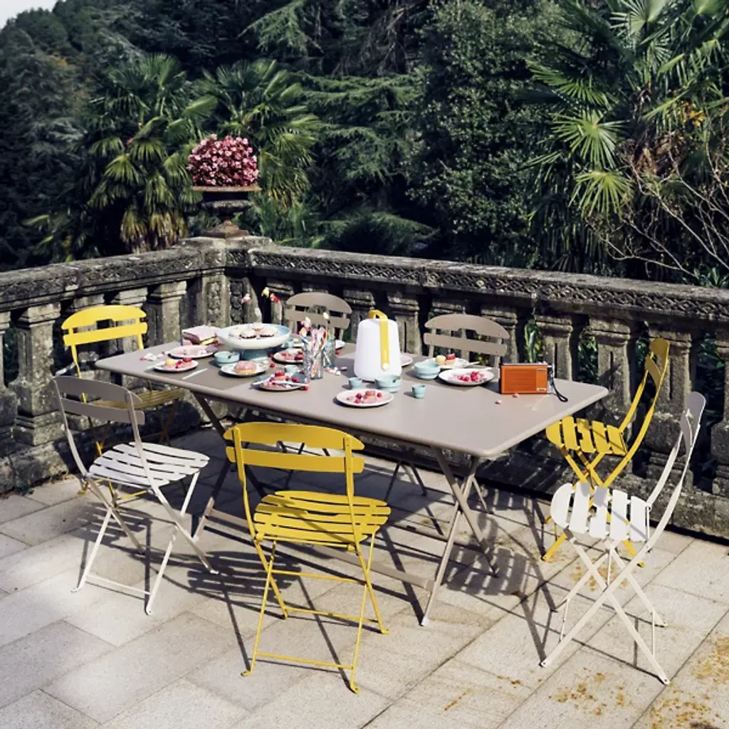 Dine outside with a friend in the La Mome Side Chair, Set of 2 by Fermob. Curved slats are made of steel to be comfortable and durable. Features a nifty handle that can be used to fold and unfold the table making it easy to store and transport. Available in an assortment of colorful Fermob colors that will be sure to please.