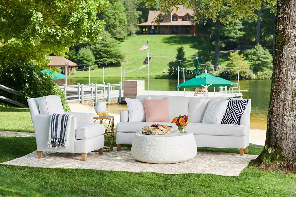 Exclusive to One Kings Lane: This style features an elegant track arm making it a perfect fit for any outdoor aesthetic. It is upholstered in an eco-friendly UV high-performance fabric which repels stains, spills, bacteria, and mold. Constructed of marine grade birch and teak, an outdoor slat suspension system, and reticulated foam cushions featuring an open cell foam which allows the water to drain ensures comfort and easy maintenance. Each style includes a custom outdoor cover constructed of heavy duty canvas with elastic at the bottom to ensure a proper and snug fit. Each piece is handcrafted by skilled artisans in High Point, NC.