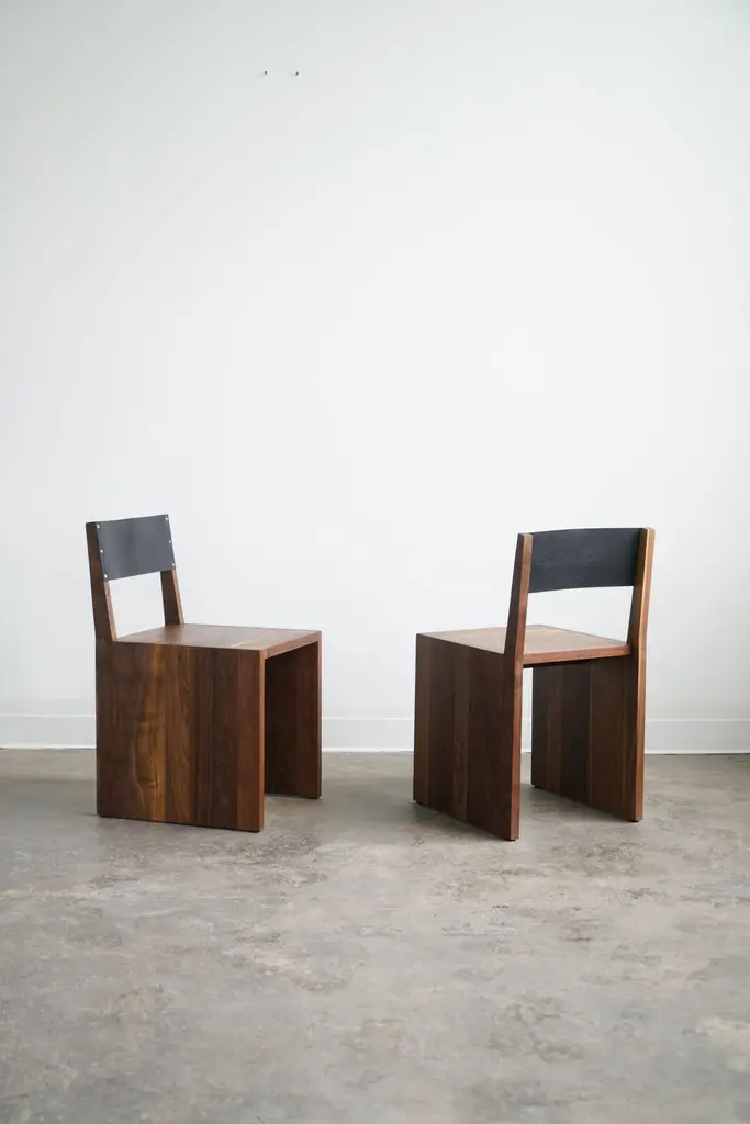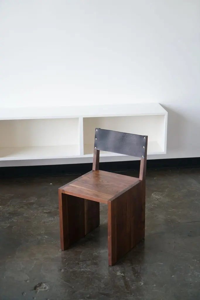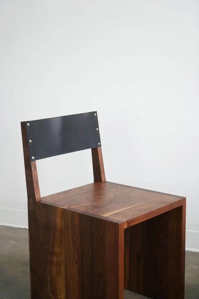 A minimalist dining or side chair from the Last Workshop.Solid walnut, black leather, brass screws.Dimensions: 18”L x 20”D x 18” seat height.2 in stock.